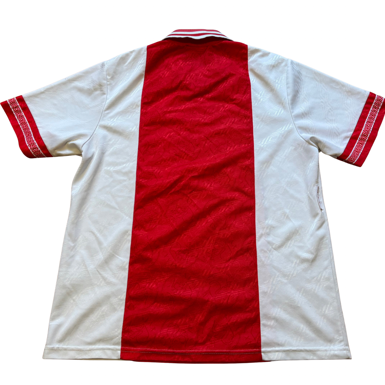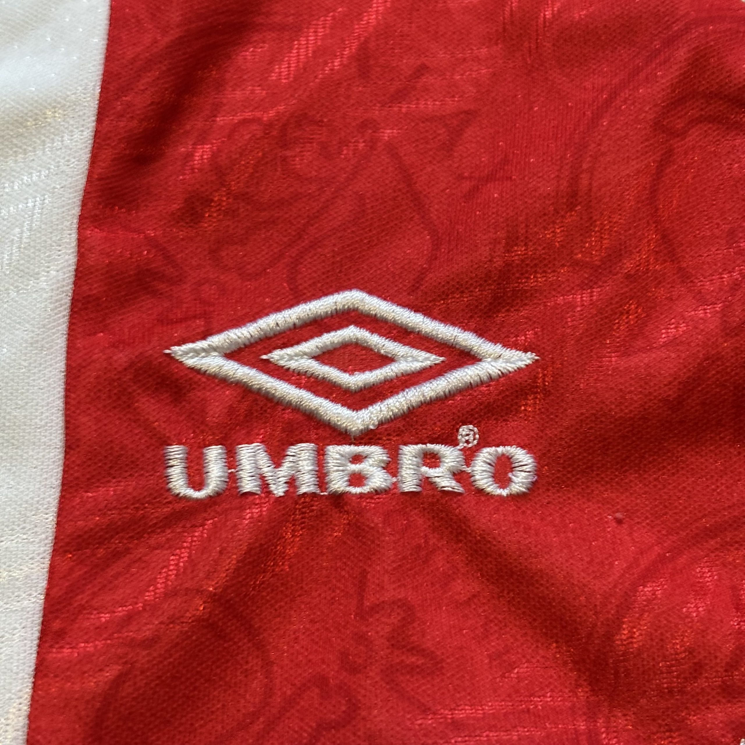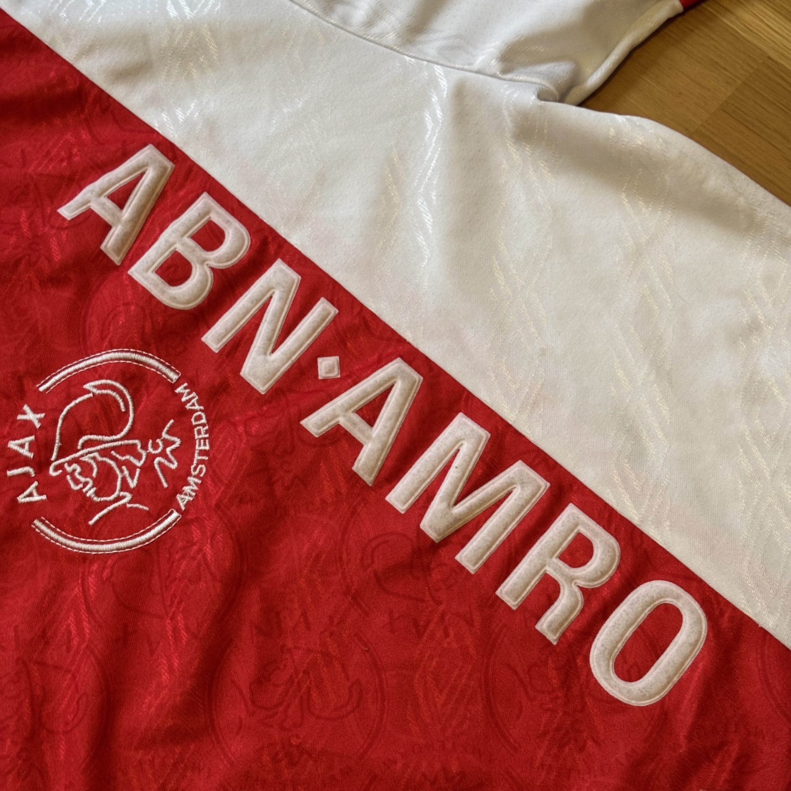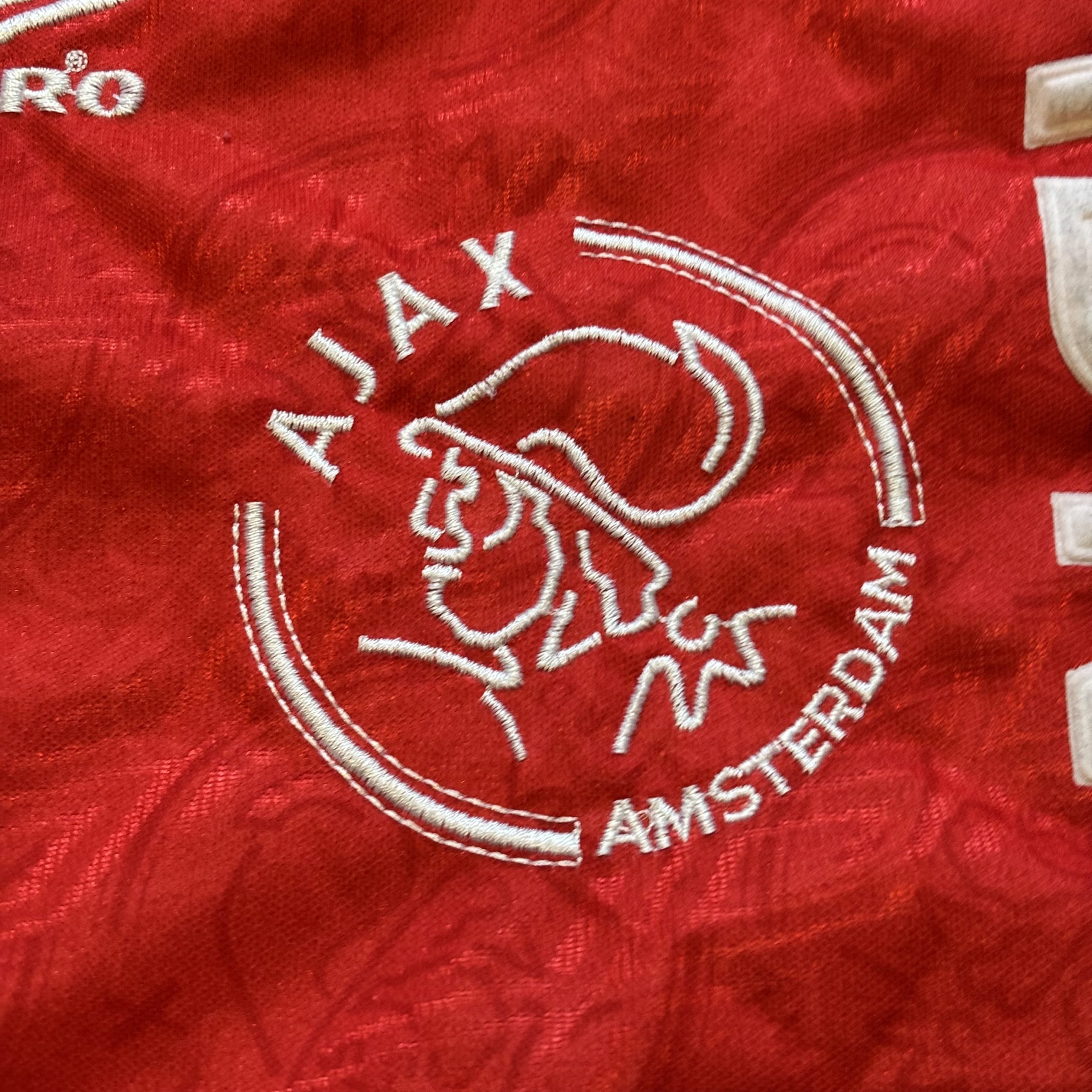 Camiseta local del AFC Ajax utilizada en la temporada 1994-1995, fabricada por Umbro con el clásico diseño blanco y franja central roja, incorporando tejido jacquard con motivos del club y patrocinador ABN AMRO en vertical. Con este modelo, el Ajax firmó una de las mejores temporadas de la historia del fútbol europeo, proclamándose campeón de la Champions League 1994-95 de manera invicta y ganando también la Eredivisie, culminando un curso absolutamente dominante bajo la dirección de Louis van Gaal.