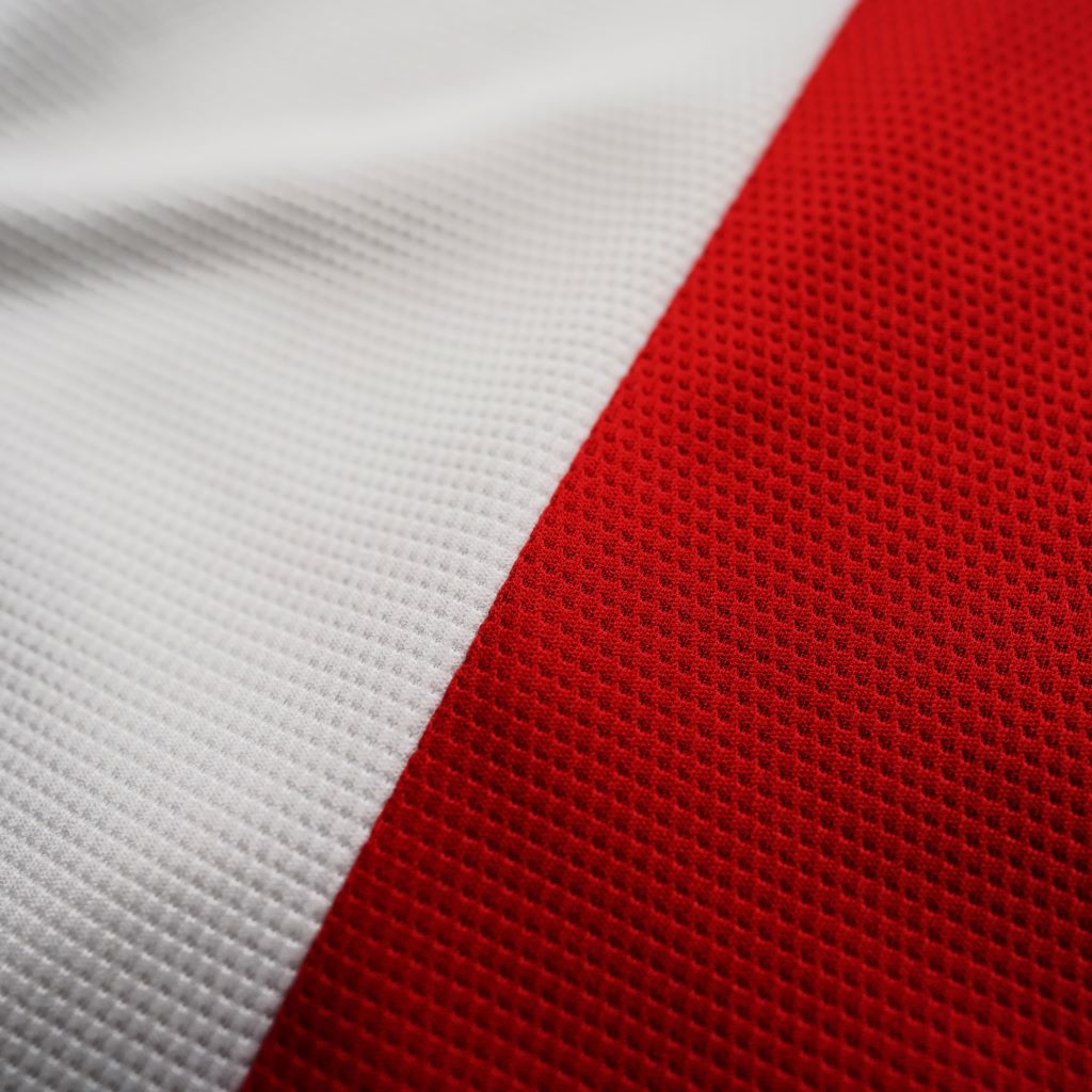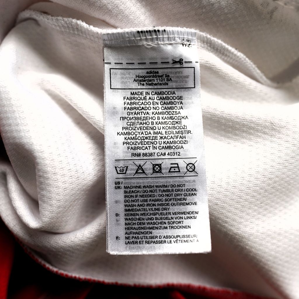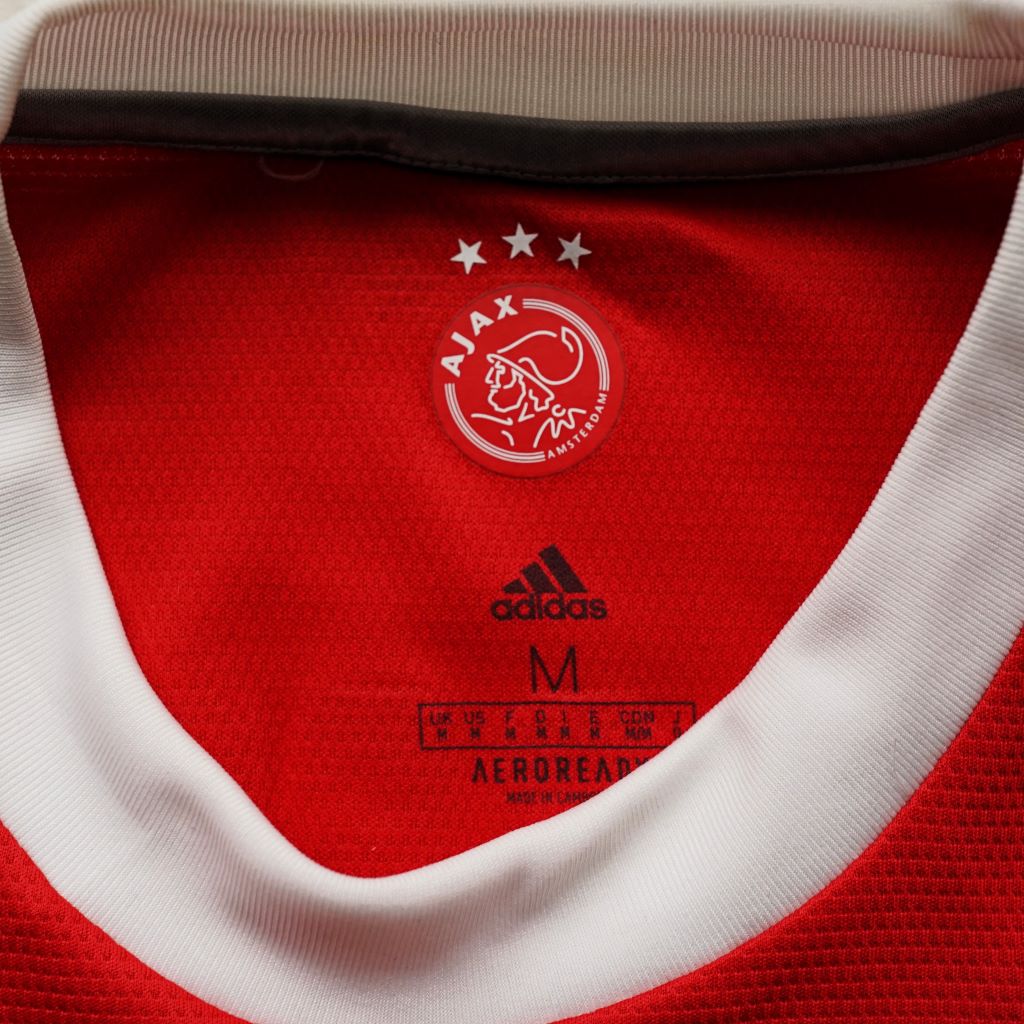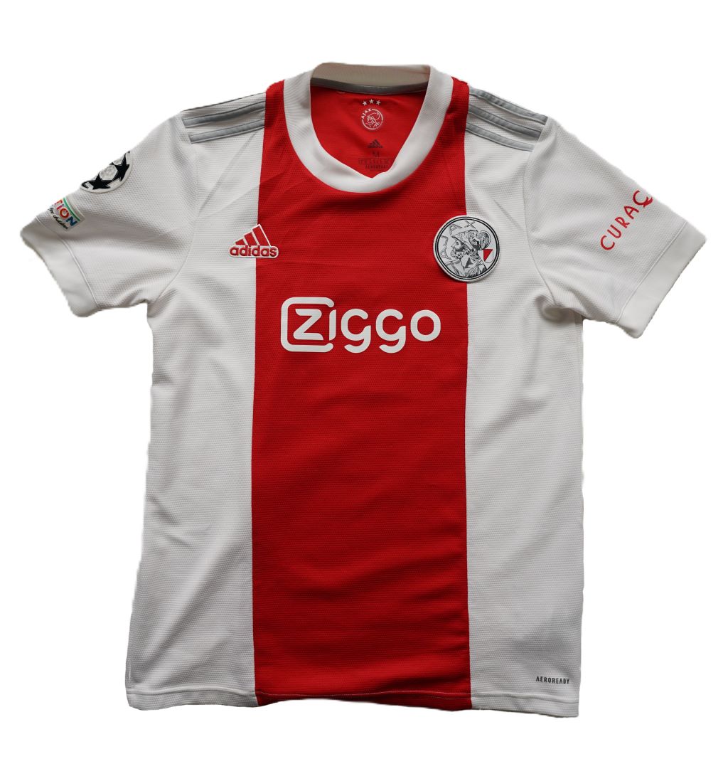 Camiseta local del Ajax para la temporada 2021-2022, fabricada por Adidas. Mantiene el icónico diseño con franja roja central sobre fondo blanco, pero con detalles en plateado y un escudo monocromático especial. Incluye el patrocinador Ziggo en el pecho y el logo de Curacao en la manga. En esta temporada se proclamó campeón de la Eredivisie,  llegó hasta la final de la KNVB Beker que perdió ante el PSV y en la Champions League cayó eliminado en los octavos de final por el Benfica tras haber ganado los seis partidos de la fase de grupo.