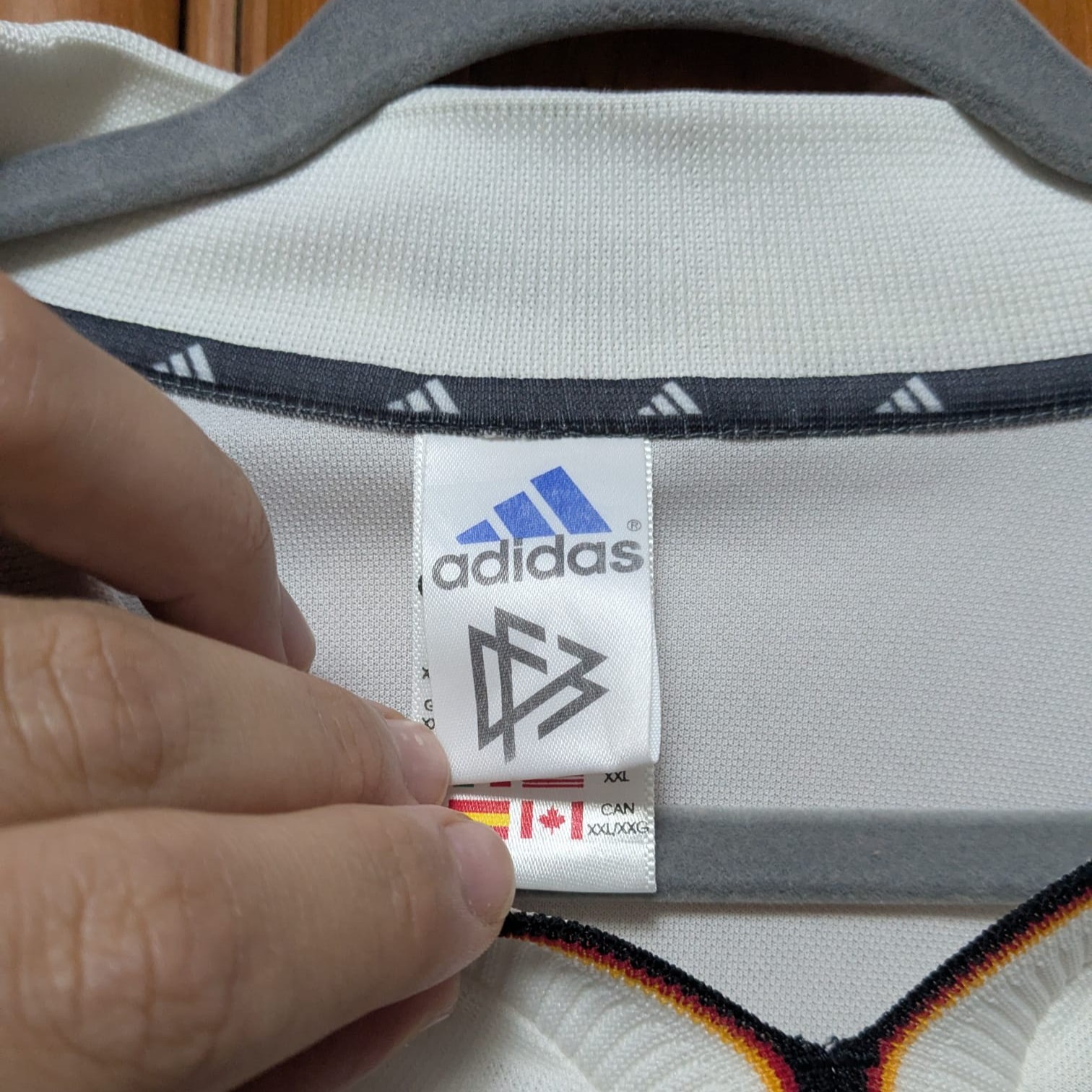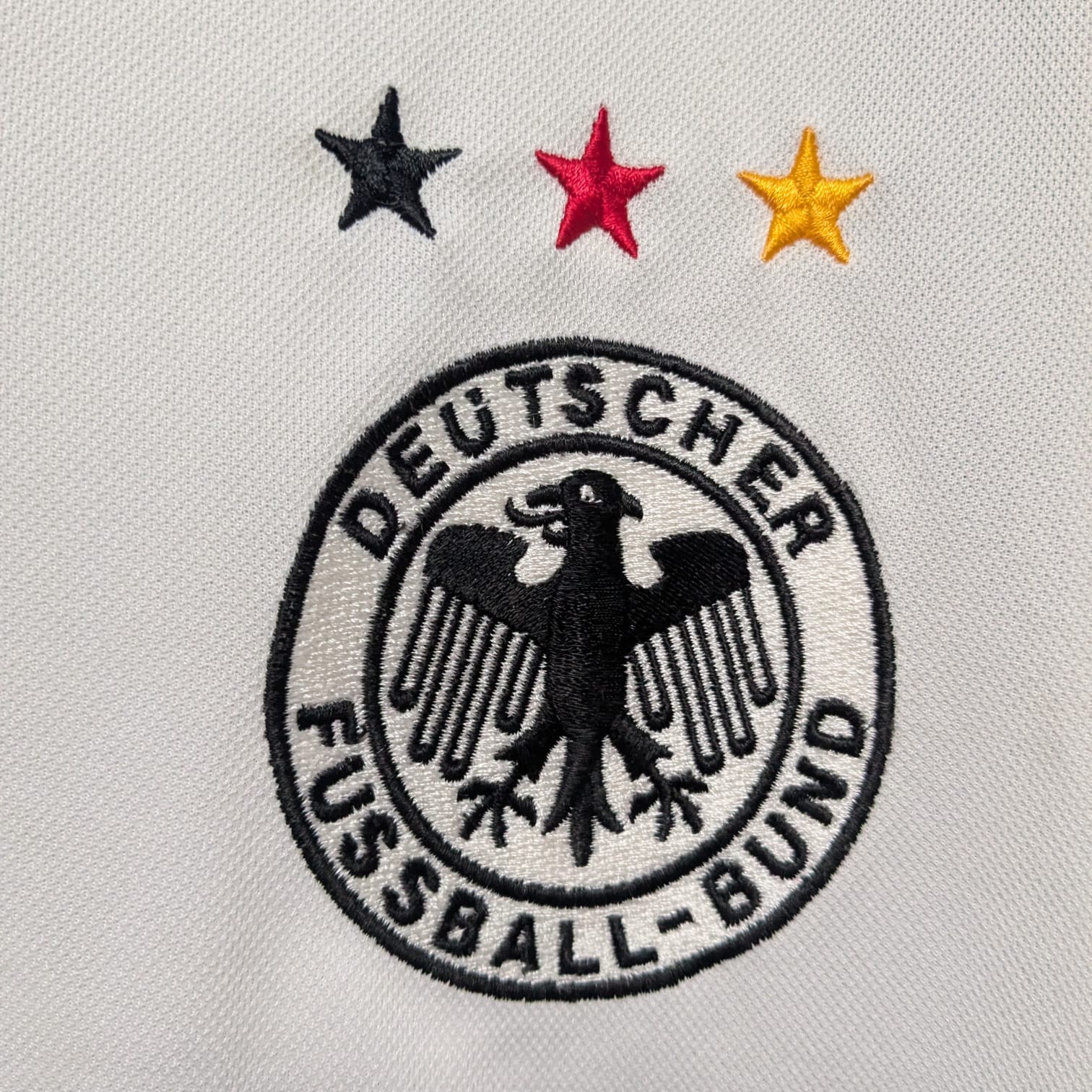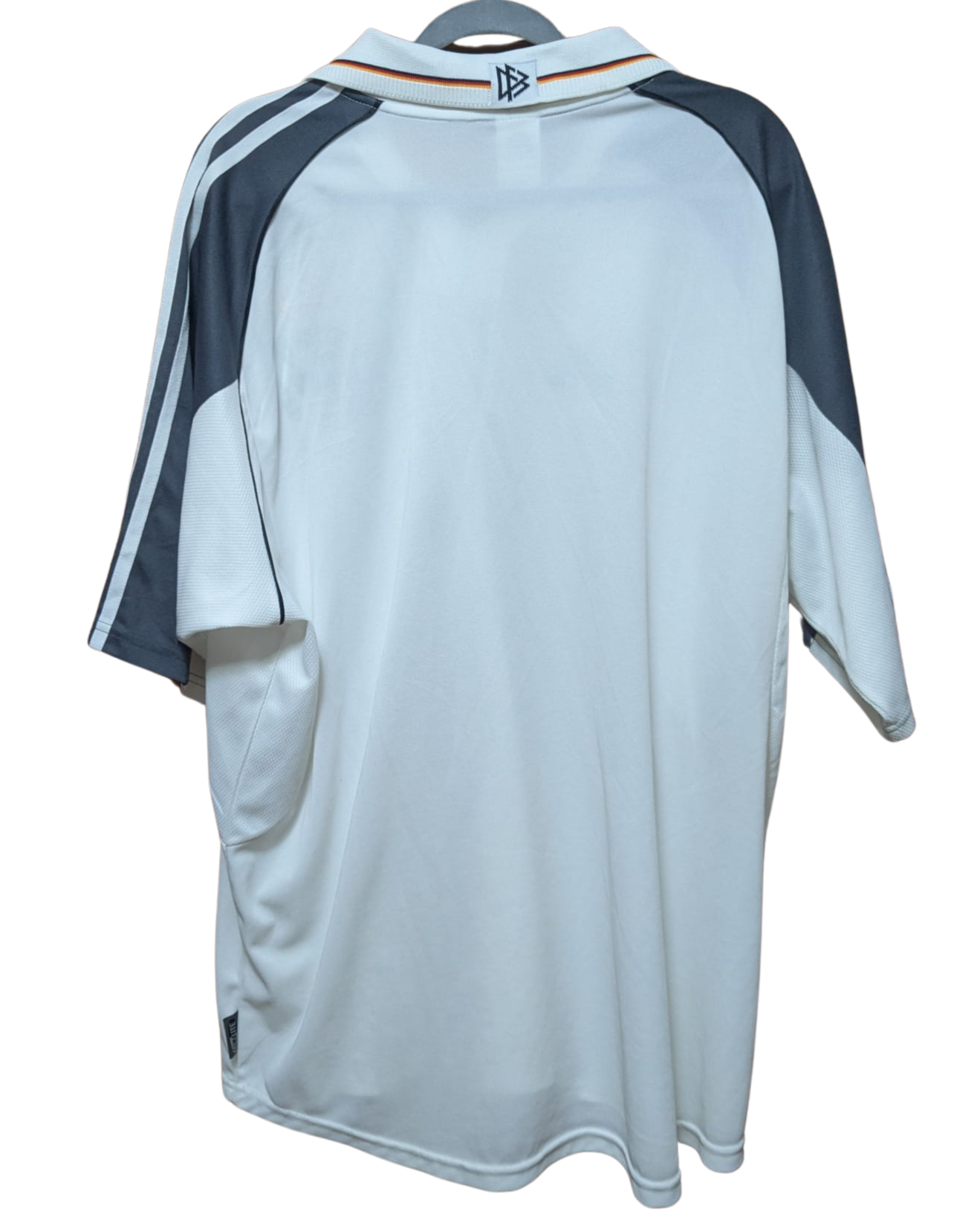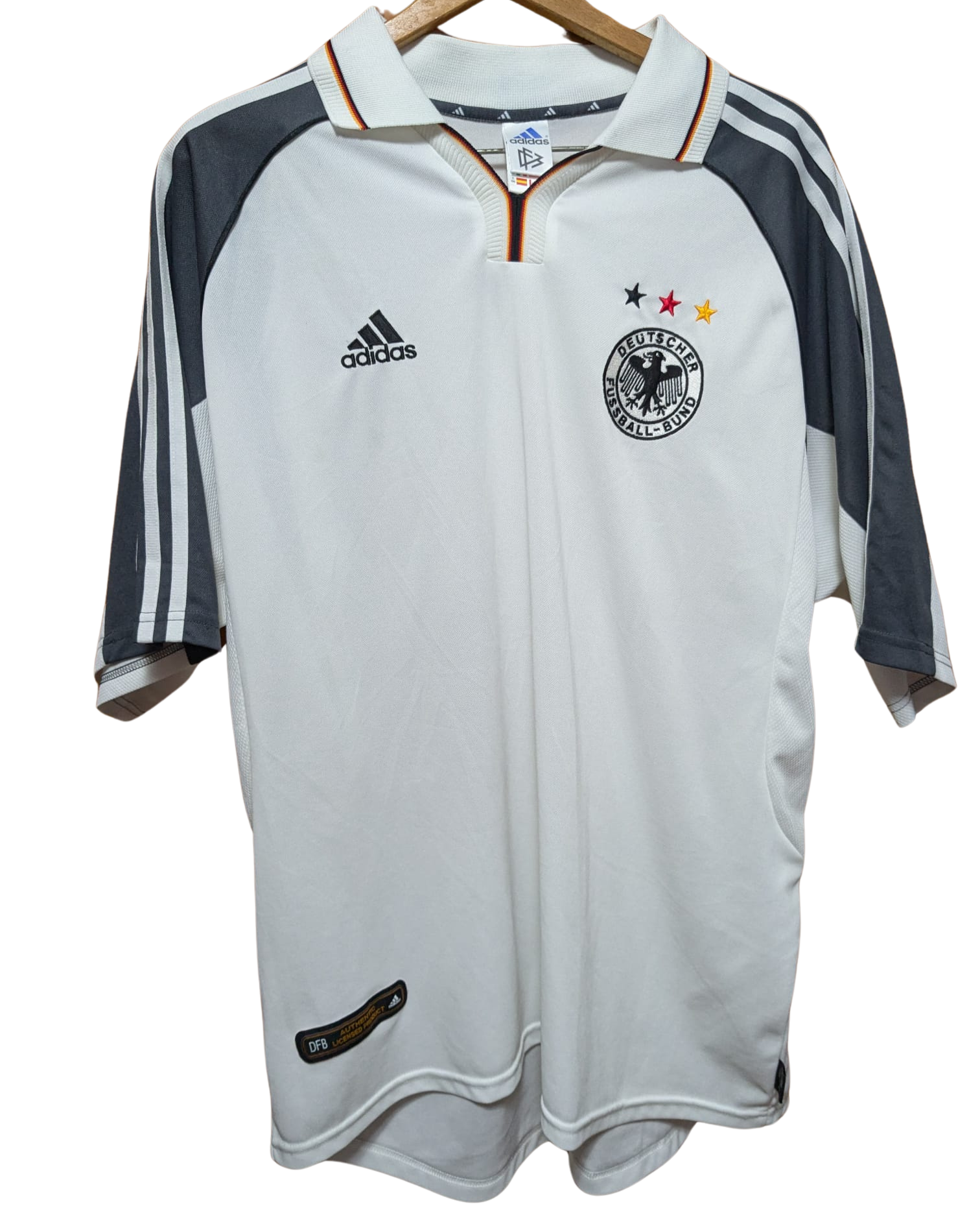 Camiseta local de Alemania para la Euro 2000, fabricada por Adidas. Blanca con detalles en negro y gris, luce un diseño sobrio y tradicional que incluye las tres estrellas sobre el escudo, en referencia a los títulos mundiales conquistados hasta ese momento.