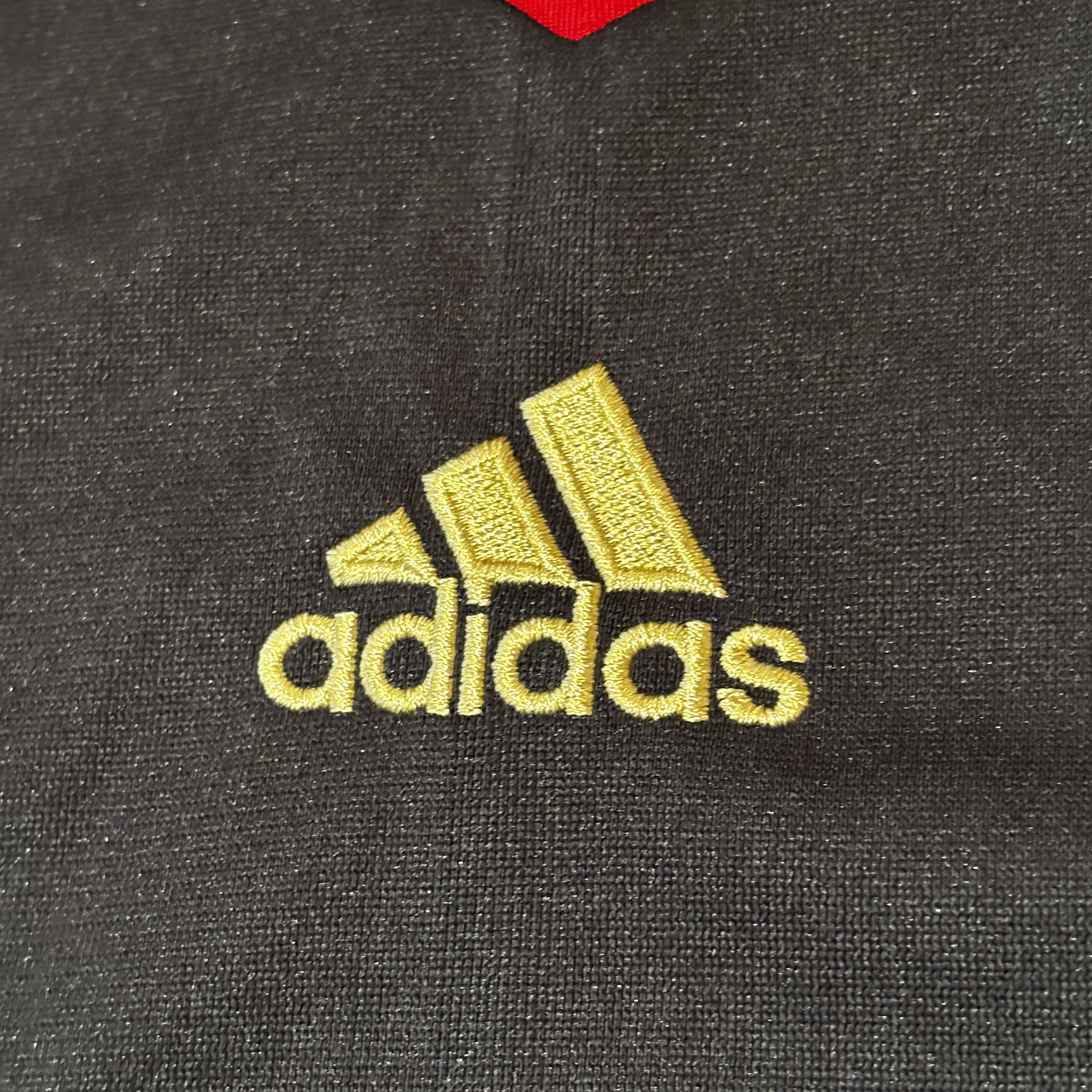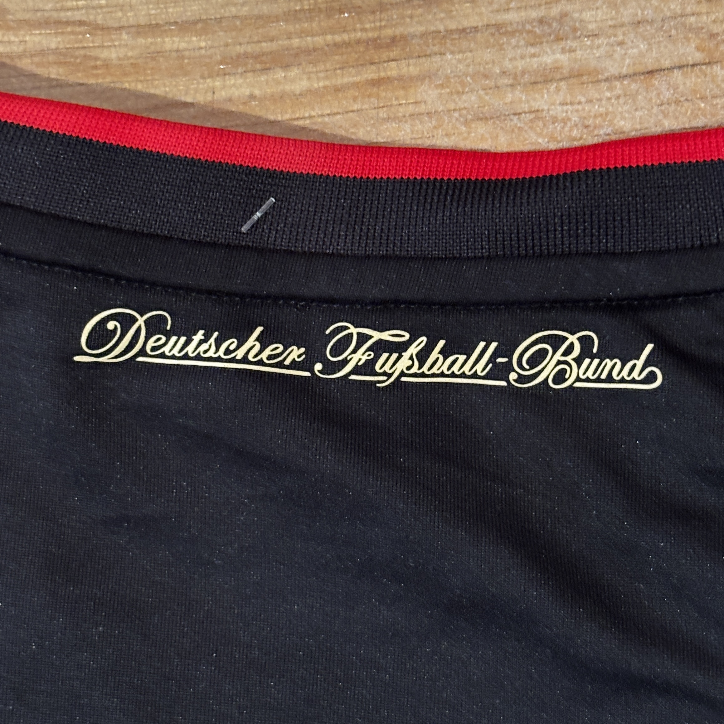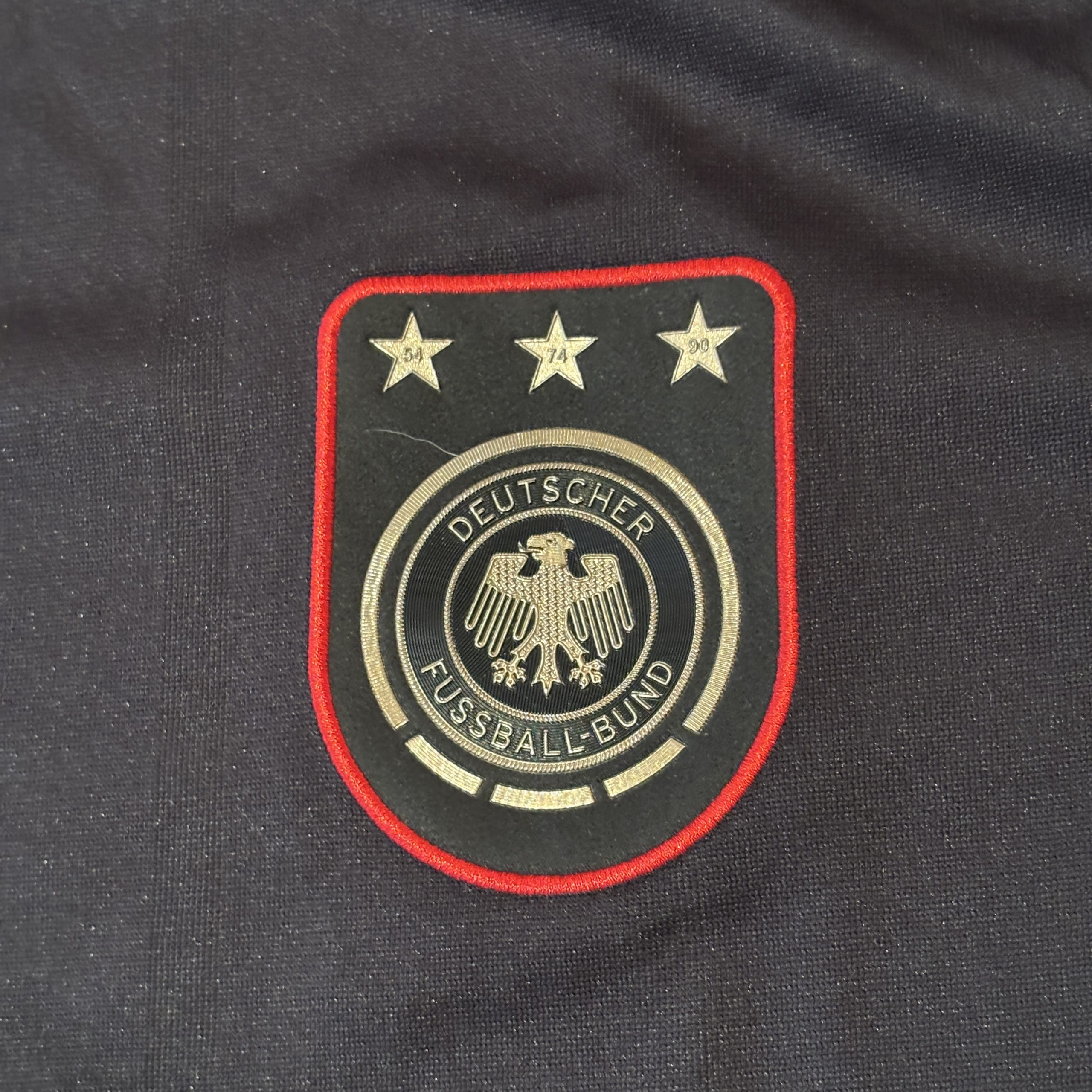 Alemania vistió esta camiseta visitante de Adidas durante el año 2010, en el Mundial de Sudáfrica. De color negro con detalles dorados y rojos, combinaba elegancia y sobriedad. Con ella, el equipo de Joachim Löw alcanzó las semifinales del torneo, destacando por su fútbol ofensivo y su joven generación de talentos.