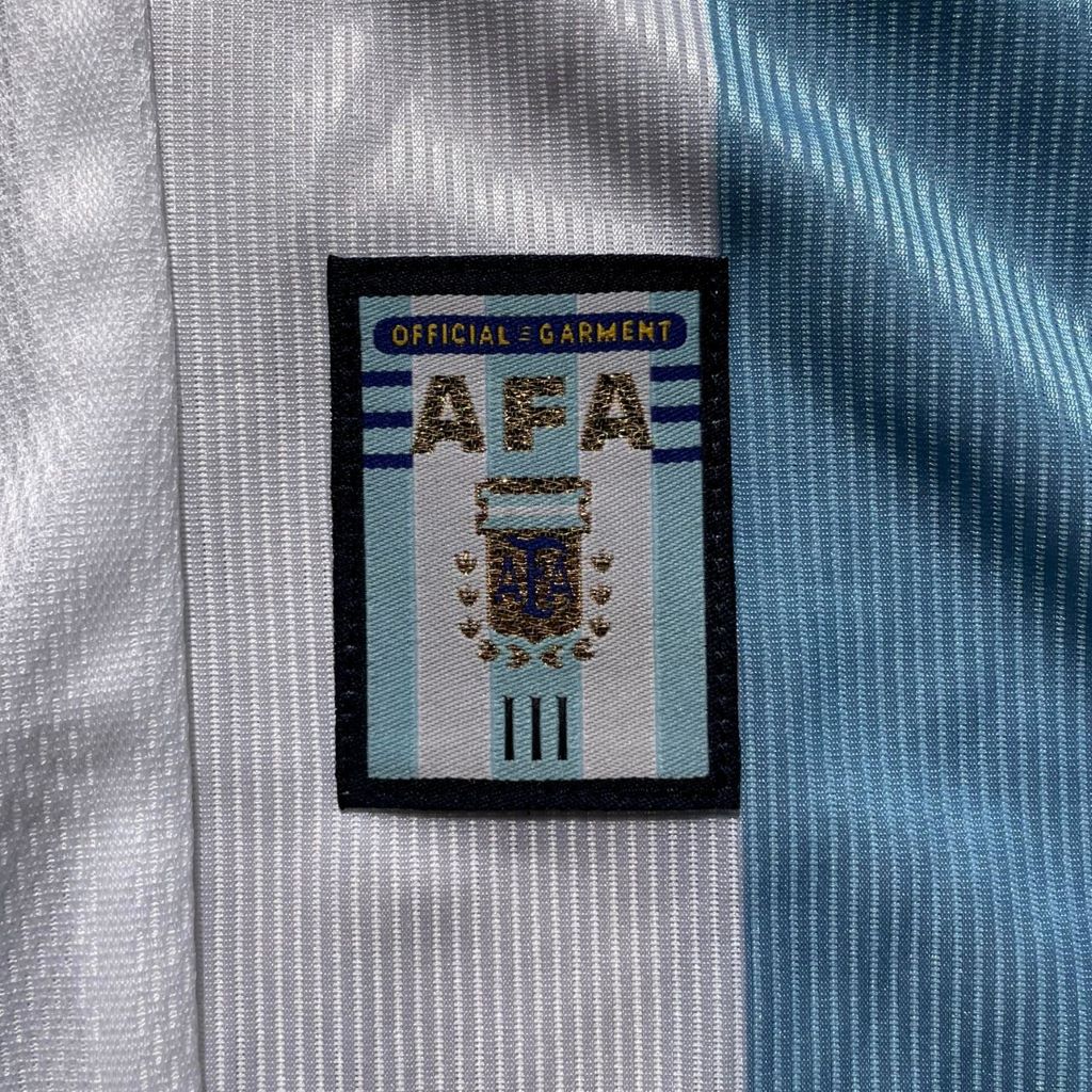 Camiseta local de Argentina para el Mundial de Francia 1998, fabricada por Adidas. Diseño con las tradicionales franjas celestes y blancas, con detalles en negro en el cuello y hombros. Usada en la Copa del Mundo, donde Argentina llegó a cuartos de final.