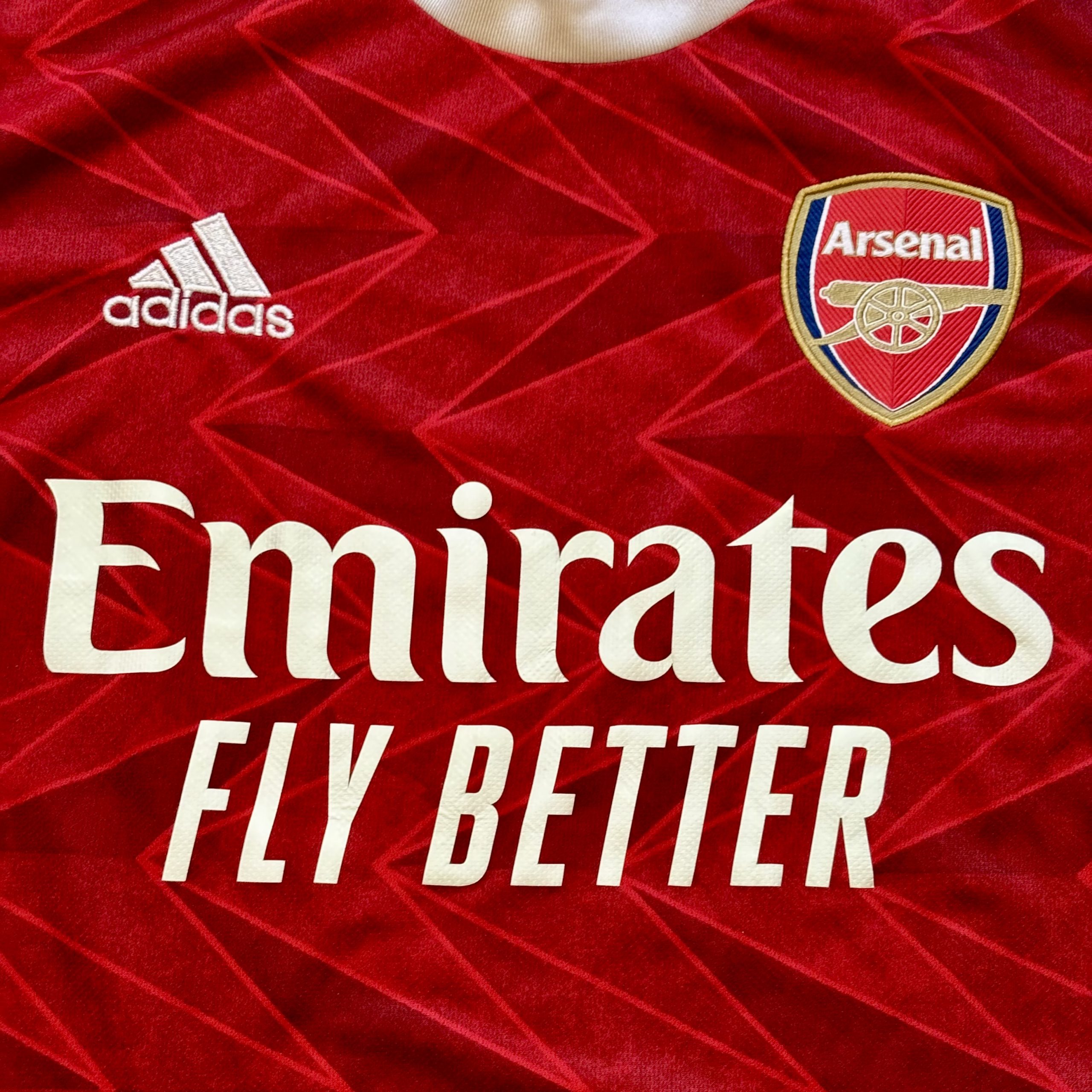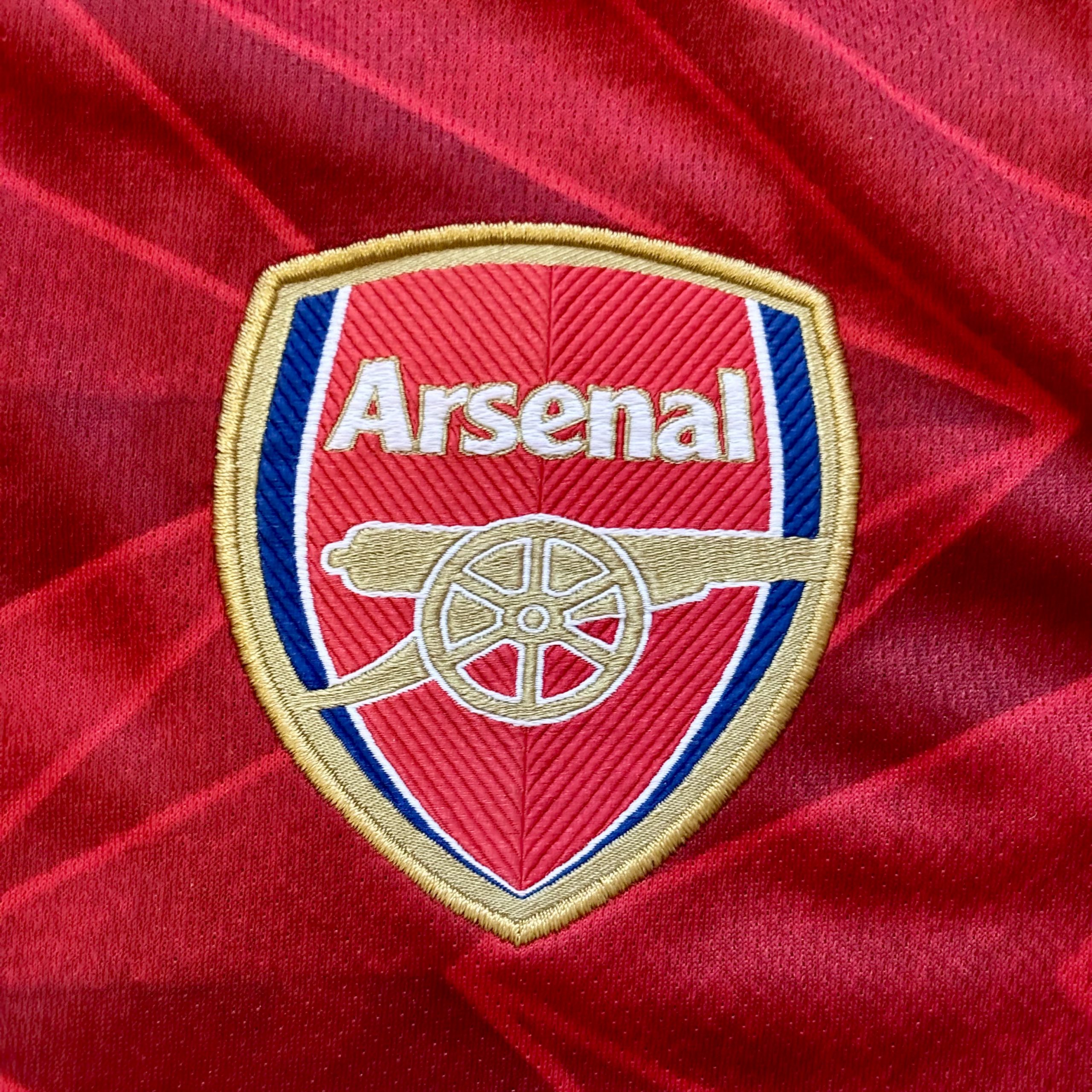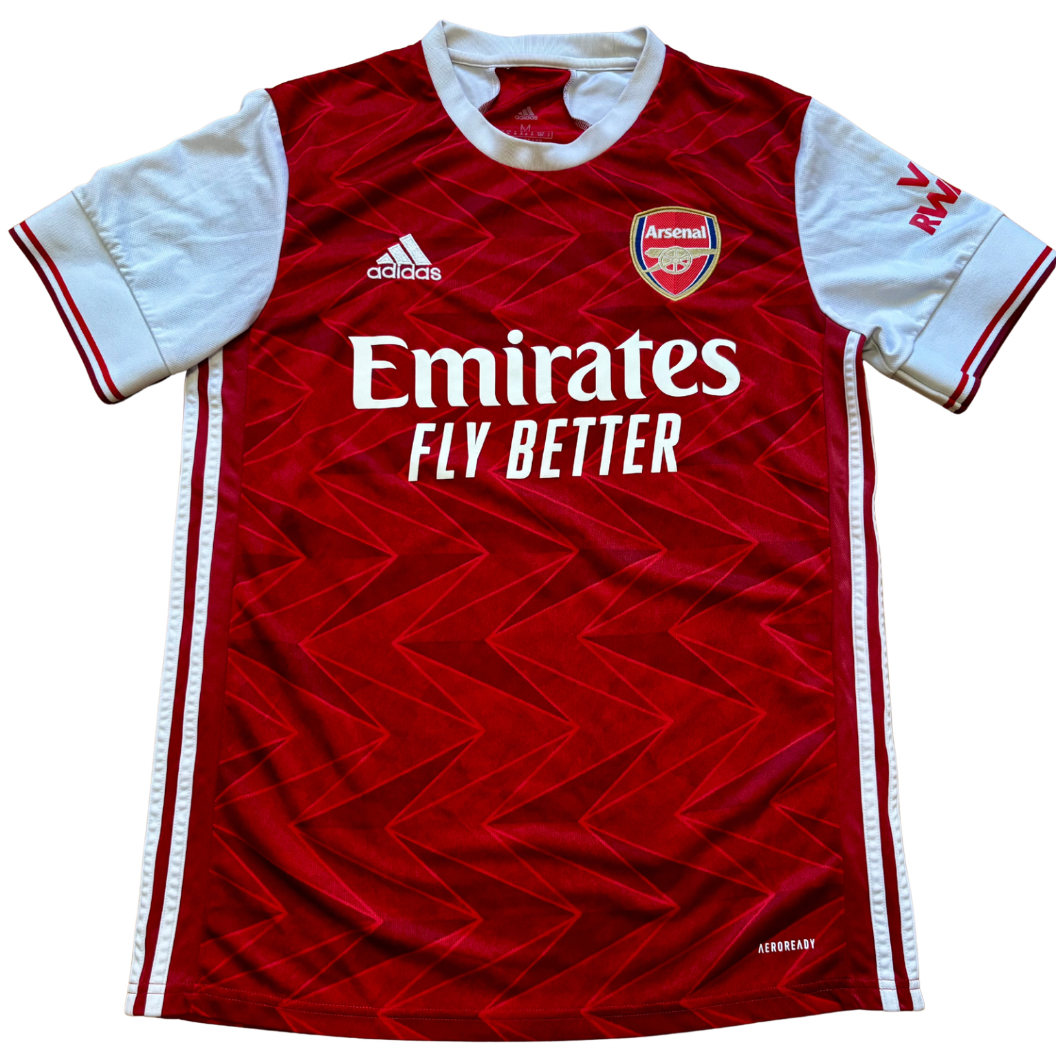 Camiseta local del Arsenal FC utilizada en la temporada 2020-2021, diseñada por adidas con el clásico cuerpo rojo y mangas blancas, incorporando un patrón geométrico tonal inspirado en la iconografía histórica del club. Con este modelo, el Arsenal finalizó 8.º en la Premier League, alcanzó las semifinales de la UEFA Europa League y conquistó la Community Shield 2020, cerrando un curso irregular en liga pero con presencia competitiva en Europa.