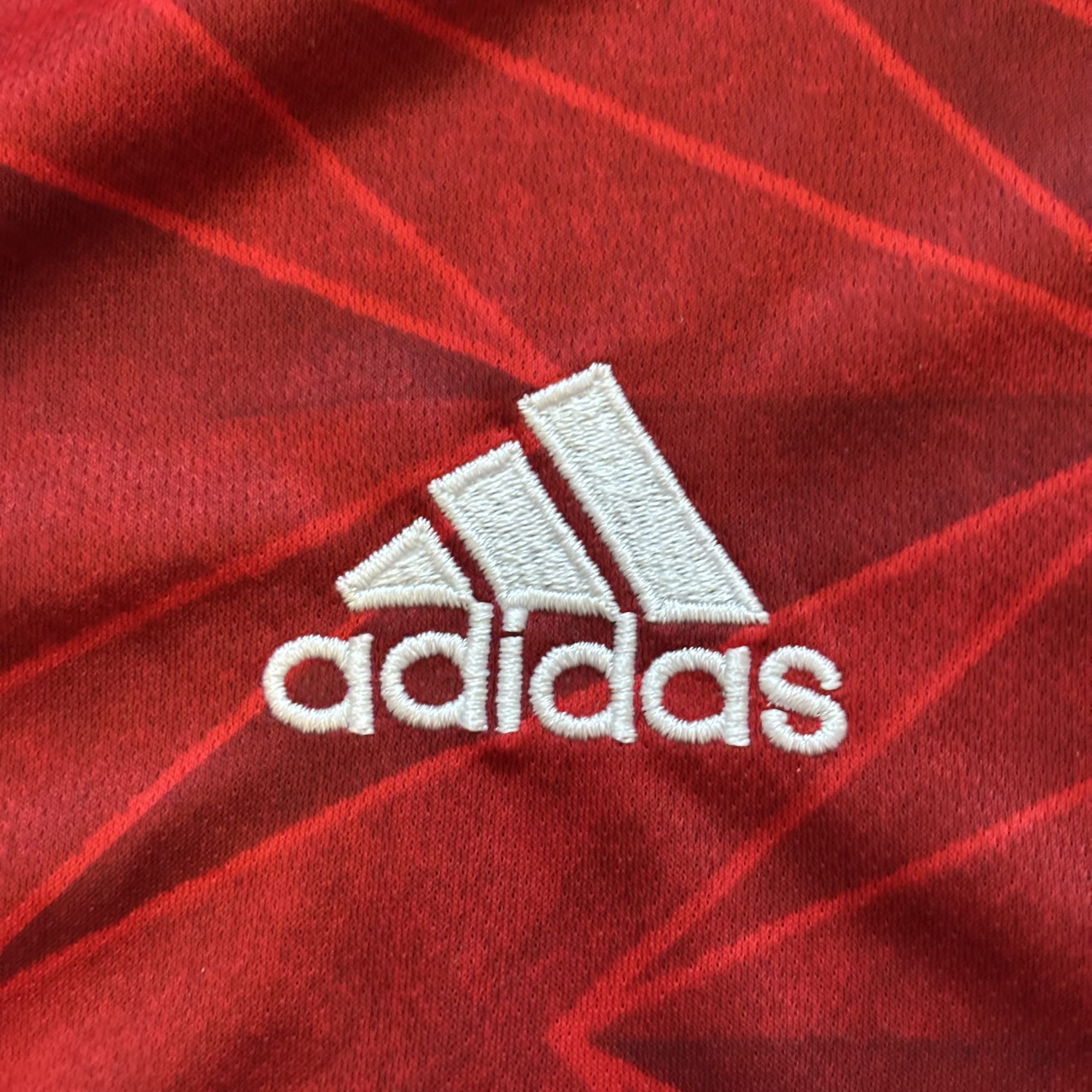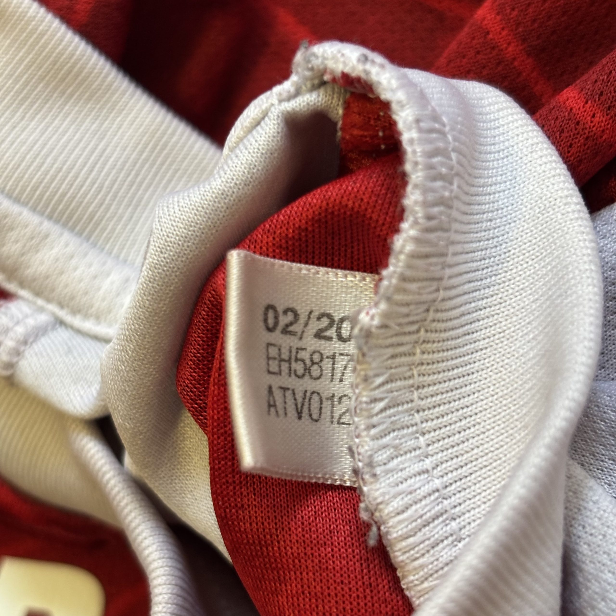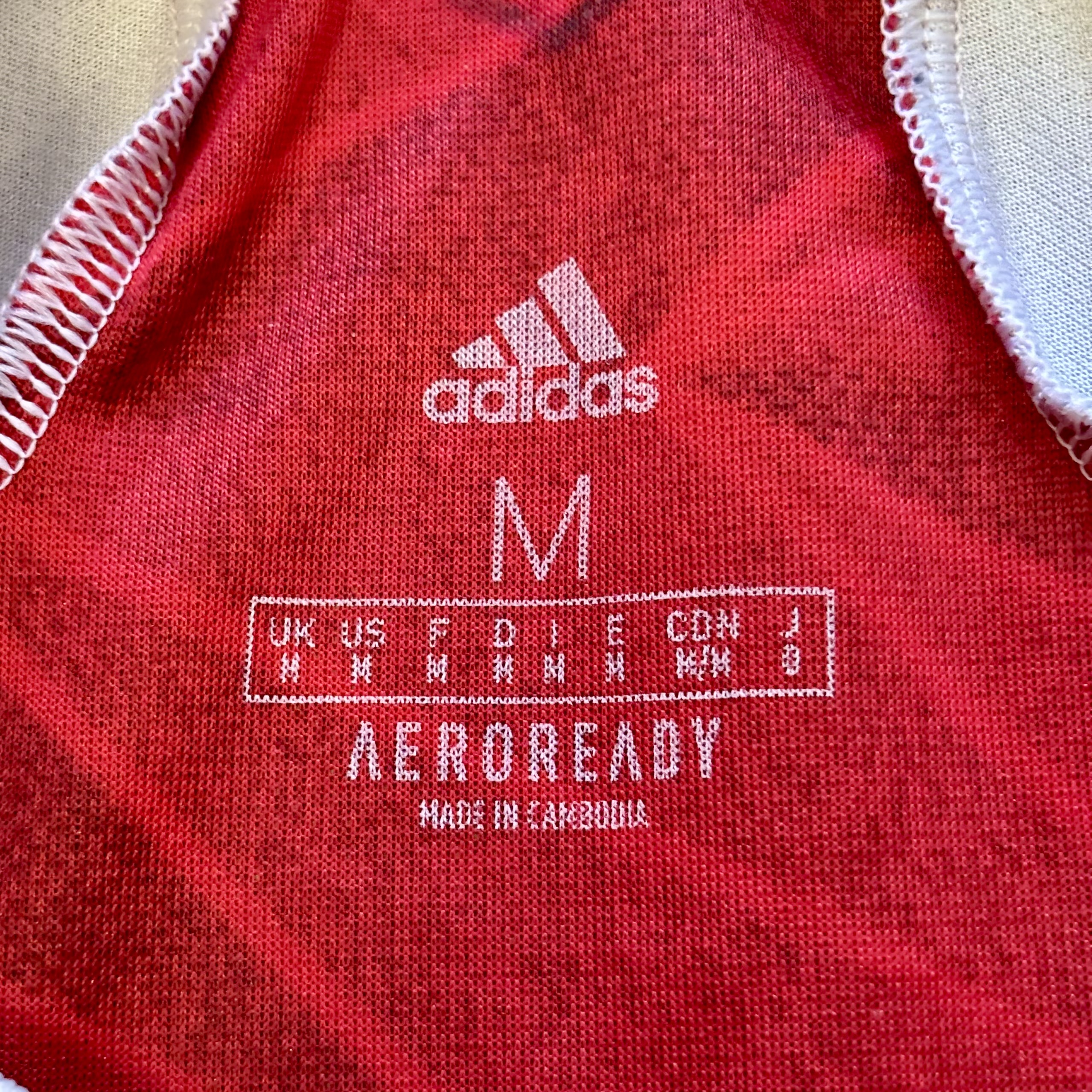 Camiseta local del Arsenal FC utilizada en la temporada 2020-2021, diseñada por adidas con el clásico cuerpo rojo y mangas blancas, incorporando un patrón geométrico tonal inspirado en la iconografía histórica del club. Con este modelo, el Arsenal finalizó 8.º en la Premier League, alcanzó las semifinales de la UEFA Europa League y conquistó la Community Shield 2020, cerrando un curso irregular en liga pero con presencia competitiva en Europa.