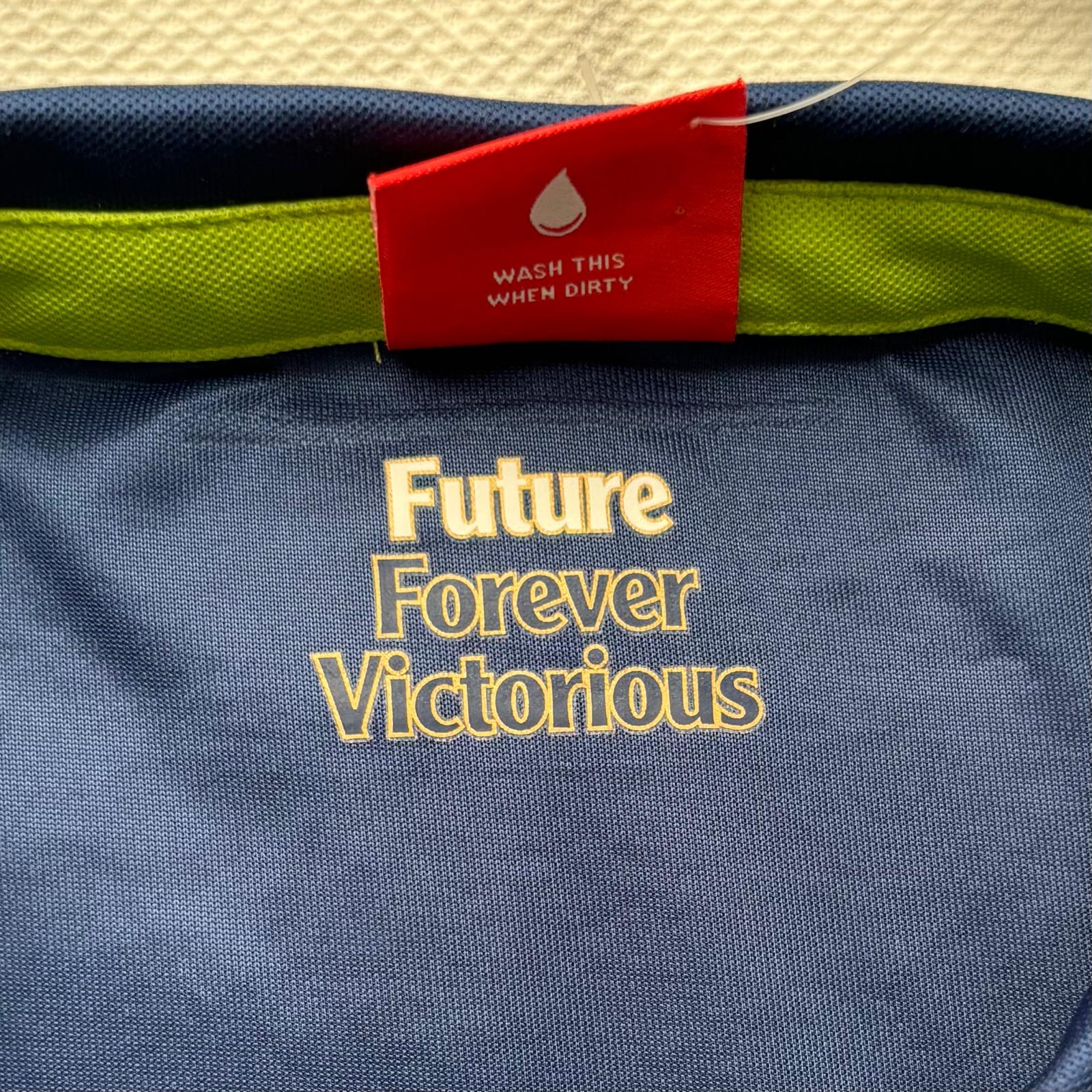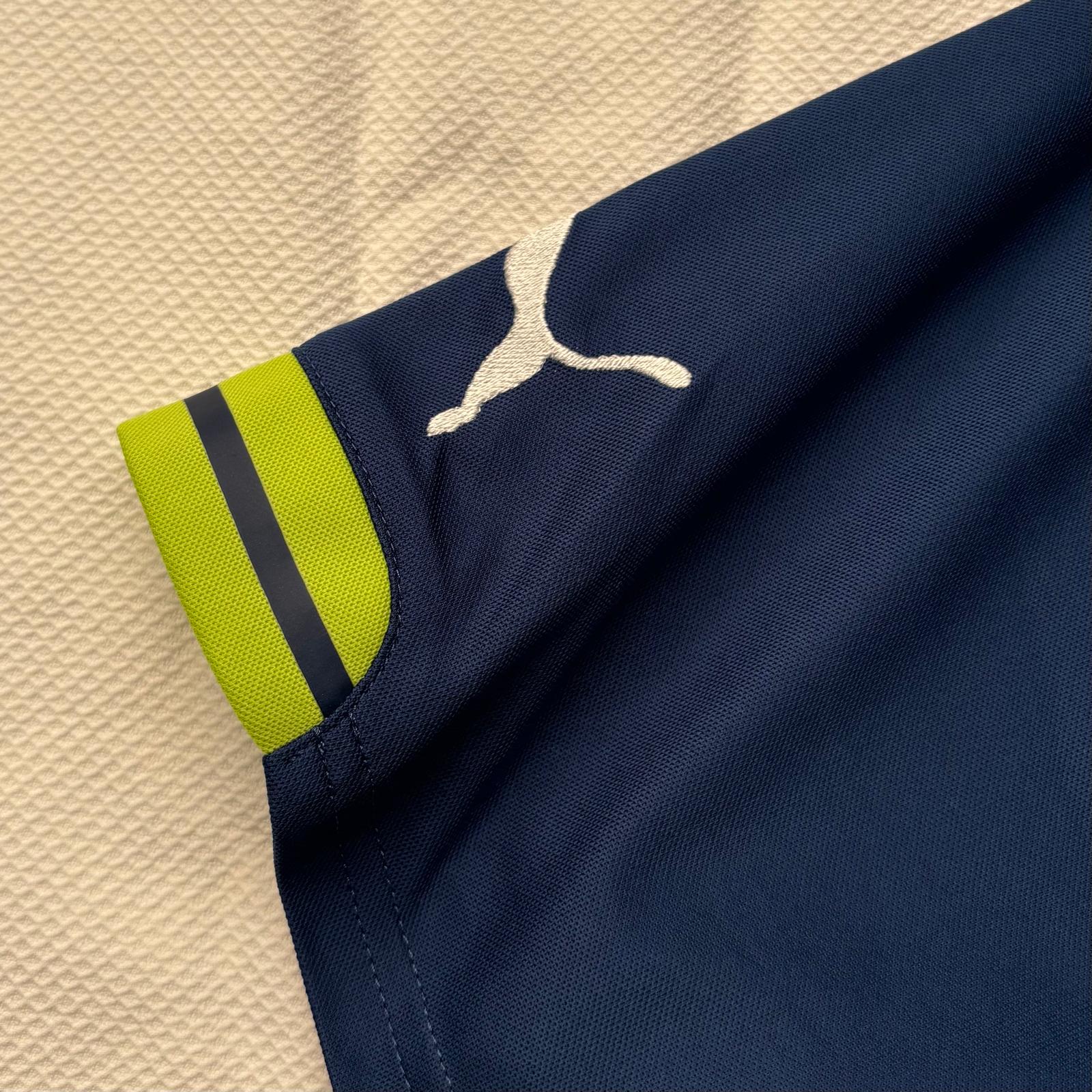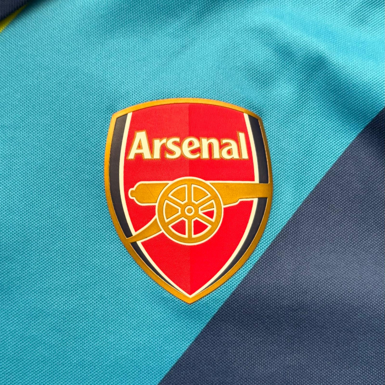 Esta es la tercera equipación del Arsenal  para la temporada 2014-2015, de color azul con detalles en verde neón y azul marino. Fabricada por Puma, presenta el escudo bordado en el pecho, el logo de la marca en blanco y el patrocinador Fly Emirates en el centro. En esta temporada, el Arsenal finalizó 3.º en la Premier League, ganó la FA Cup y la Community Shield, y fue eliminado en los octavos de final de la Champions League.
