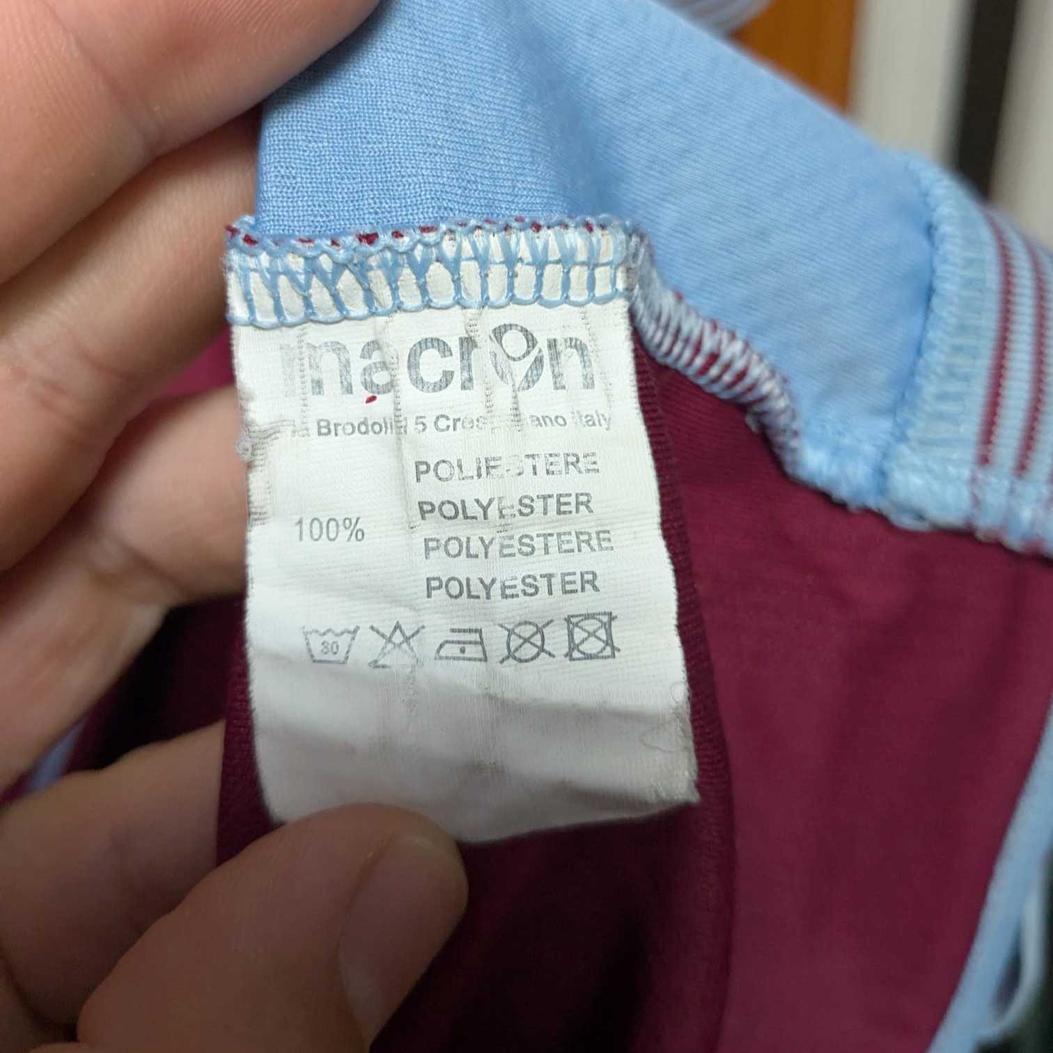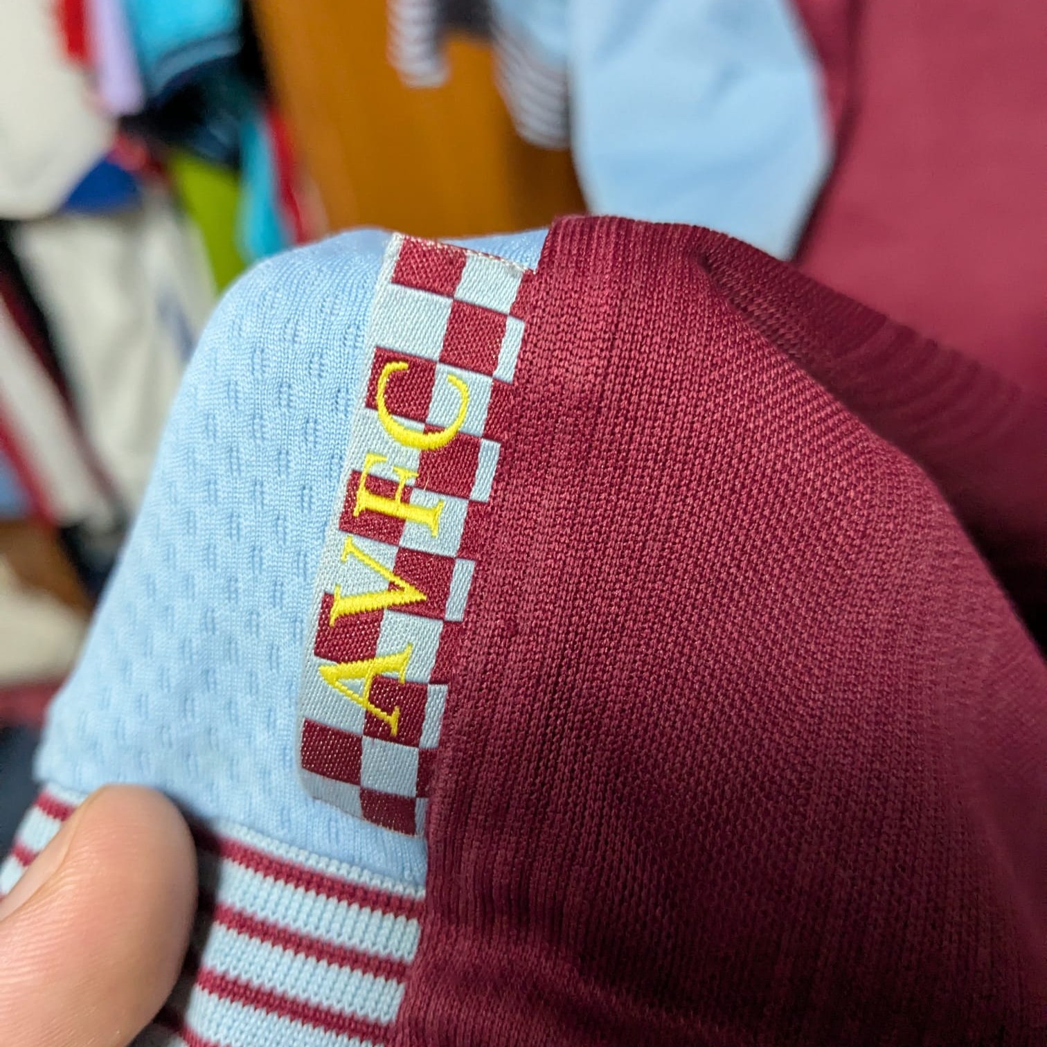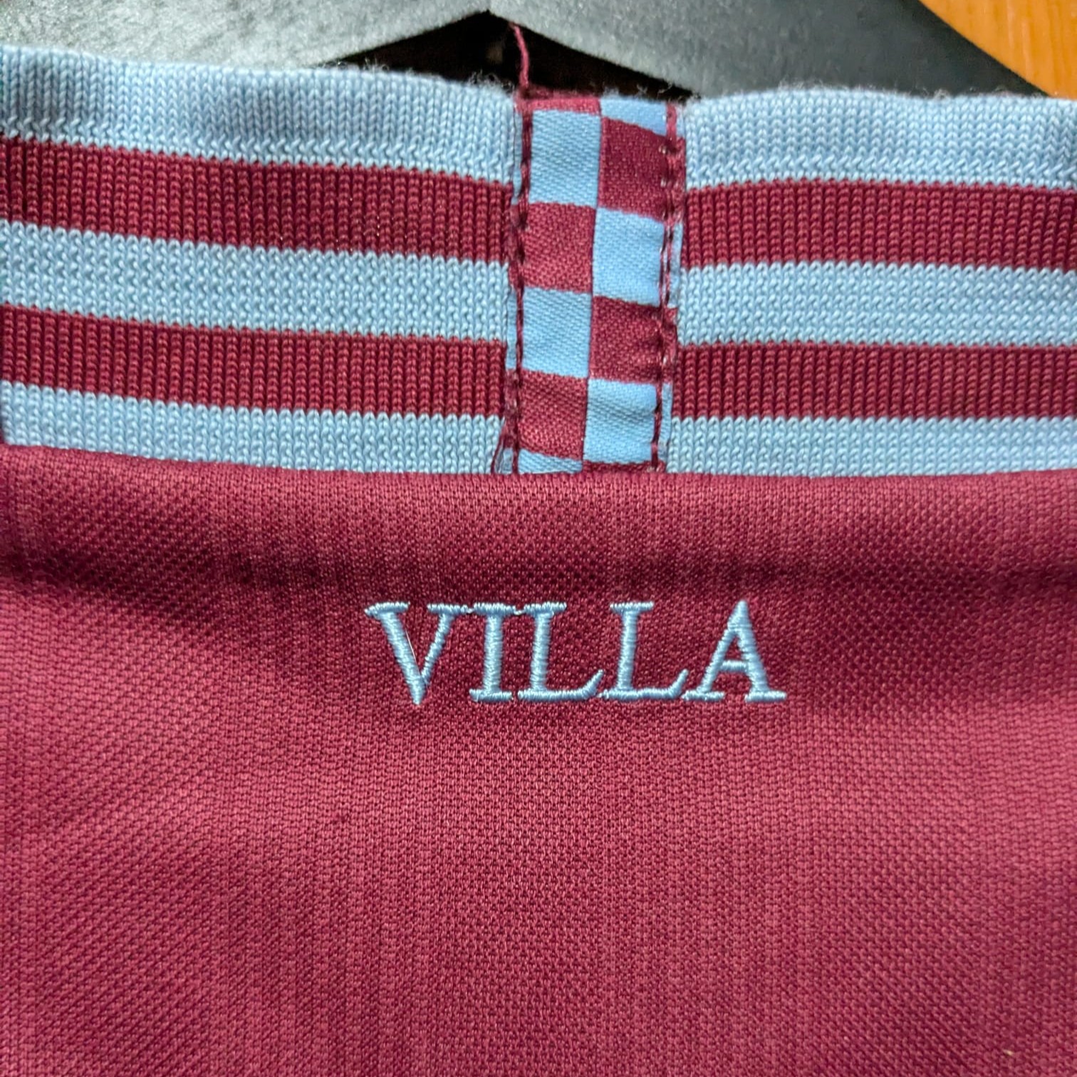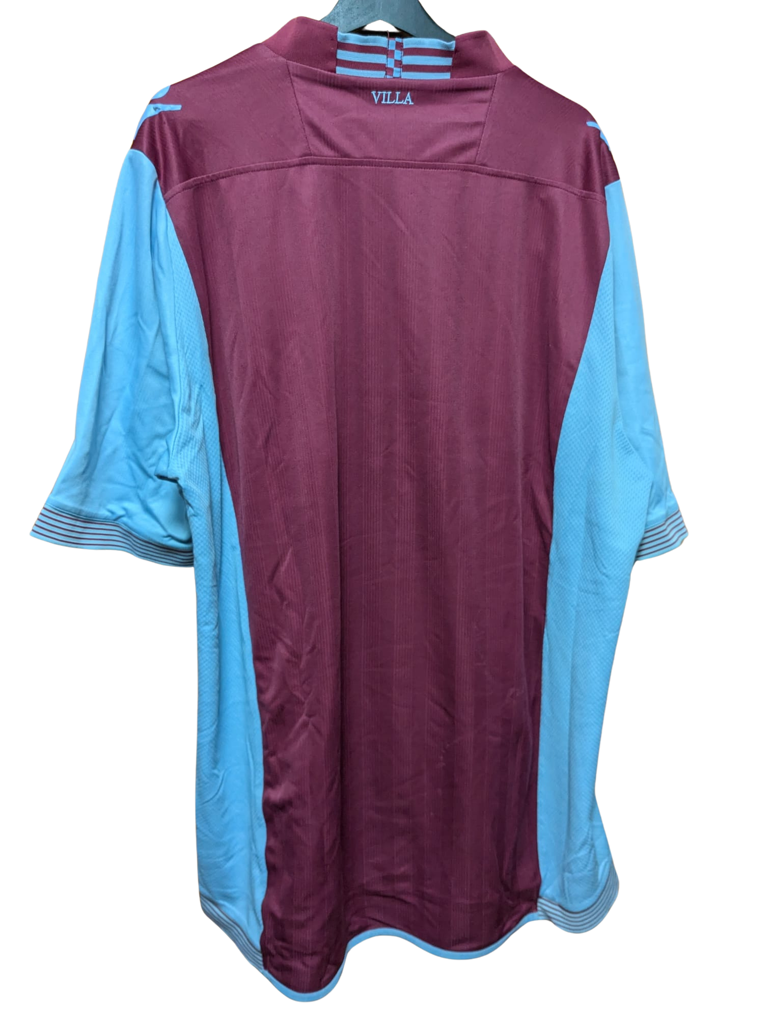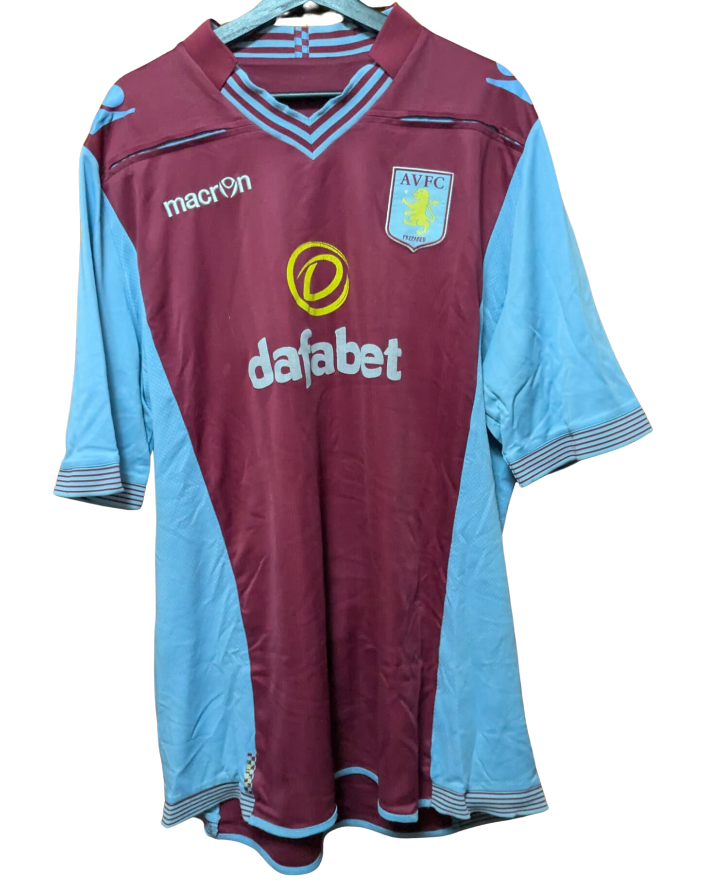 Camiseta local utilizada por el Aston Villa en la temporada 2013–14, fabricada por Macron. Con los tradicionales colores burdeos y azul celeste, esta equipación presentó un diseño clásico con cuello de pico y detalles a rayas en puños y cuello. El equipo finalizó 15.º en la Premier League, fue eliminado en tercera ronda de la FA Cup por el Sheffield United y cayó en segunda ronda de la EFL Cup ante el Tottenham Hotspur.