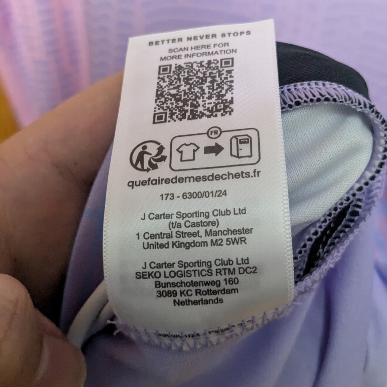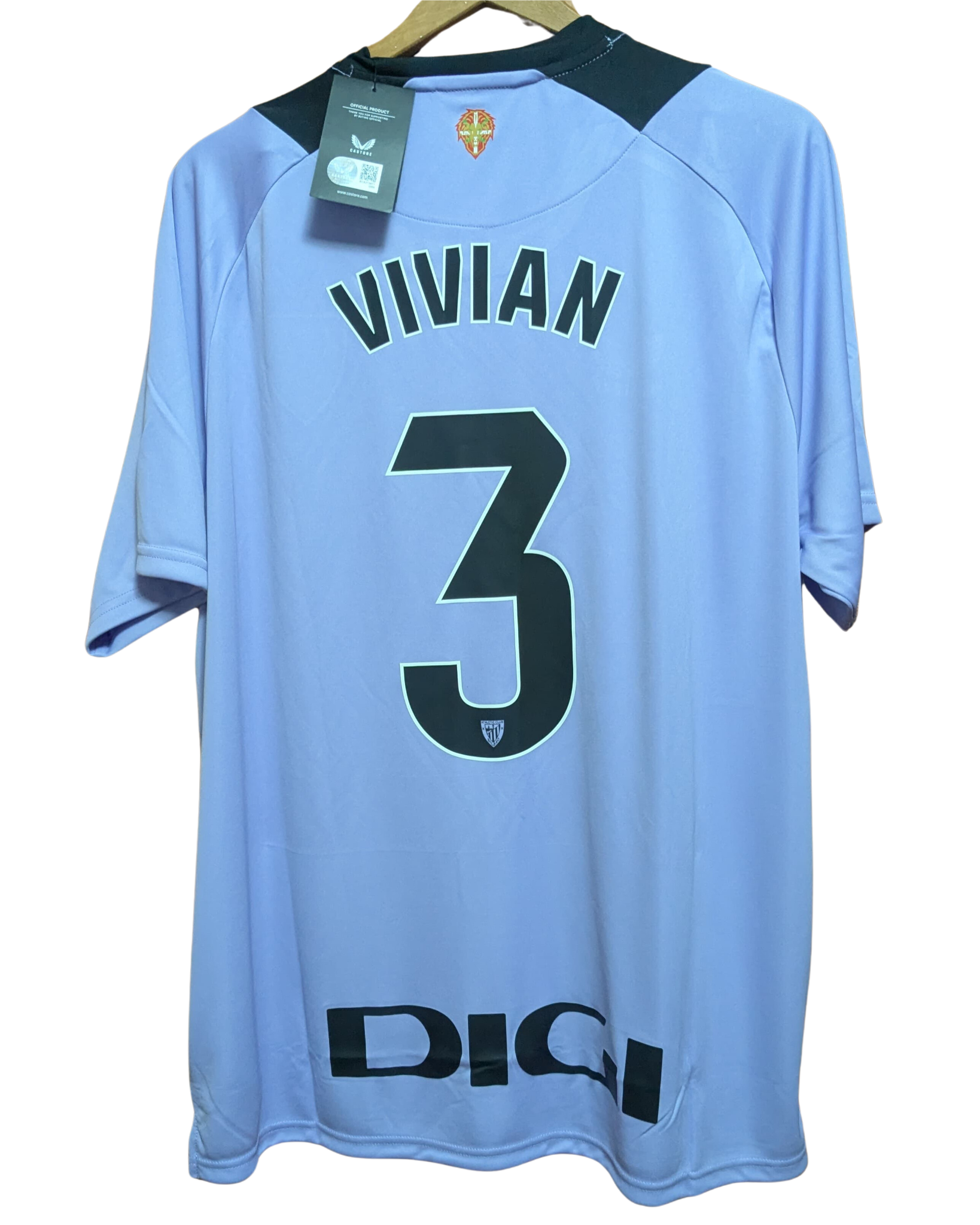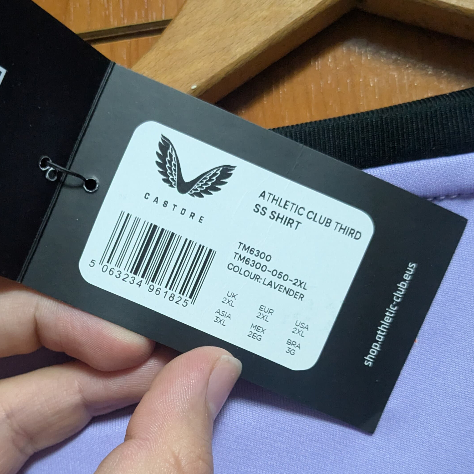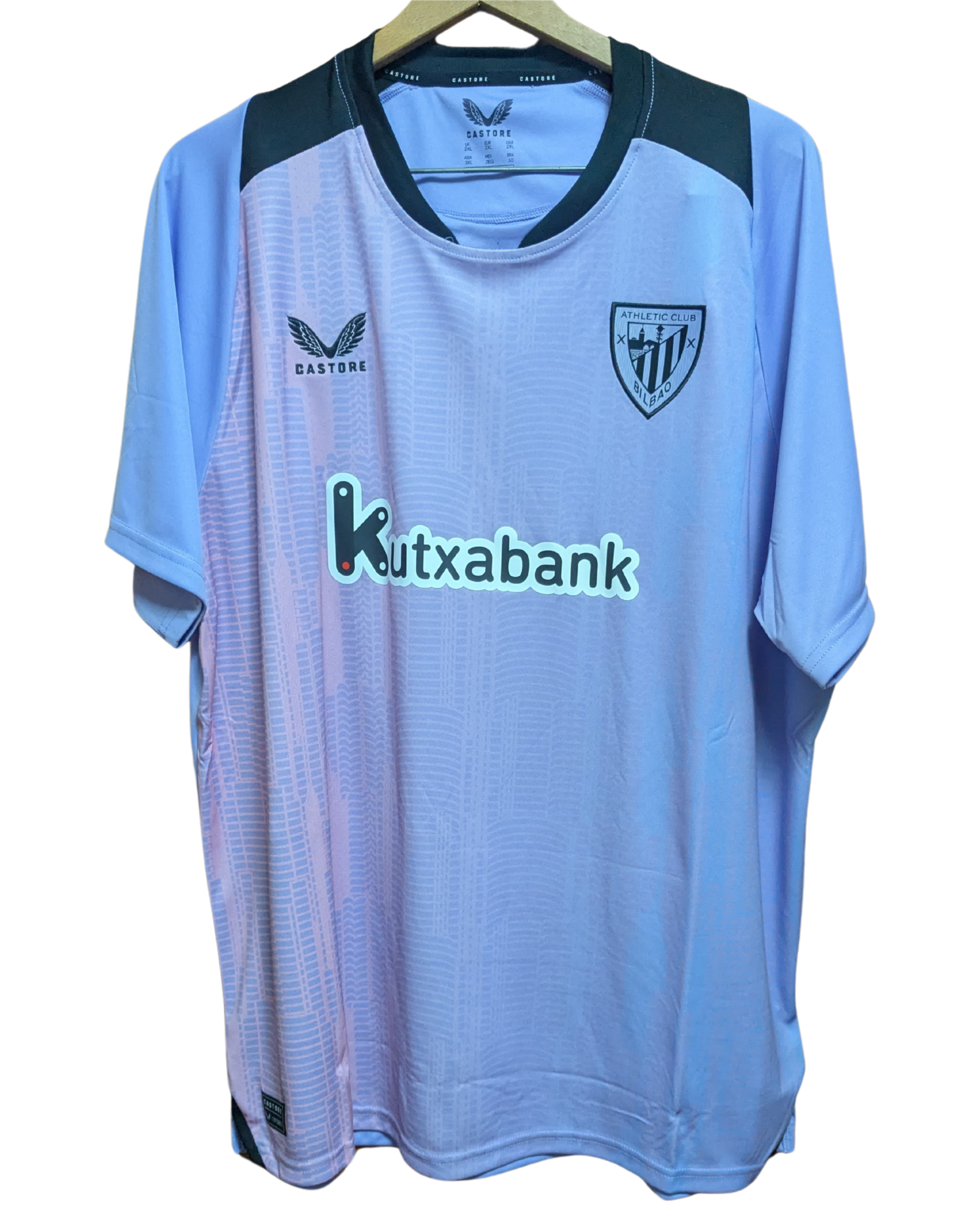 La tercera equipación del Athletic Club para la temporada 2024-2025, fabricada por Castore, presenta un diseño innovador que rompe con la tradición del equipo. Su color lila pastel, con detalles en negro en los hombros y el escudo monocromático, le otorgan un aspecto moderno y sofisticado.