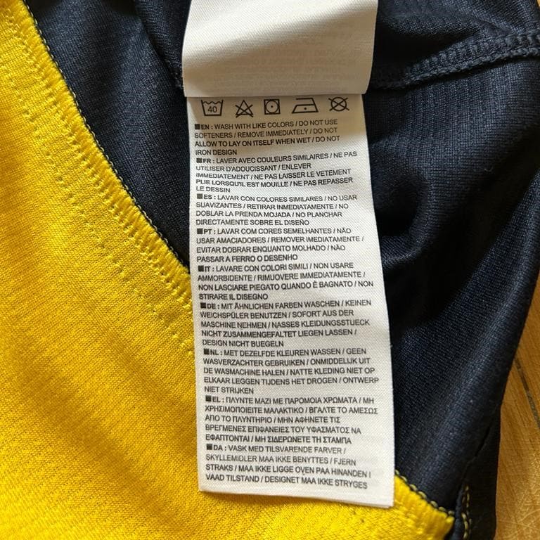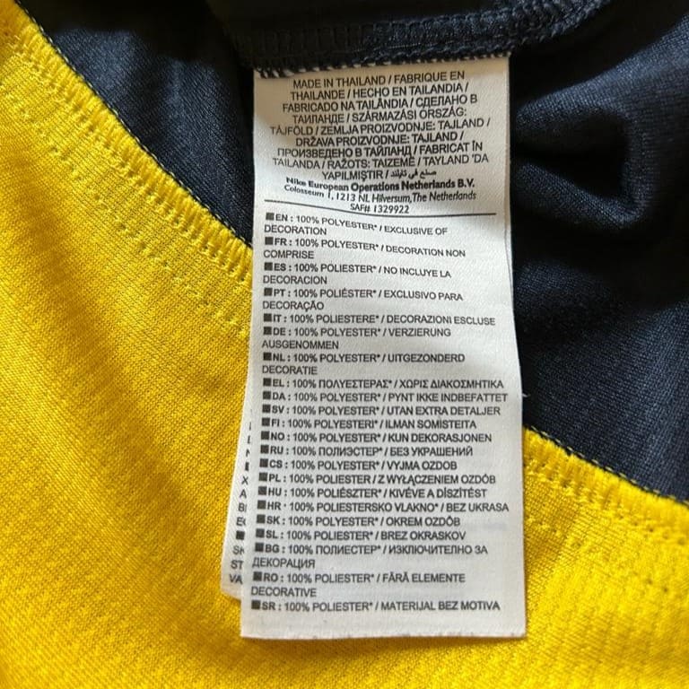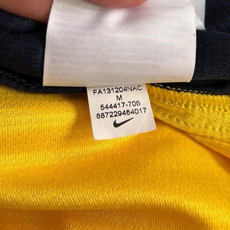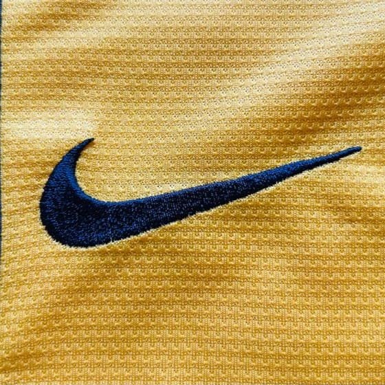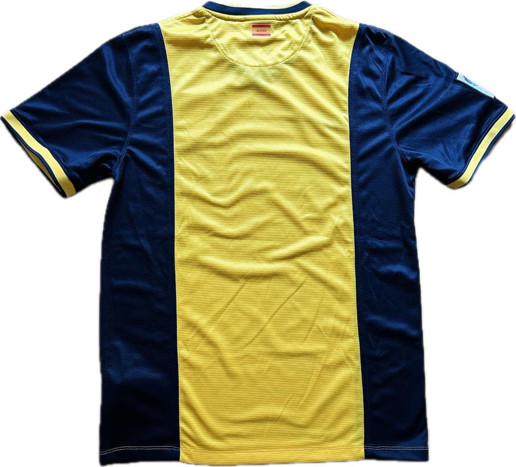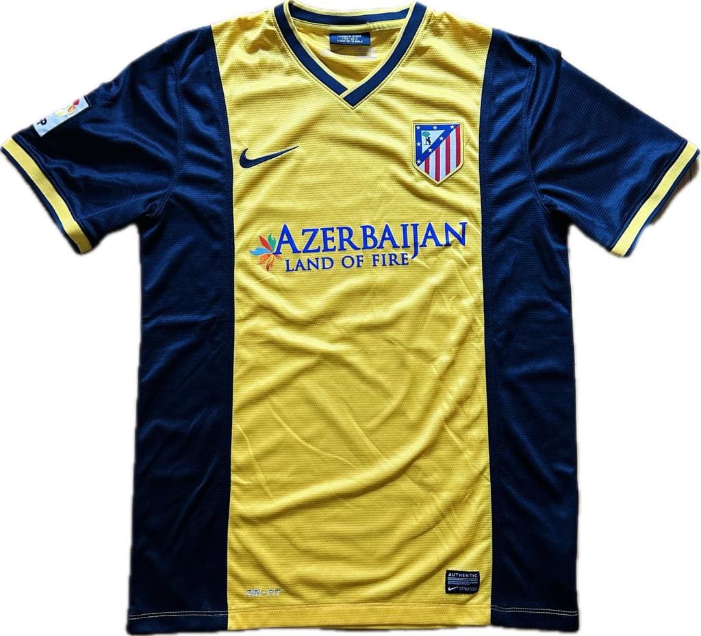 Esta camiseta siempre quedará en la retina de los seguidores del Atlético de Madrid. Con ella se enfrentó al Barcelona como visitante en la última jornada de la Liga 2013 – 2014. Un empate bastaba para ganar el campeonato 18 años después. Y lo lograron. La camiseta visitante del Atlético de Madrid 2013-2014, diseñada por Nike, se caracteriza por su diseño en tonos amarillos y azul marino. El amarillo domina el centro, mientras que el azul marino resalta en las mangas y los laterales, creando un contraste distintivo. En el pecho, el patrocinador principal «Azerbaijan – Land of Fire» refleja el acuerdo publicitario que el club mantuvo esa temporada. El escudo del club aparece en su ubicación habitual en el lado izquierdo, mientras que el logo de Nike adorna el derecho. El club colchonero también llego a la final de la UEFA Champions League, en la que fue derrotado por el Real Madrid.