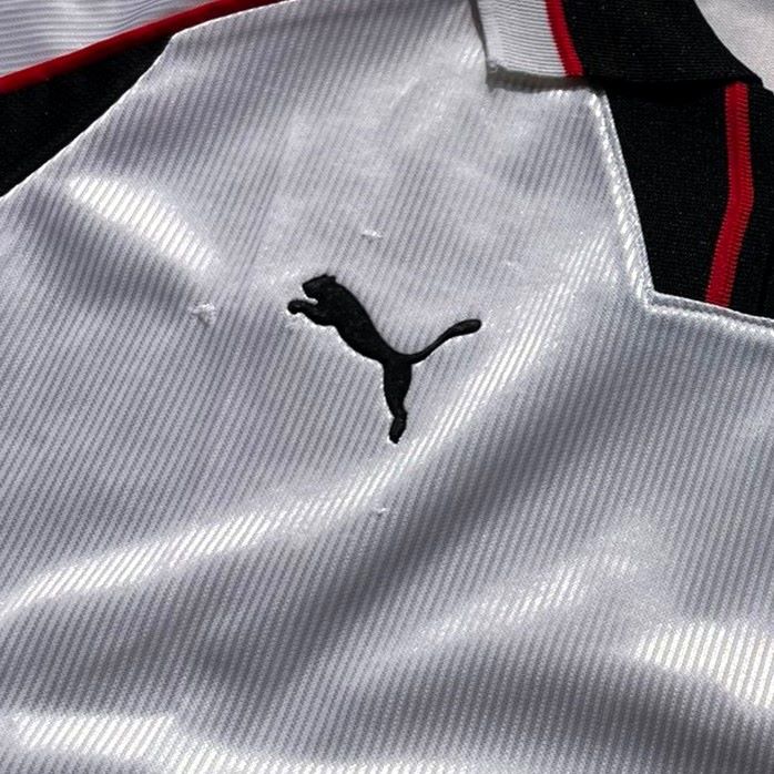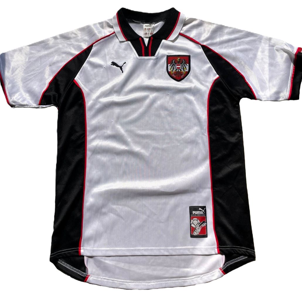 Camiseta local de la selección de Austria utilizada entre 1998 y 2000, fabricada por Puma. Diseño en blanco con detalles en negro y rojo, con un patrón de líneas verticales sutiles. Presenta el escudo de la selección en el pecho y cuello tipo polo con solapa negra. Usada en la Copa del Mundo de Francia 1998 y la clasificación para la Eurocopa 2000. En el torneo mundialista, Austria empató a un gol con Camerún y Chile, y perdió por 2-1 ante Italia. Una curiosidad: Austria marcó los tres goles del campeonato en los tiempos añadidos de sus tres partidos.