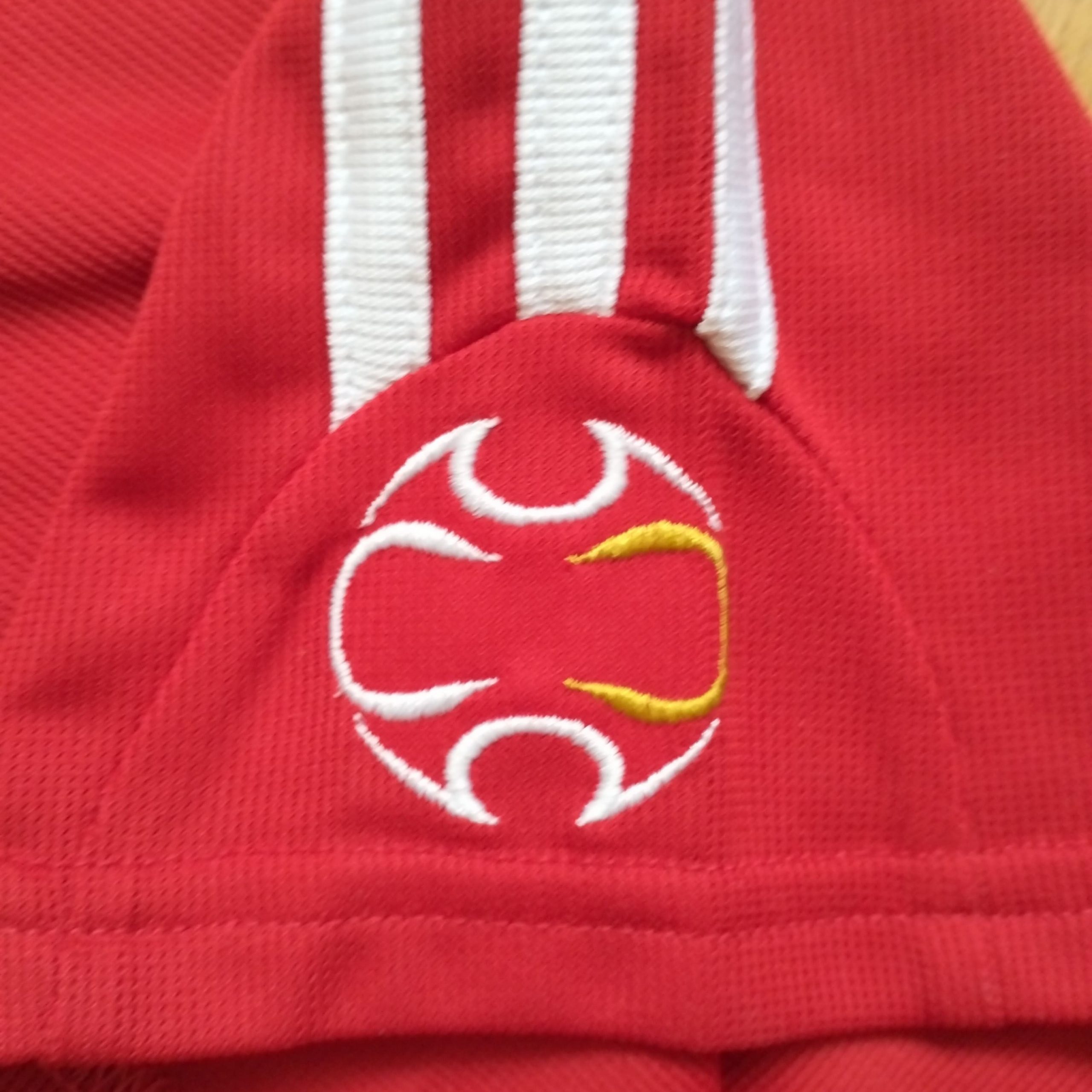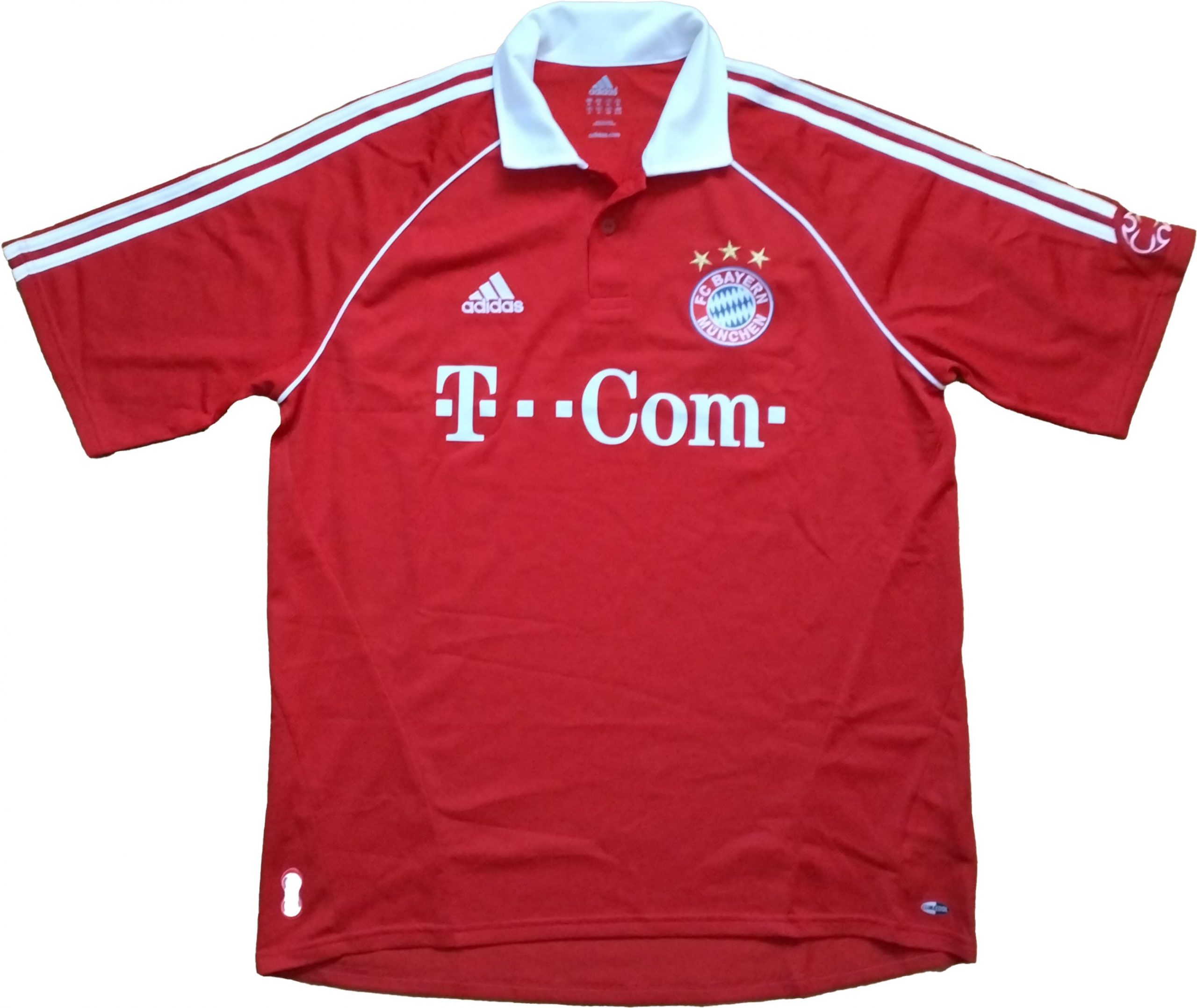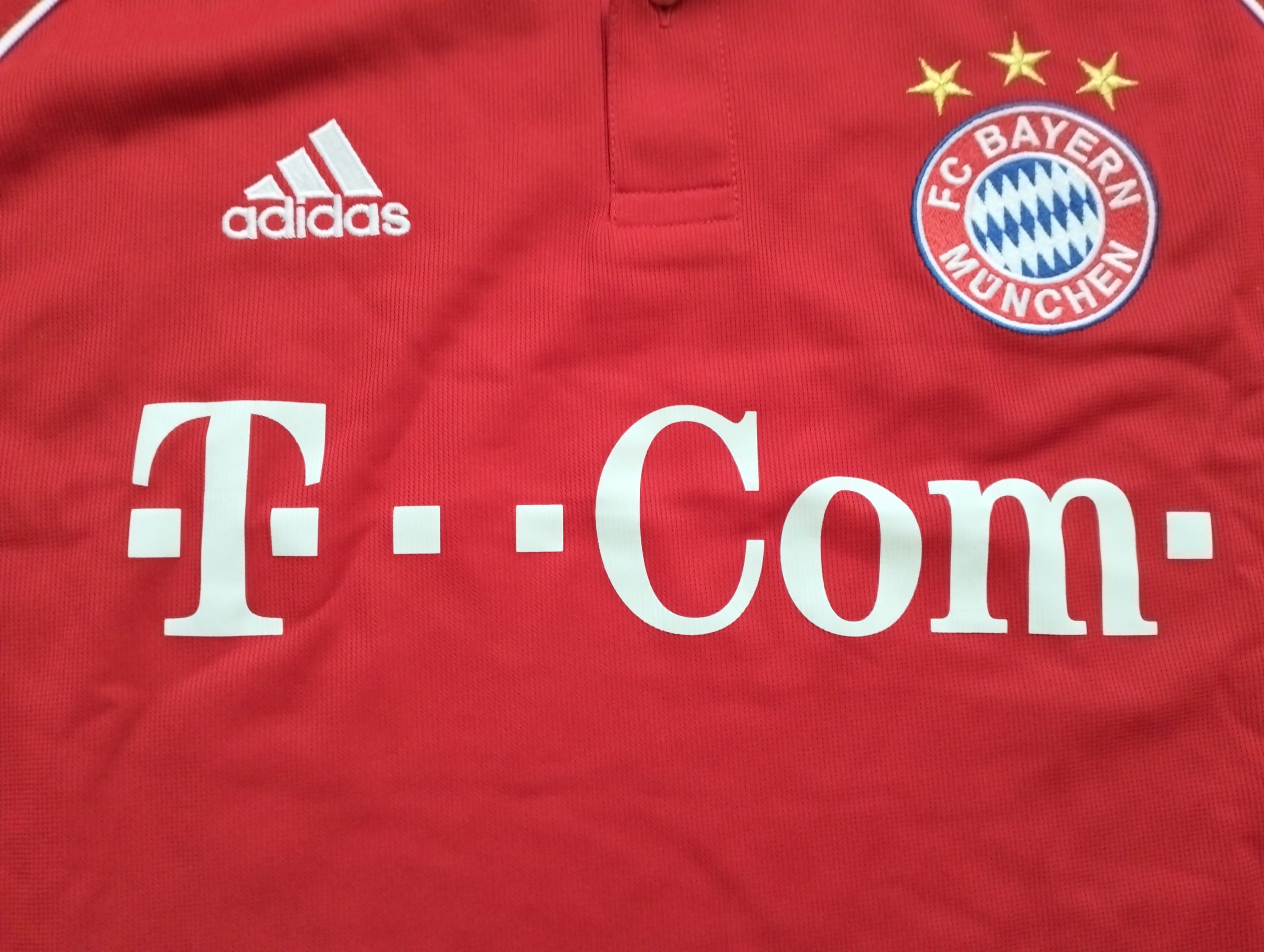 La camiseta local del Bayern München para la temporada 2006-2007, diseñada por Adidas, presenta un diseño clásico en rojo intenso con detalles blancos en el cuello, las mangas y las icónicas tres rayas de la marca alemana. En el pecho destaca el patrocinador «T-Com», reflejando la colaboración del club con Deutsche Telekom durante aquellos años. El escudo del Bayern incluye las cuatro estrellas que representan más de 20 títulos de la Bundesliga, consolidando su dominio en el fútbol alemán.