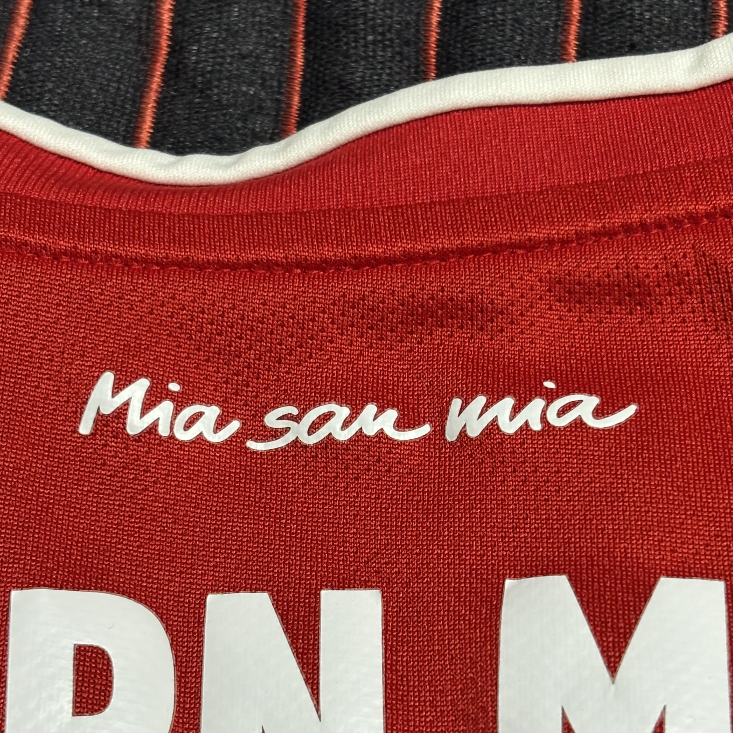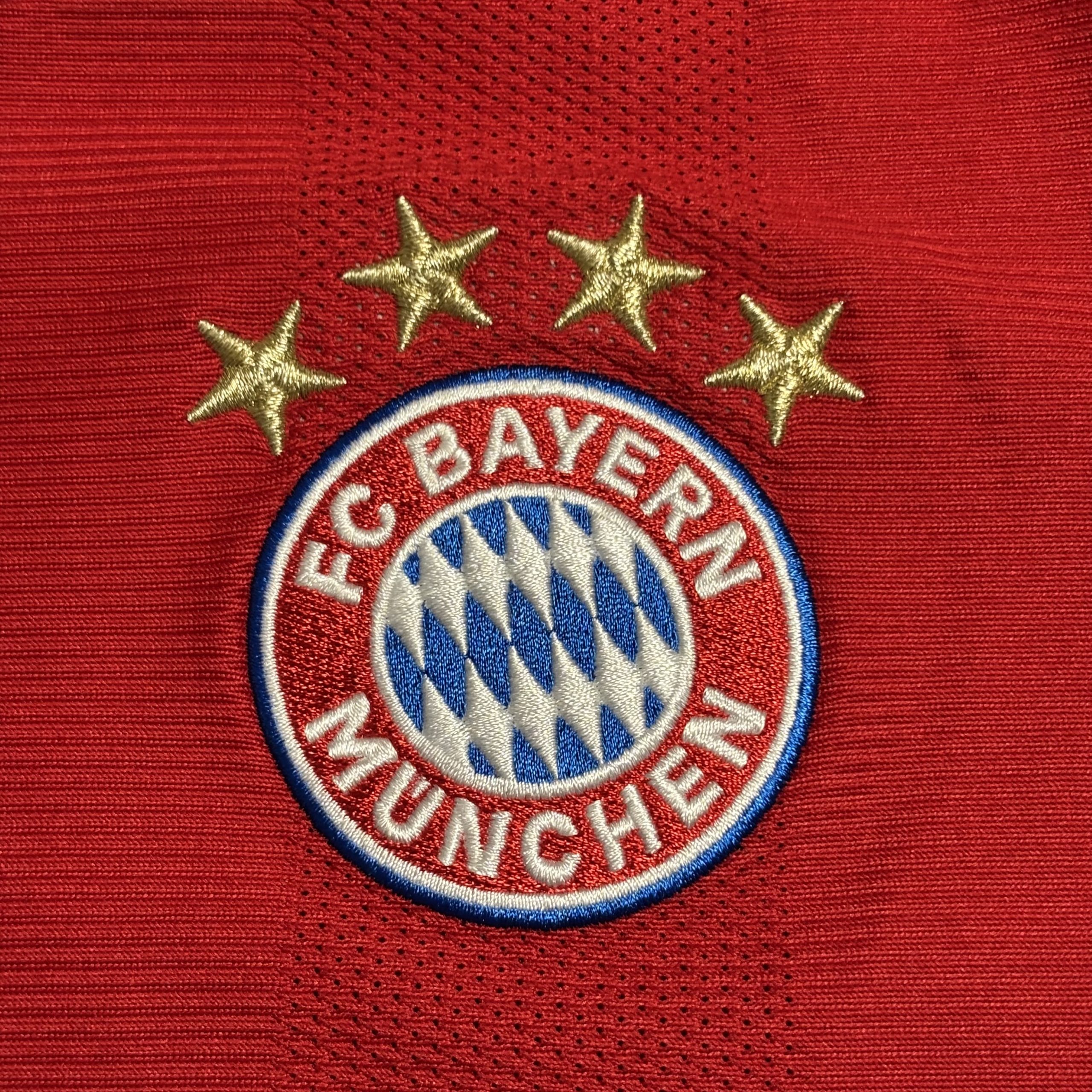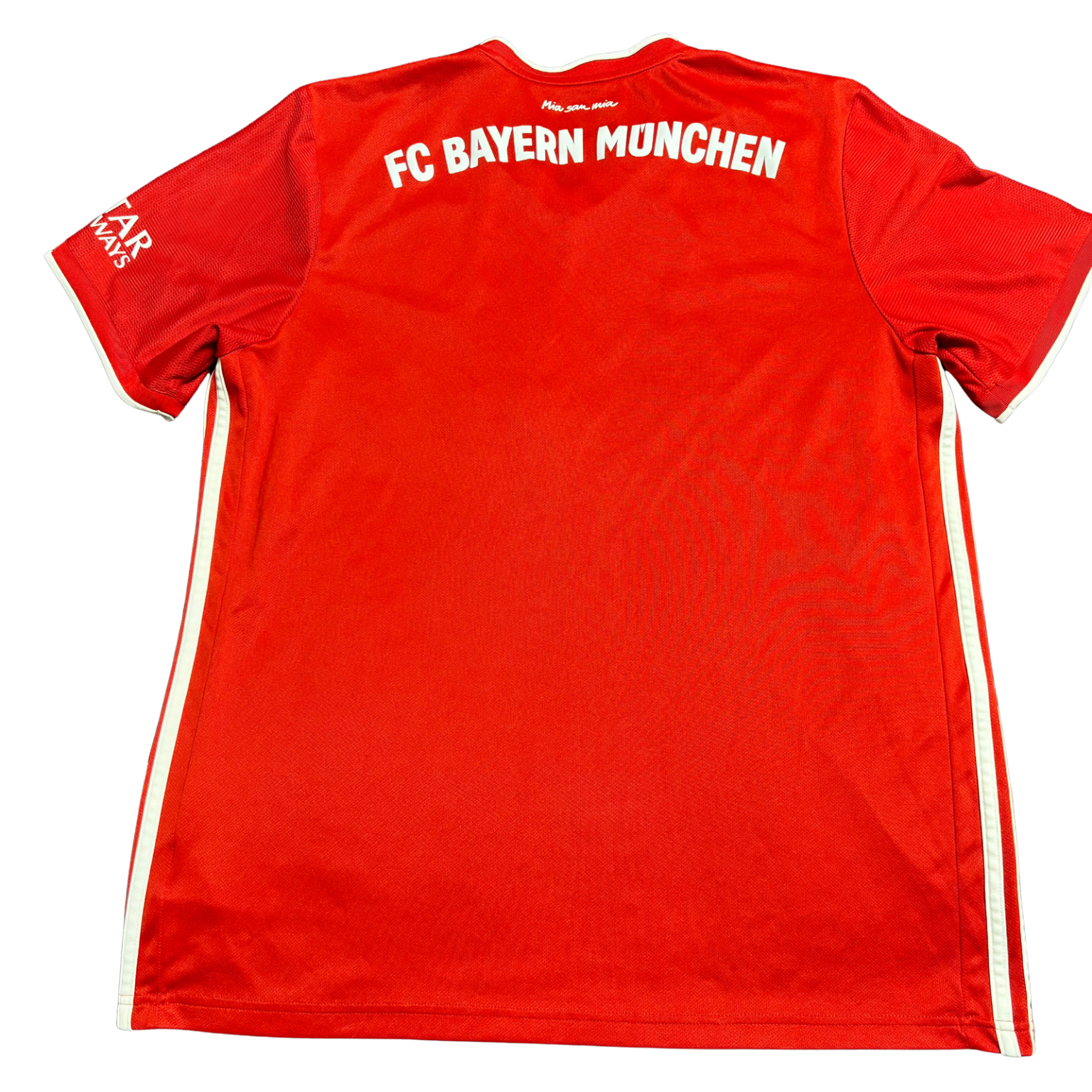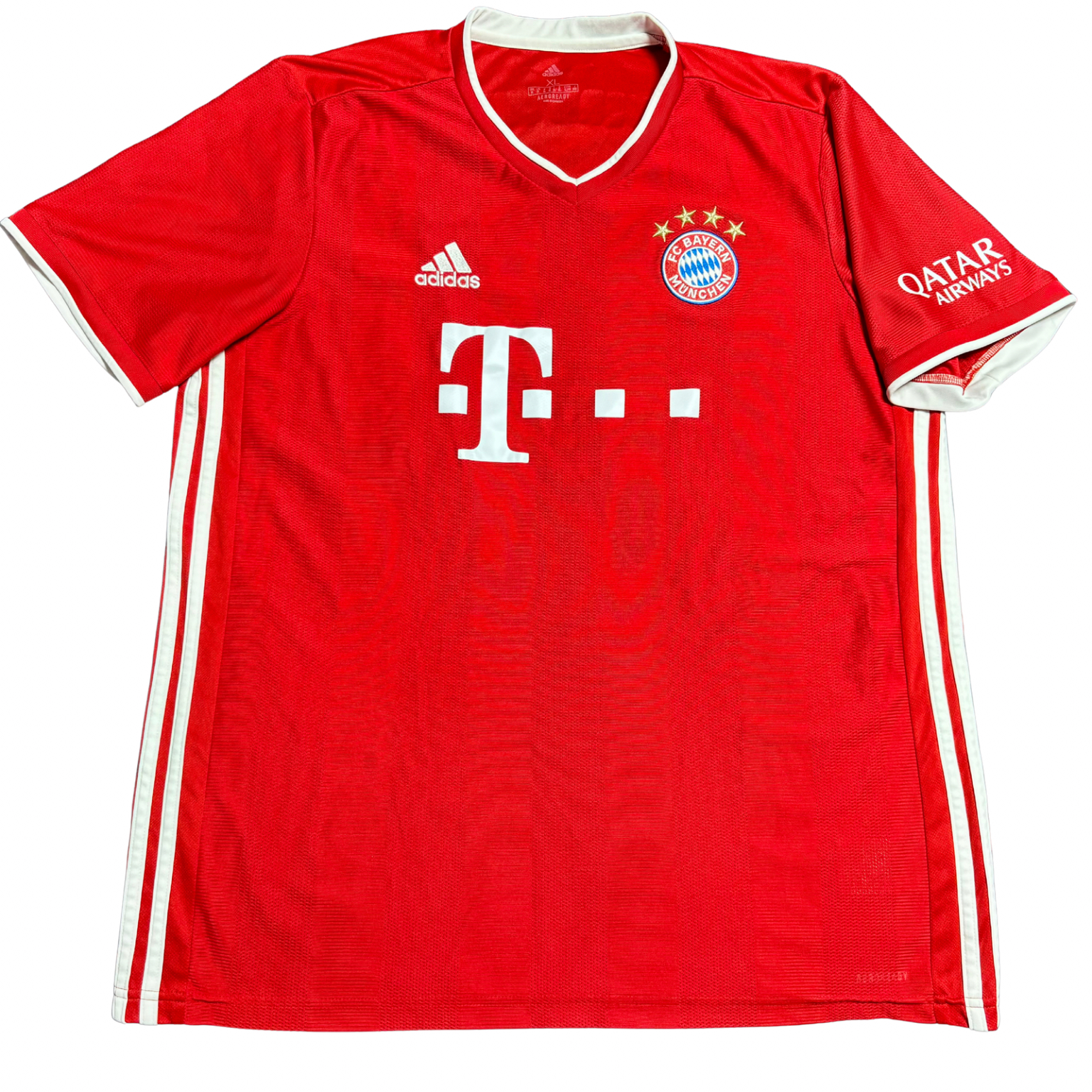 Camiseta local del FC Bayern München para la temporada 2020-2021, diseñada por adidas en el clásico rojo del club con detalles blancos y el patrocinio de Telekom, un modelo asociado a un curso de máxima exigencia competitiva en el que el Bayern se proclamó campeón de la Bundesliga por novena temporada consecutiva y alcanzó los cuartos de final de la UEFA Champions League, consolidando su dominio nacional tras el histórico sextete logrado el año anterior.