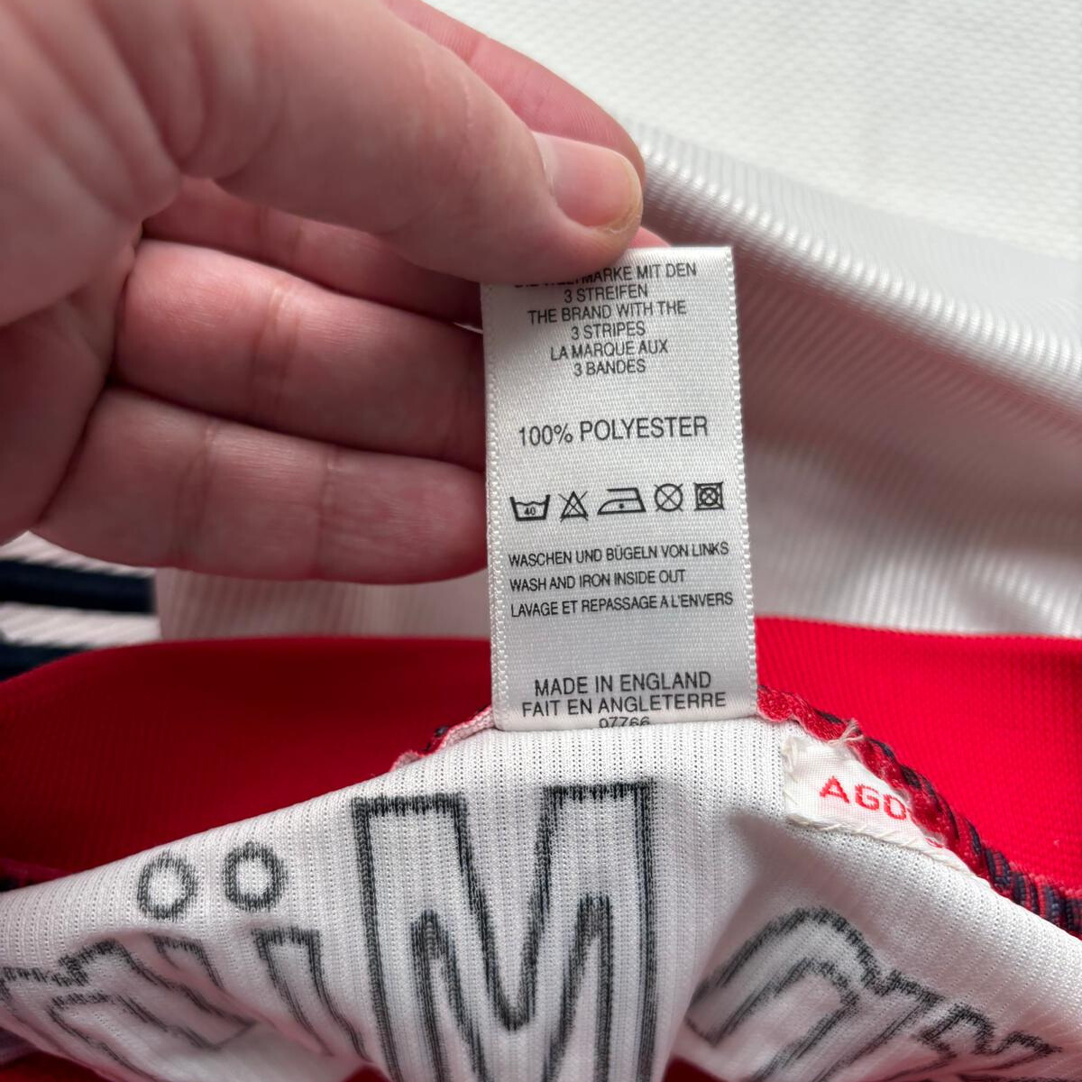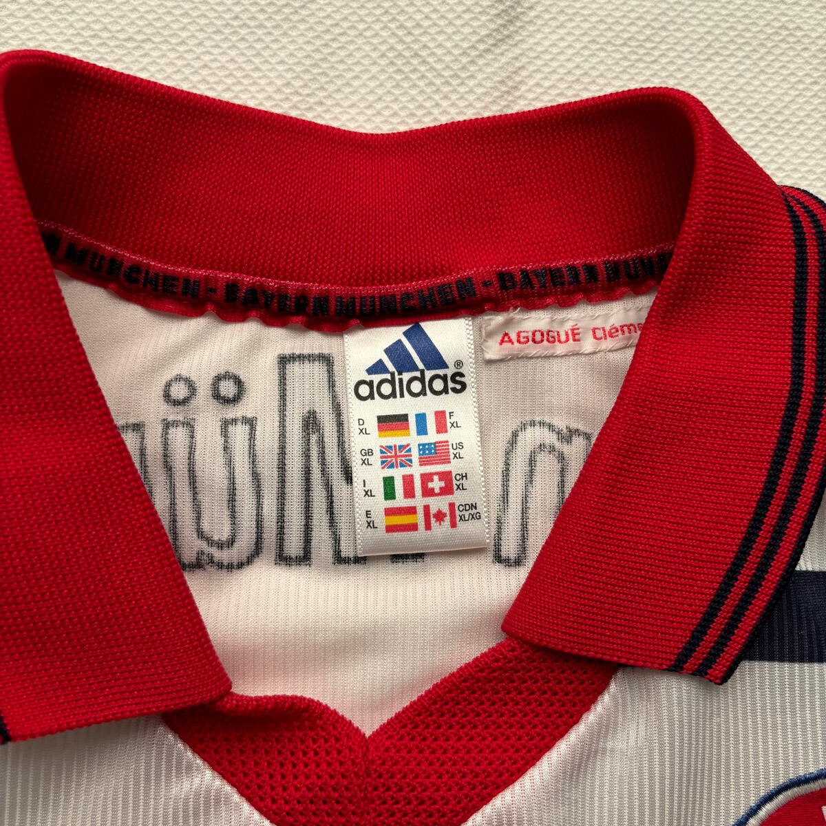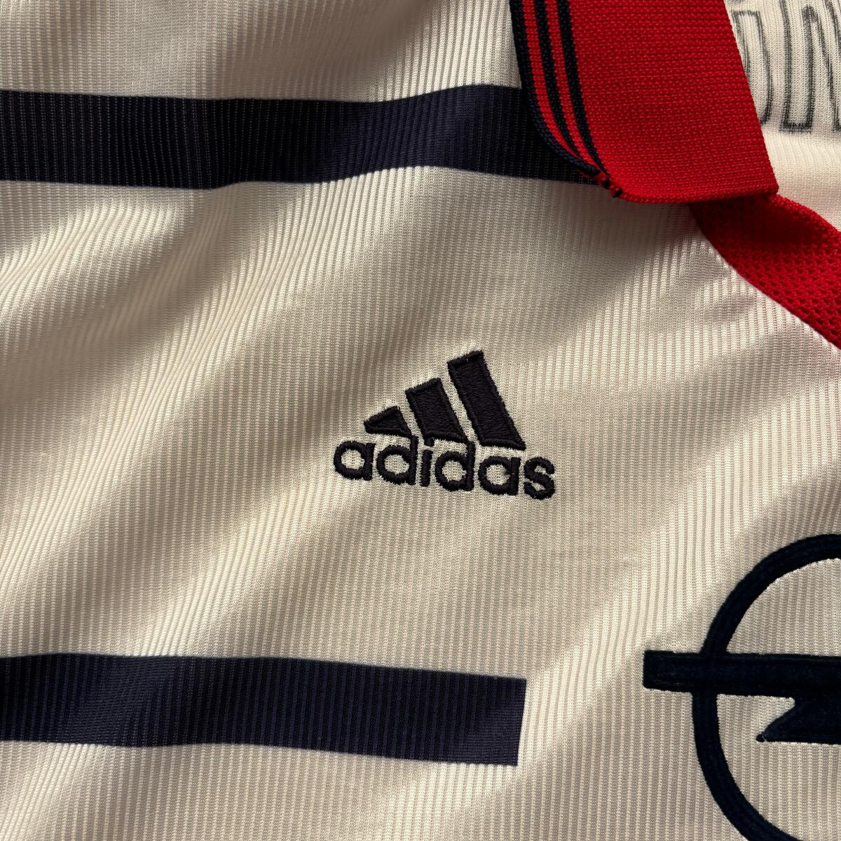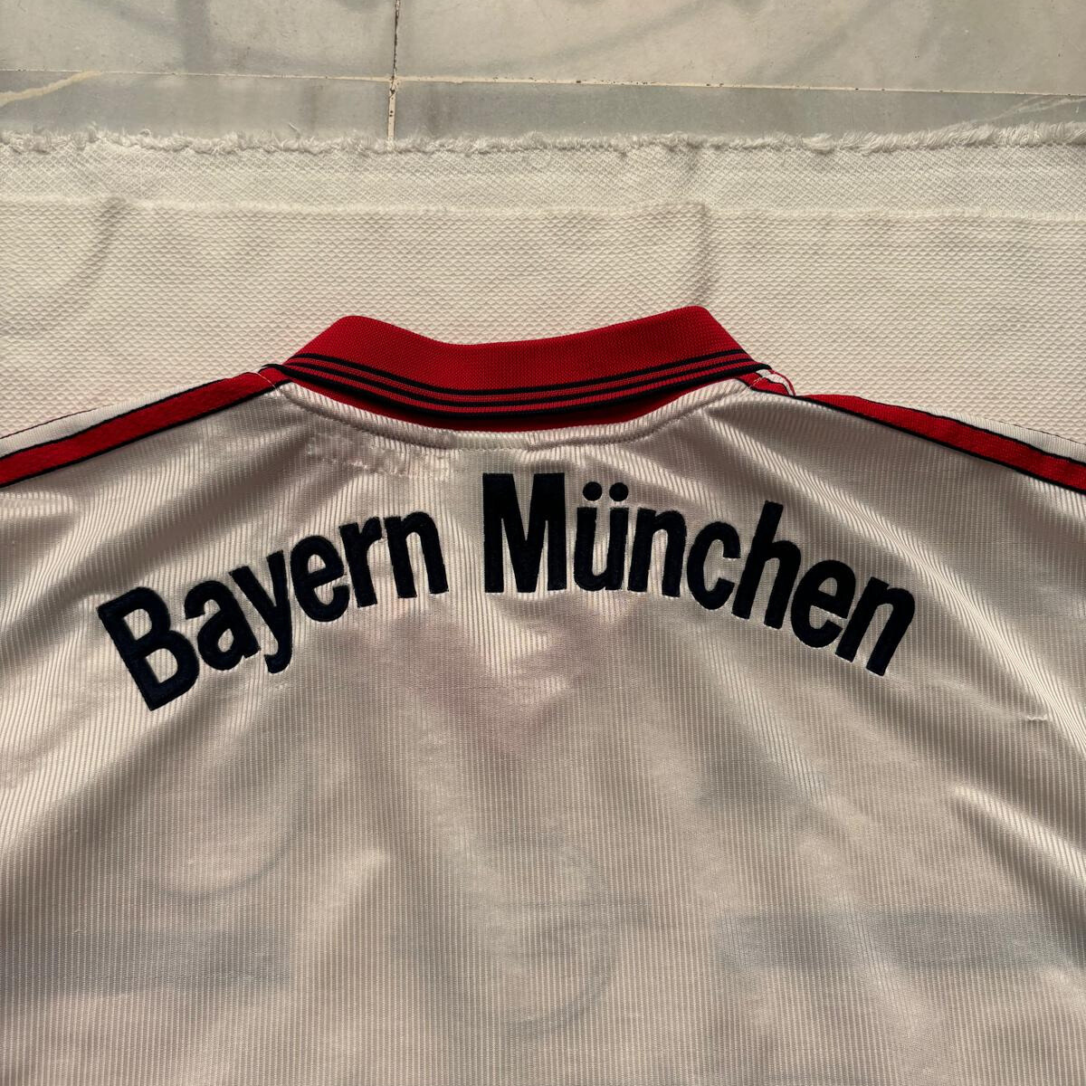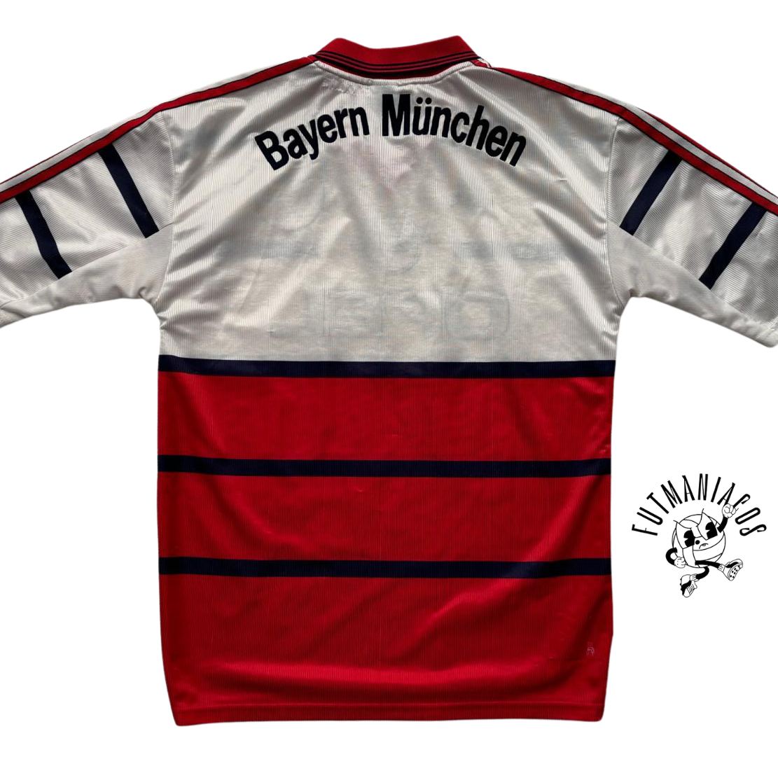 Camiseta visitante del Bayern Múnich utilizada entre 1998 y 2000, fabricada por Adidas. Con un diseño innovador de franjas horizontales en rojo, blanco y azul marino, este uniforme acompañó al equipo bávaro en una de sus épocas más exitosas, incluyendo el tricampeonato de la Bundesliga y la final de la Champions League 1998-99.