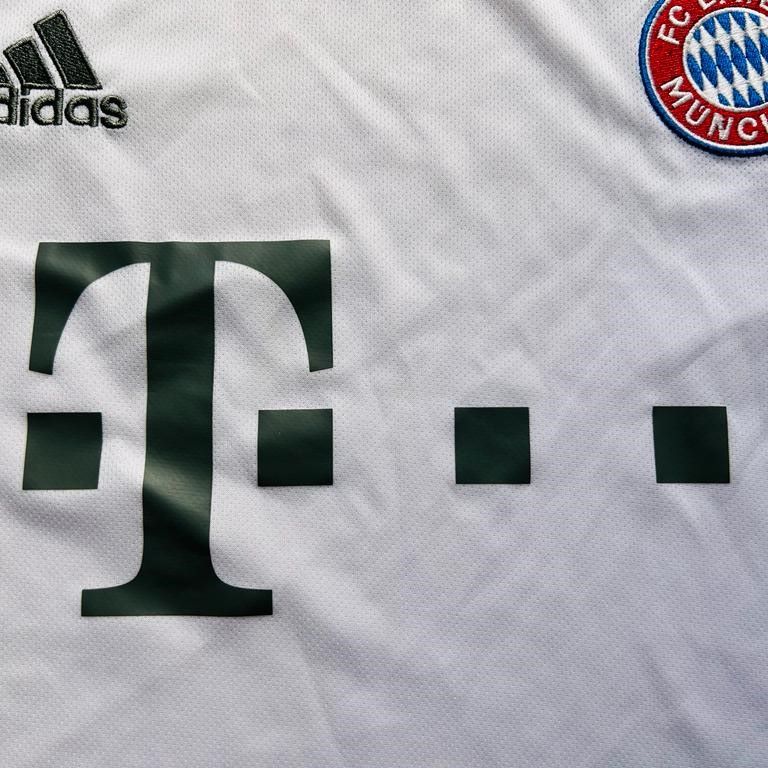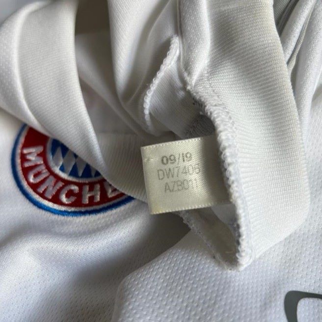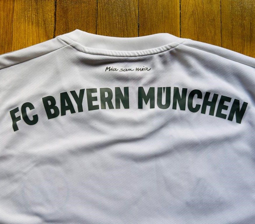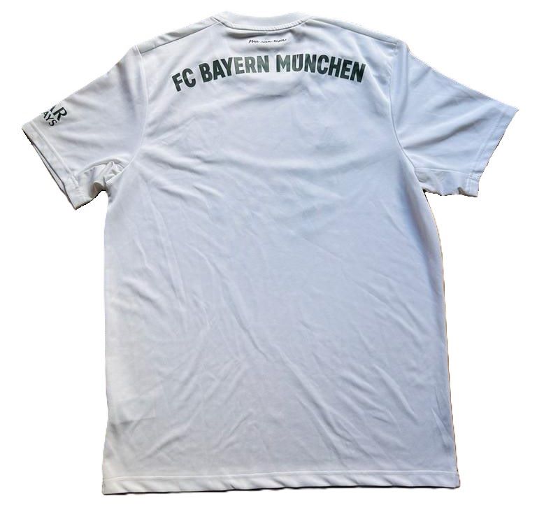 La camiseta visitante del Bayern München 2019-2020, diseñada por Adidas, presenta un diseño en tonos blancos con detalles en gris con un dibujo geométrico degradado en la parte inferior. Utilizada en la Bundesliga, la DFB-Pokal y la UEFA Champions League. La temporada resultó histórica para el Bayern, ya que lograron un triplete, conquistando las tres competiciones. En la final de la Champions League, el Bayern derrotó al Paris Saint-Germain por 1-0, aunque en dicho partido se utilizó la equipación local.