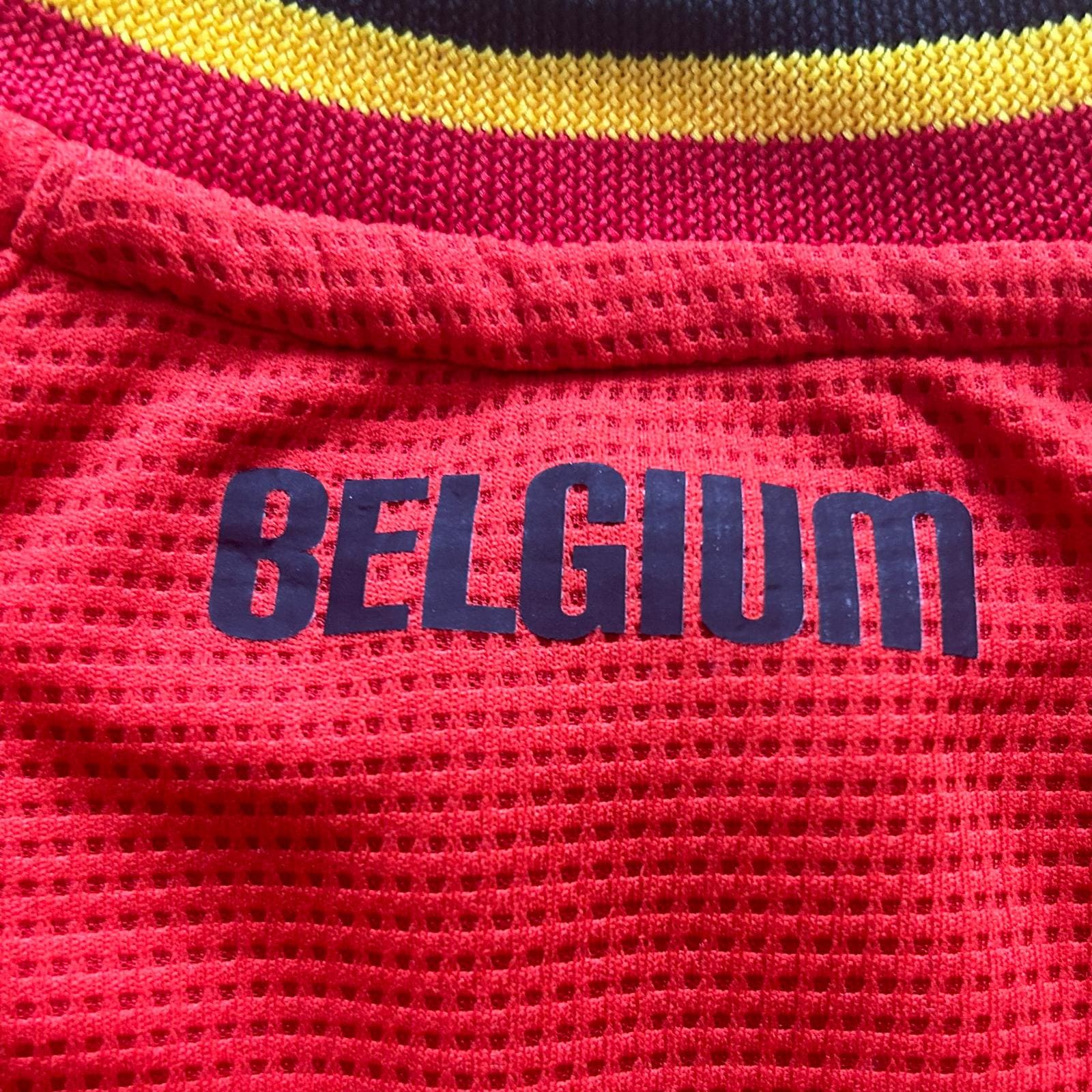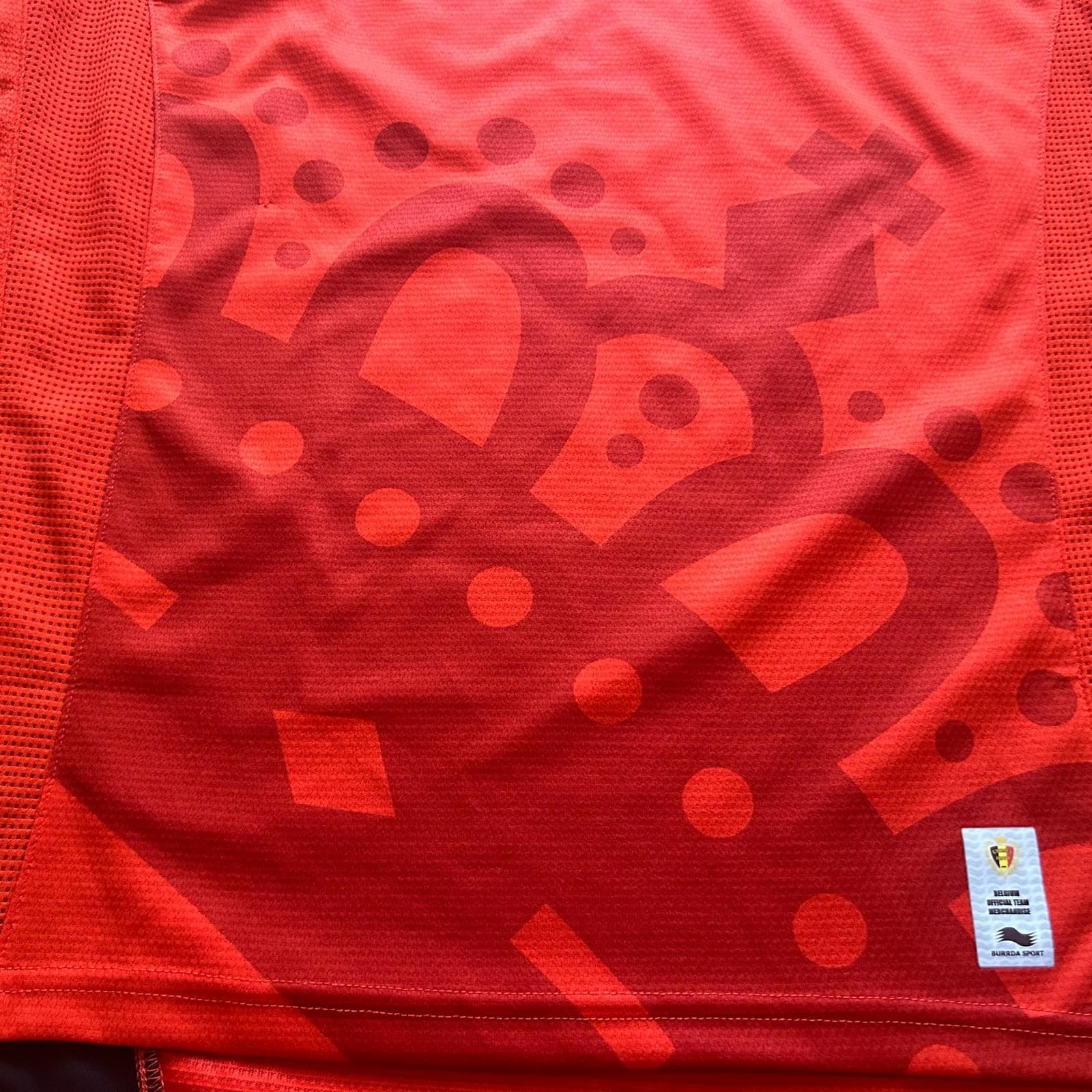 Primera equipación del equipo nacional de Bélgica usado en la Copa del Mundo de Brasil 2014. La selección belga alcanzó los cuartos de final, donde cayó derrotada ante Argentina. Diseño en rojo con detalles en negro y amarillo, con un gráfico de la corona real belga en la parte baja.