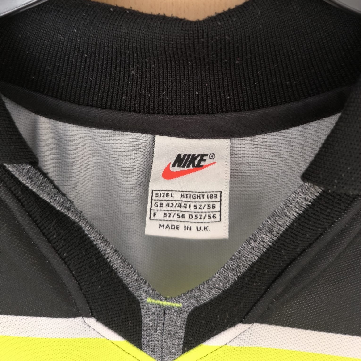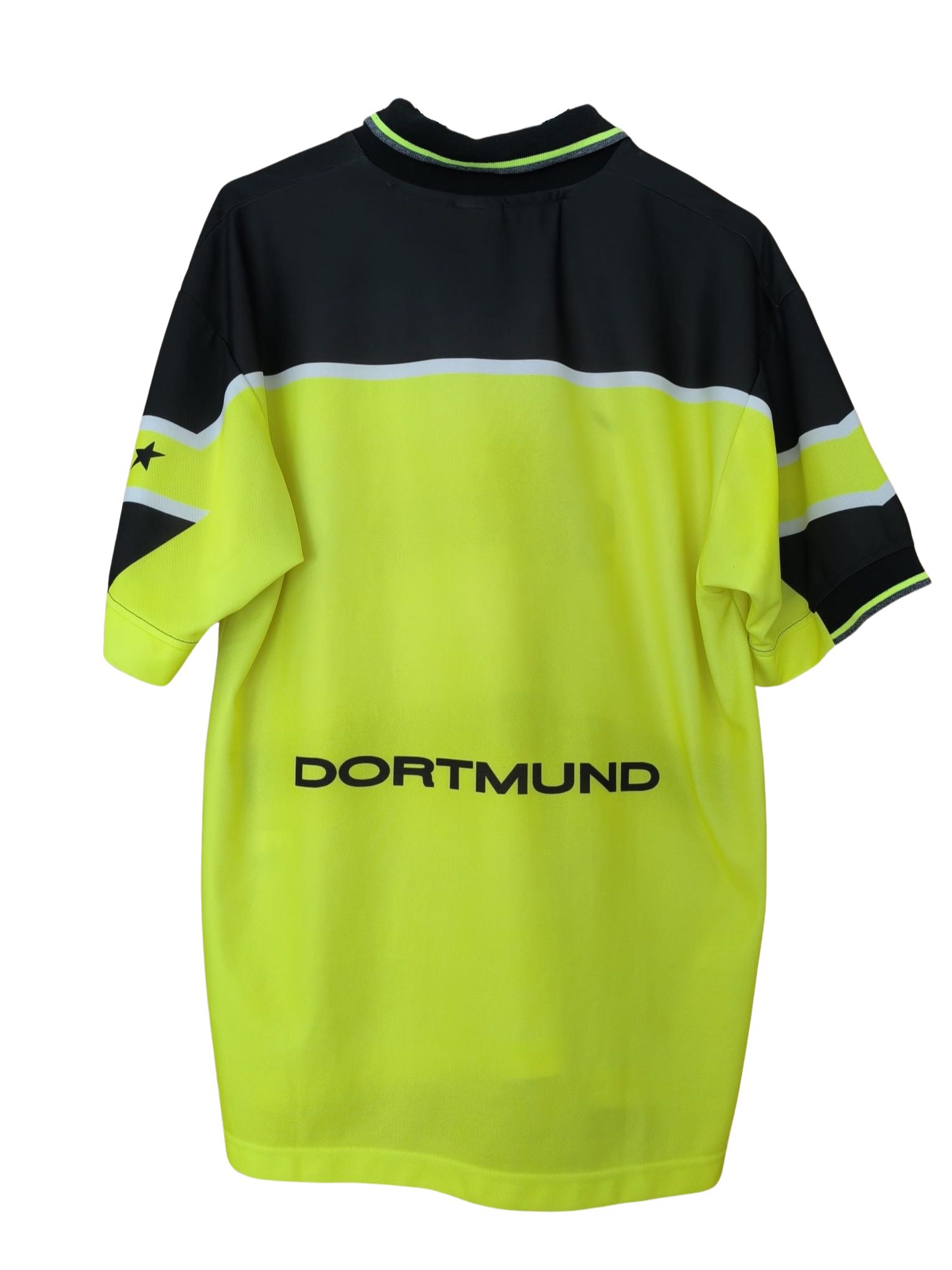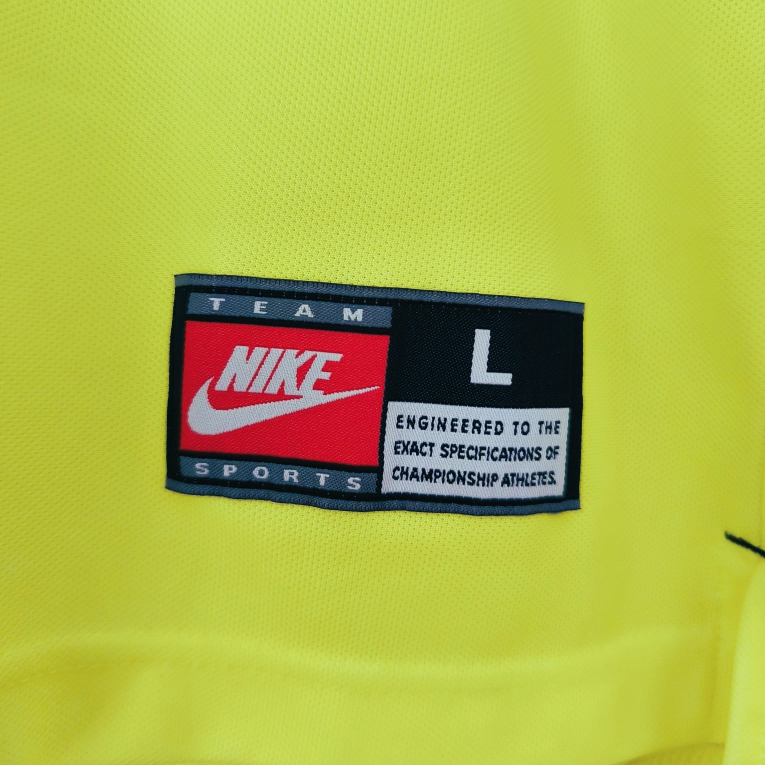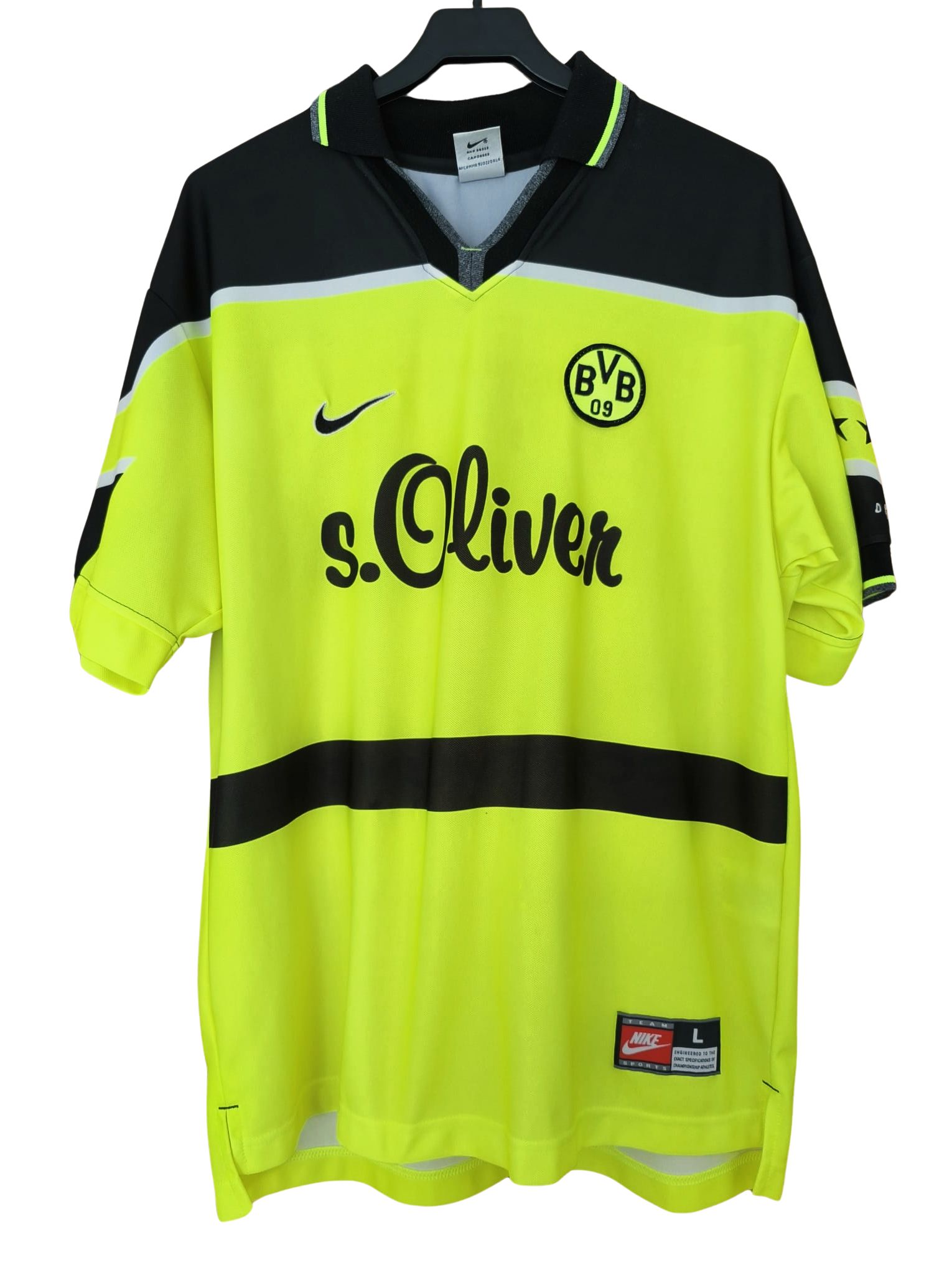 Camiseta del Borussia Dortmund para la temporada 1997-1998, diseñada por Nike. Utilizada en la Bundesliga, DFB-Pokal y Champions League, destaca por su característico diseño amarillo neón con detalles negros. En esta temporada, el club terminó 10º en la Bundesliga, alcanzó las semifinales de la Champions League y los octavos de la Copa de Alemania. El Borussia levantó el título de la Copa Intercontinental.