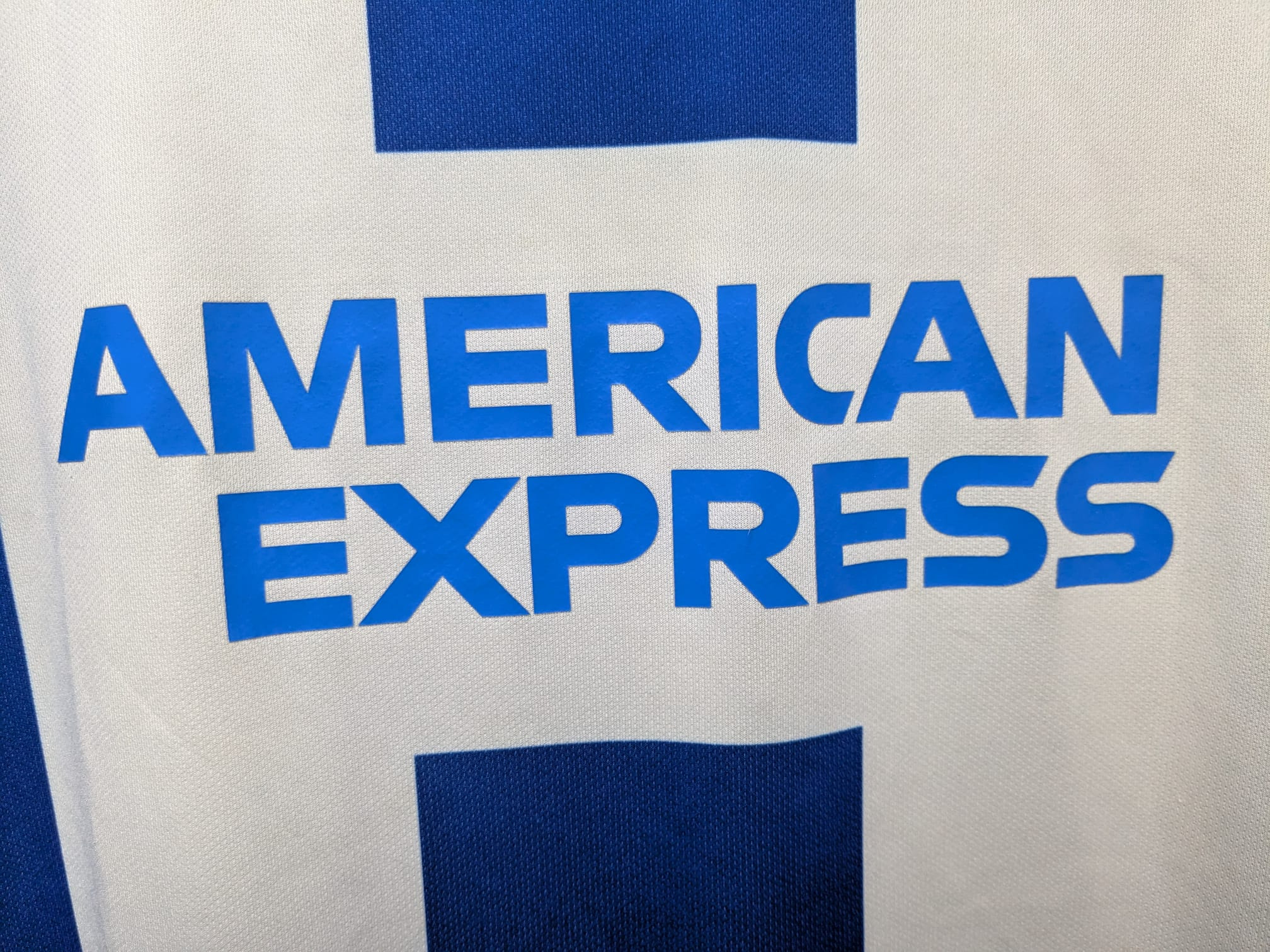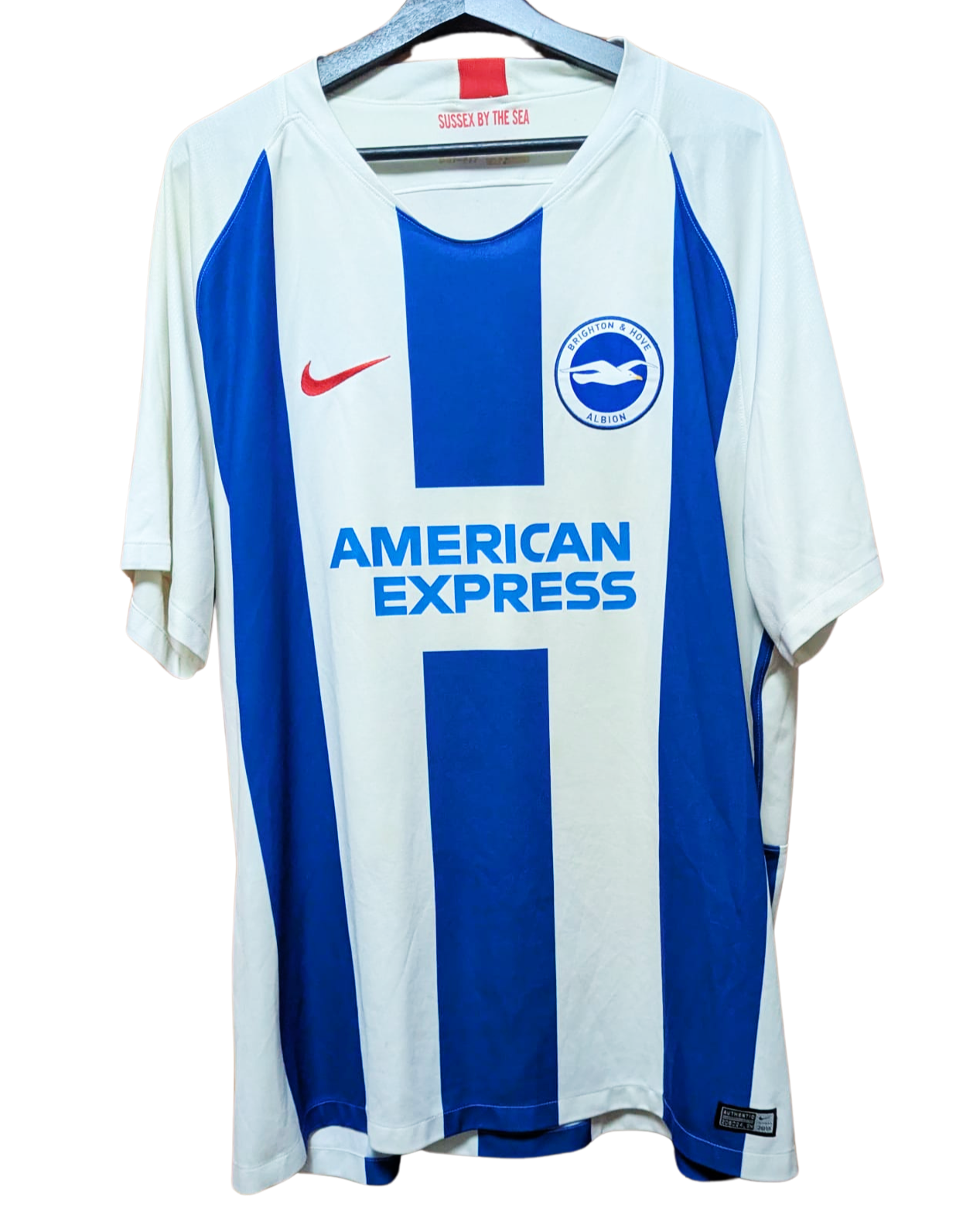 Camiseta local del Brighton & Hove Albion para la temporada 2018-2019, fabricada por Nike y patrocinada por American Express. El club logró una sufrida permanencia en la Premier League, finalizando en 17ª posición con 36 puntos, apenas dos por encima del descenso.