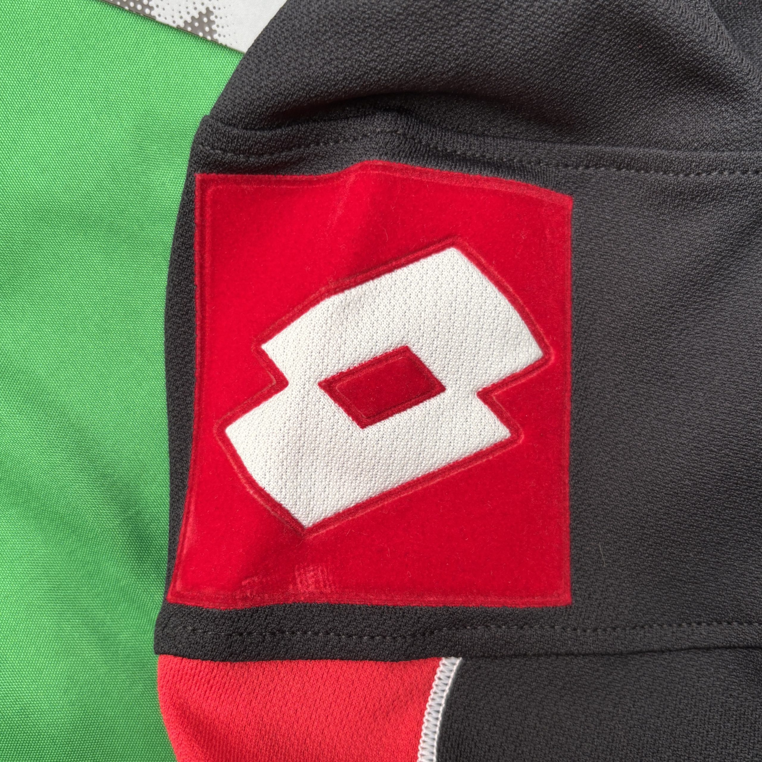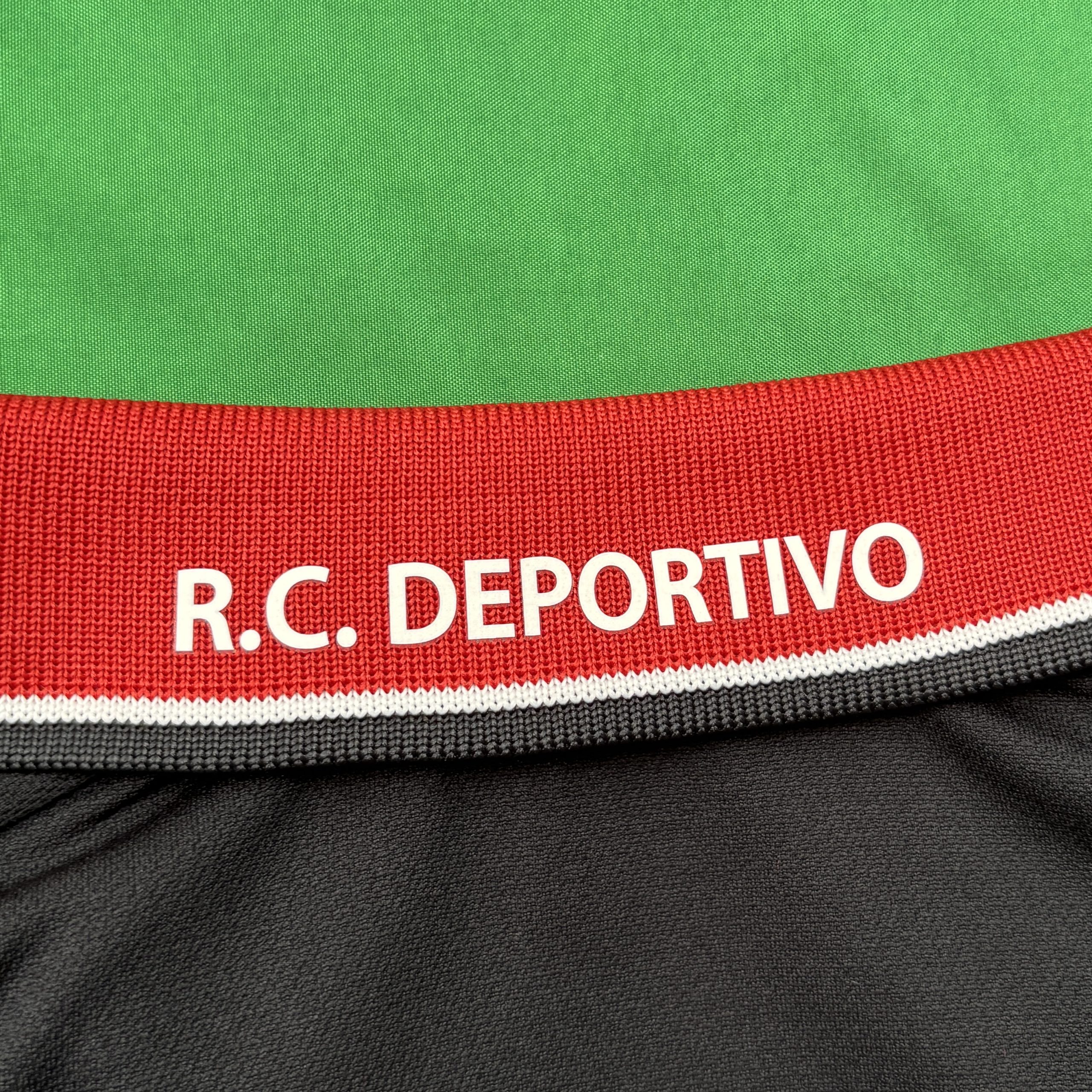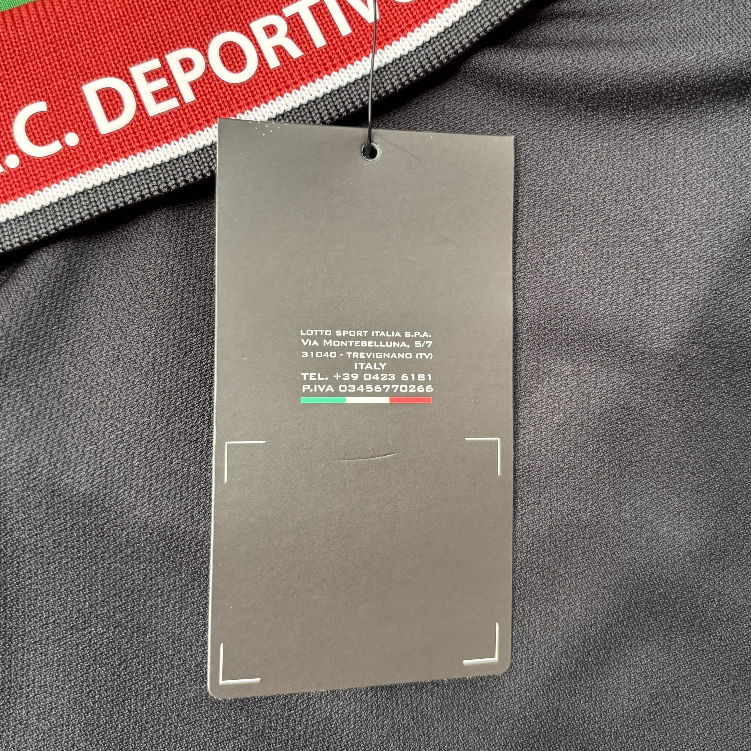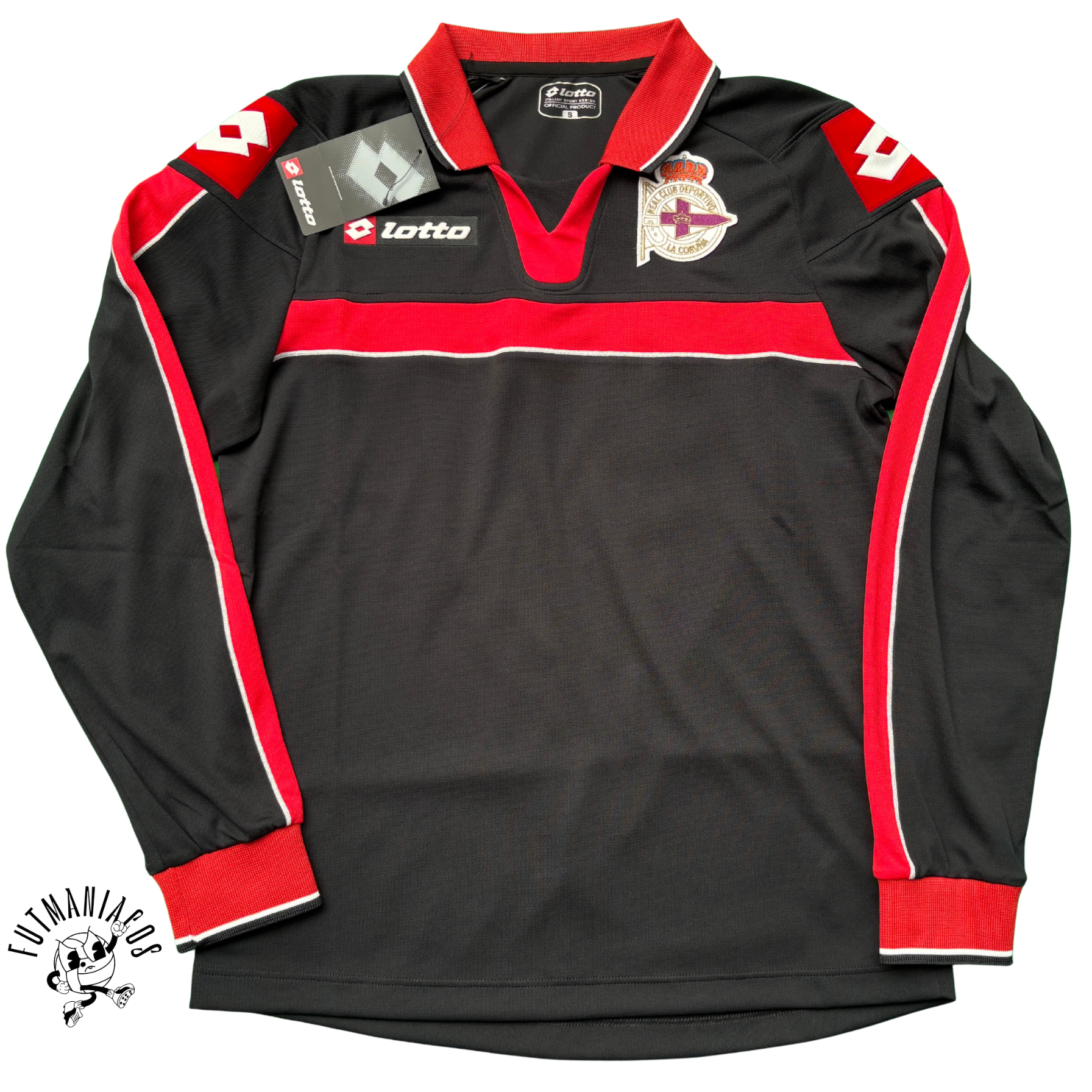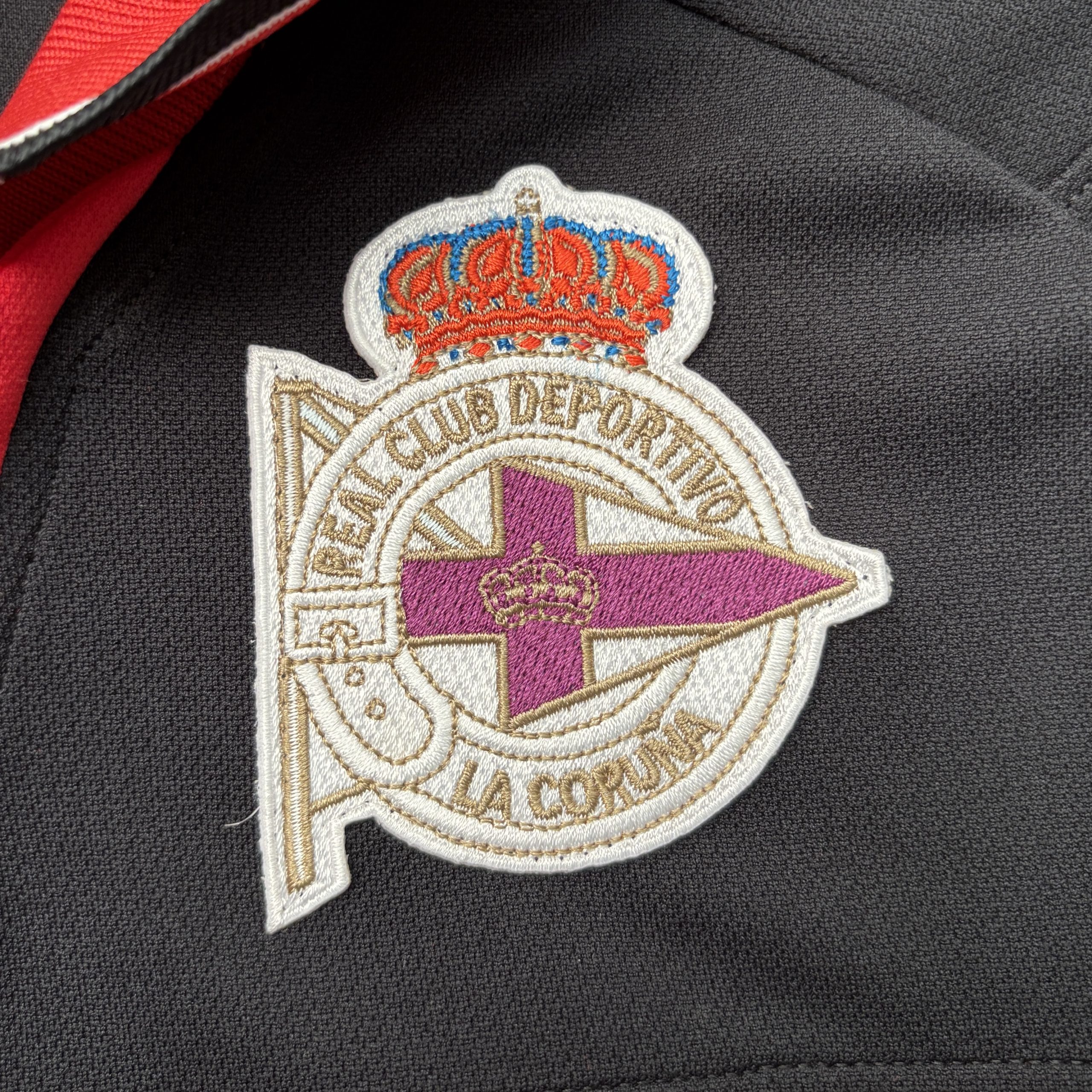La equipación visitante del Deportivo de La Coruña para la temporada 2012-2013, fabricada por Lotto, se caracteriza por un diseño negro con una franja horizontal roja en el pecho y detalles en las mangas. Esta camiseta, usada en una temporada de retorno a la élite, es un símbolo de una campaña muy difícil, ya que el equipo descendió a Segunda División al acabar 19º en LaLiga.