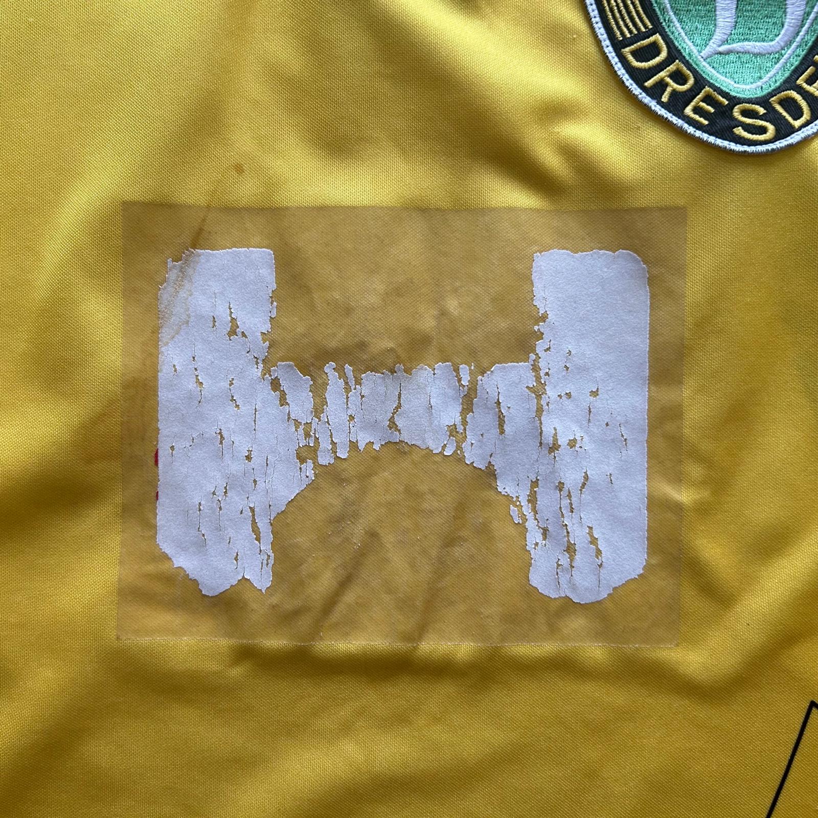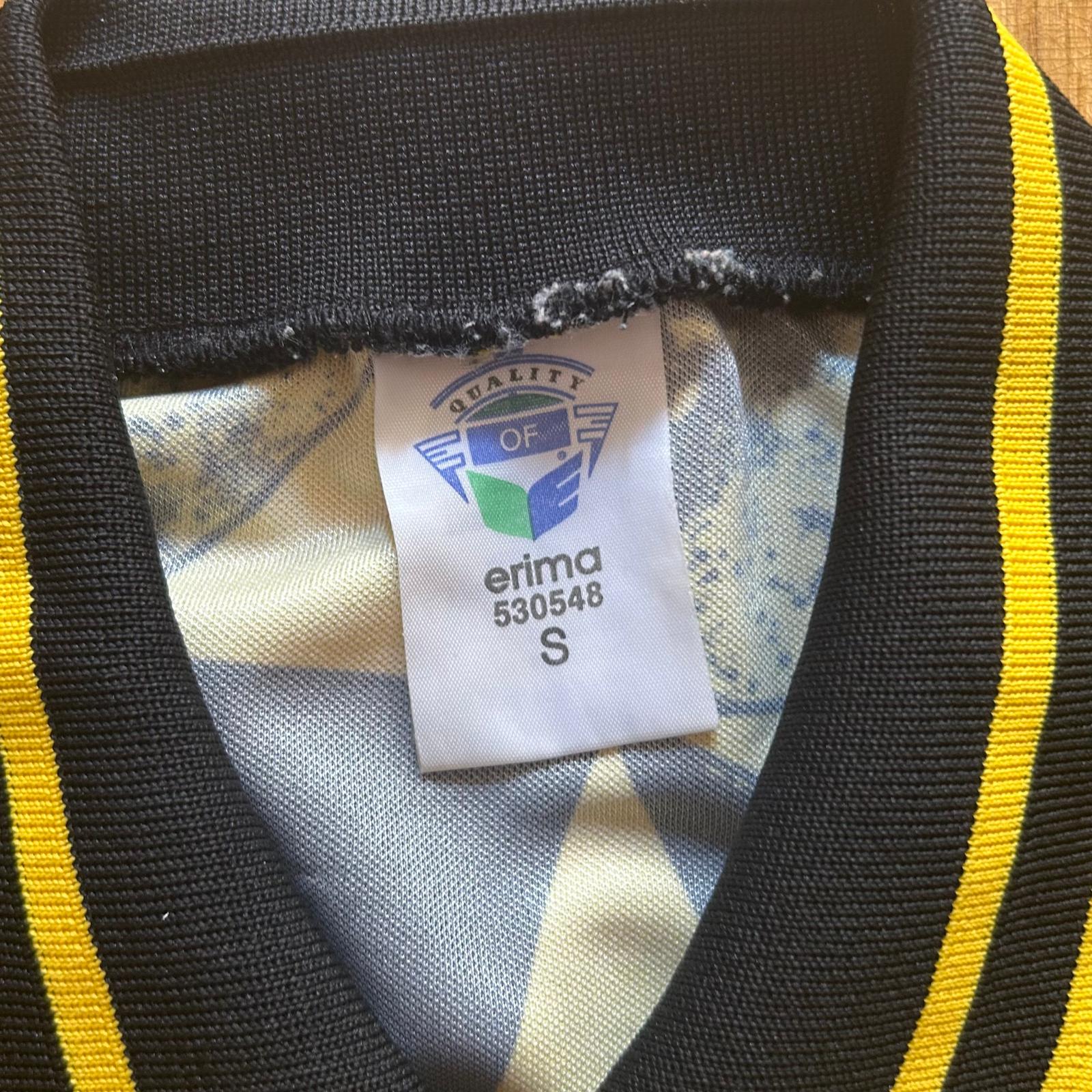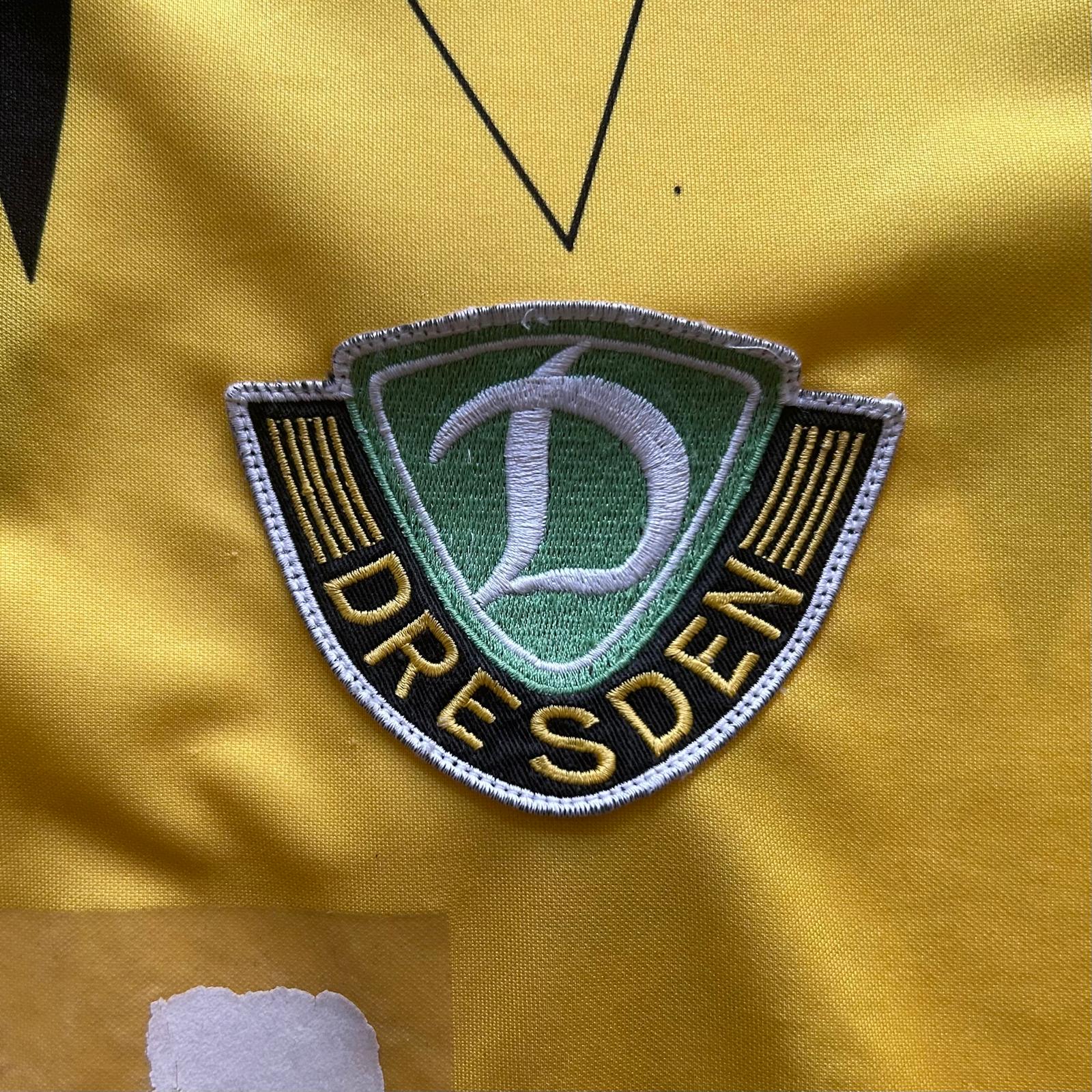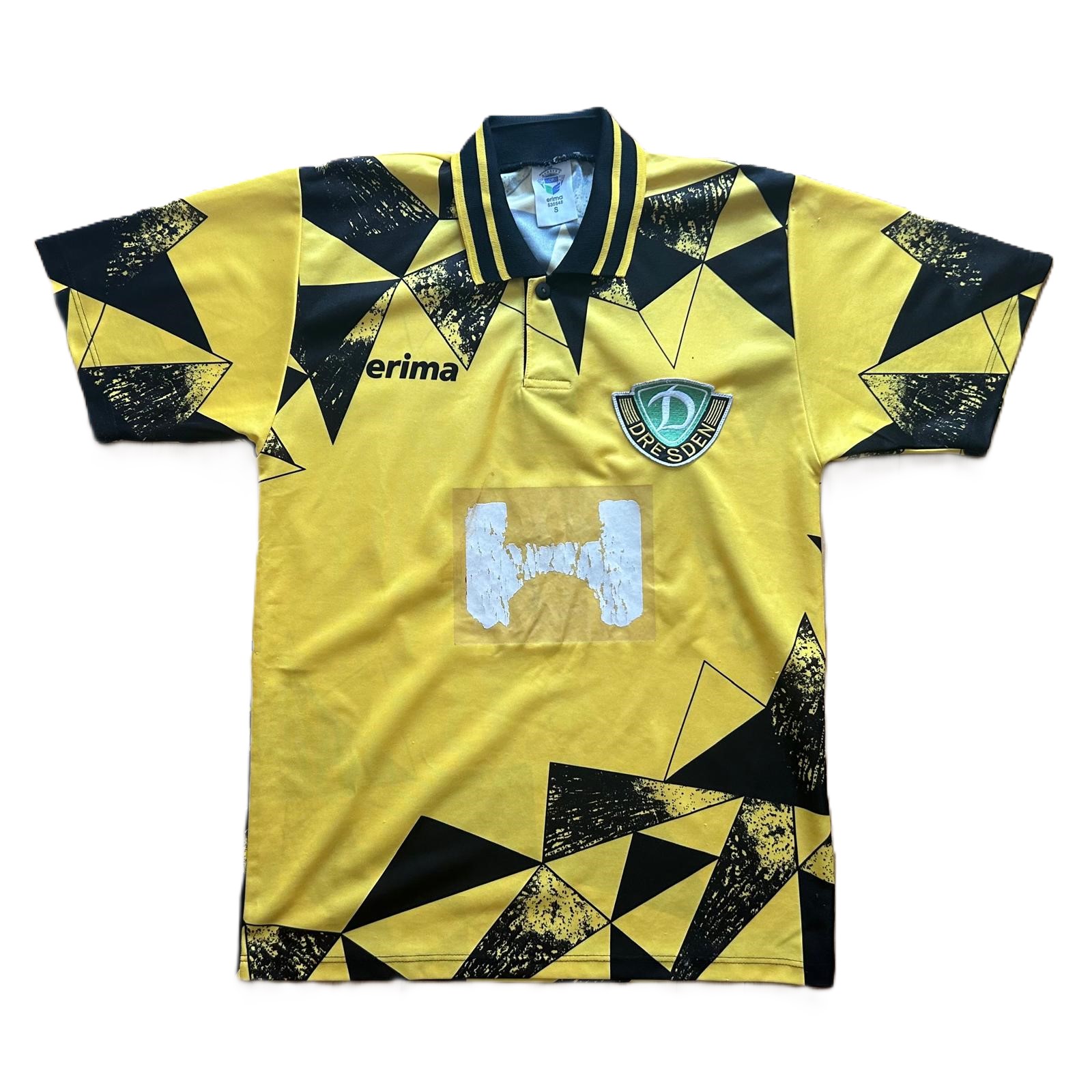 Camiseta local del Dynamo Dresden utilizada en la temporada 1995 – 1996 en la Regionalliga Nordost, la tercera división del fútbol alemán en aquella época. Fabricada por Erima, su diseño se caracteriza por un patrón geométrico en negro sobre la base amarilla, con detalles en el cuello a rayas negras y amarillas.