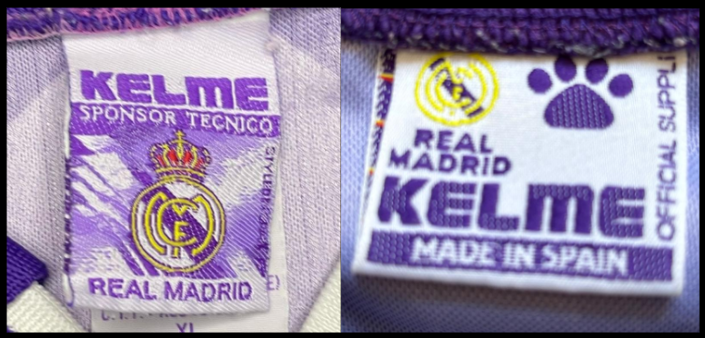 Las etiquetas del Real Madrid muestran variaciones significativas según el origen de fabricación. Mantienen el escudo del club y la marca Kelme como protagonistas, pero difieren en el fondo y los textos adicionales.