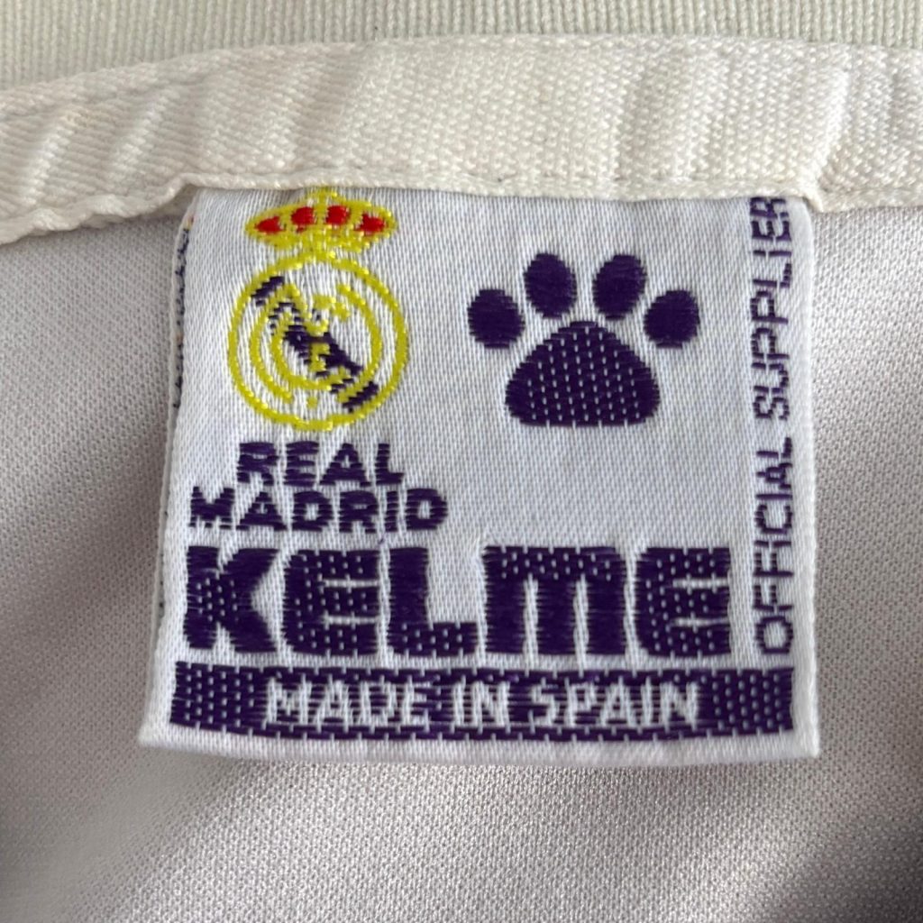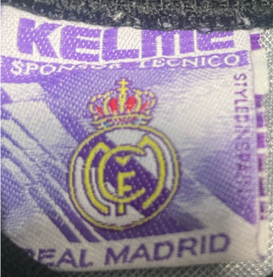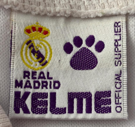 - Tipo «Made in Spain»: Caracterizada por un fondo más sencillo, incluye el escudo del Real Madrid y la garra Kelme. Los textos principales son «Real Madrid», «Kelme», «Official Supplier» y la indicación «Made in Spain».