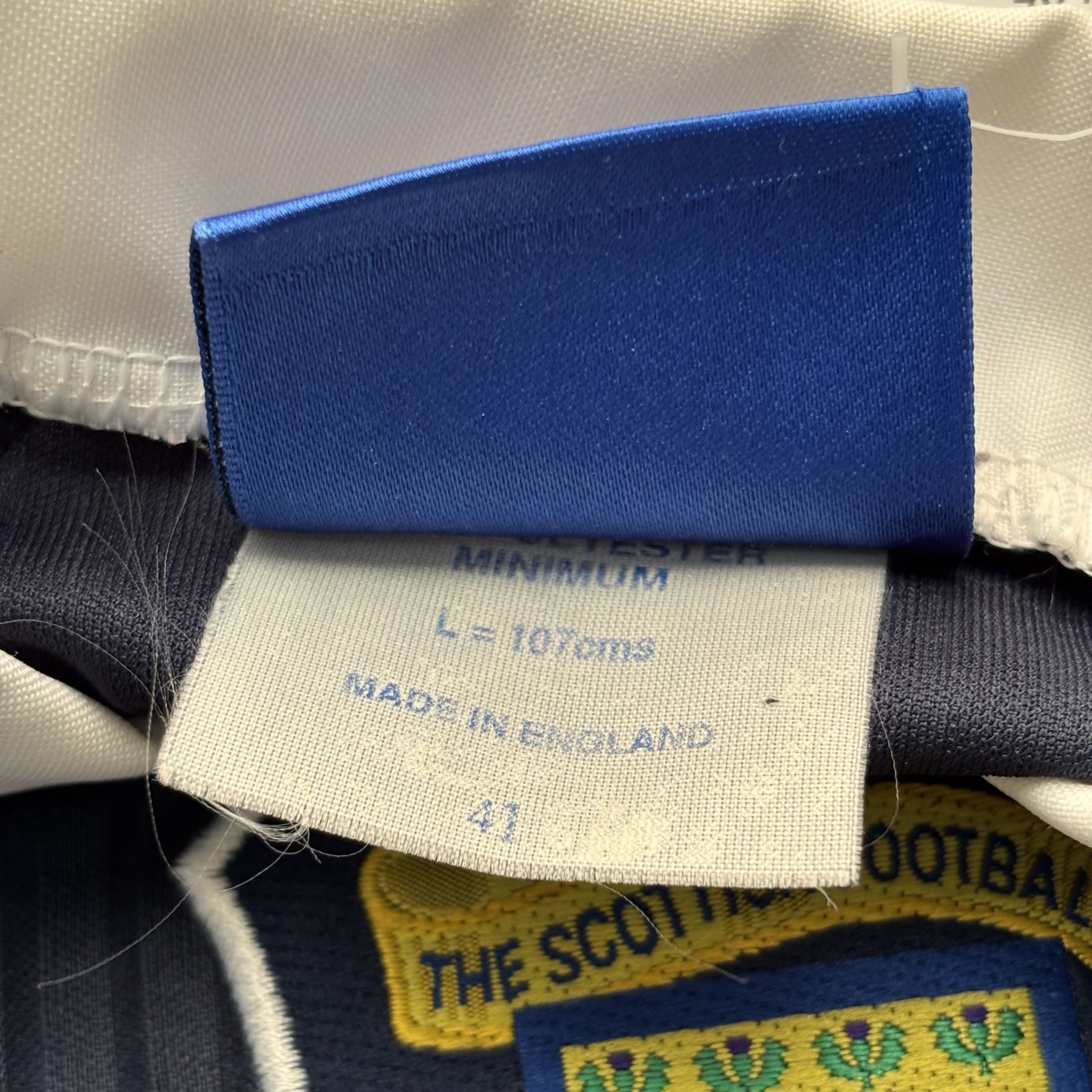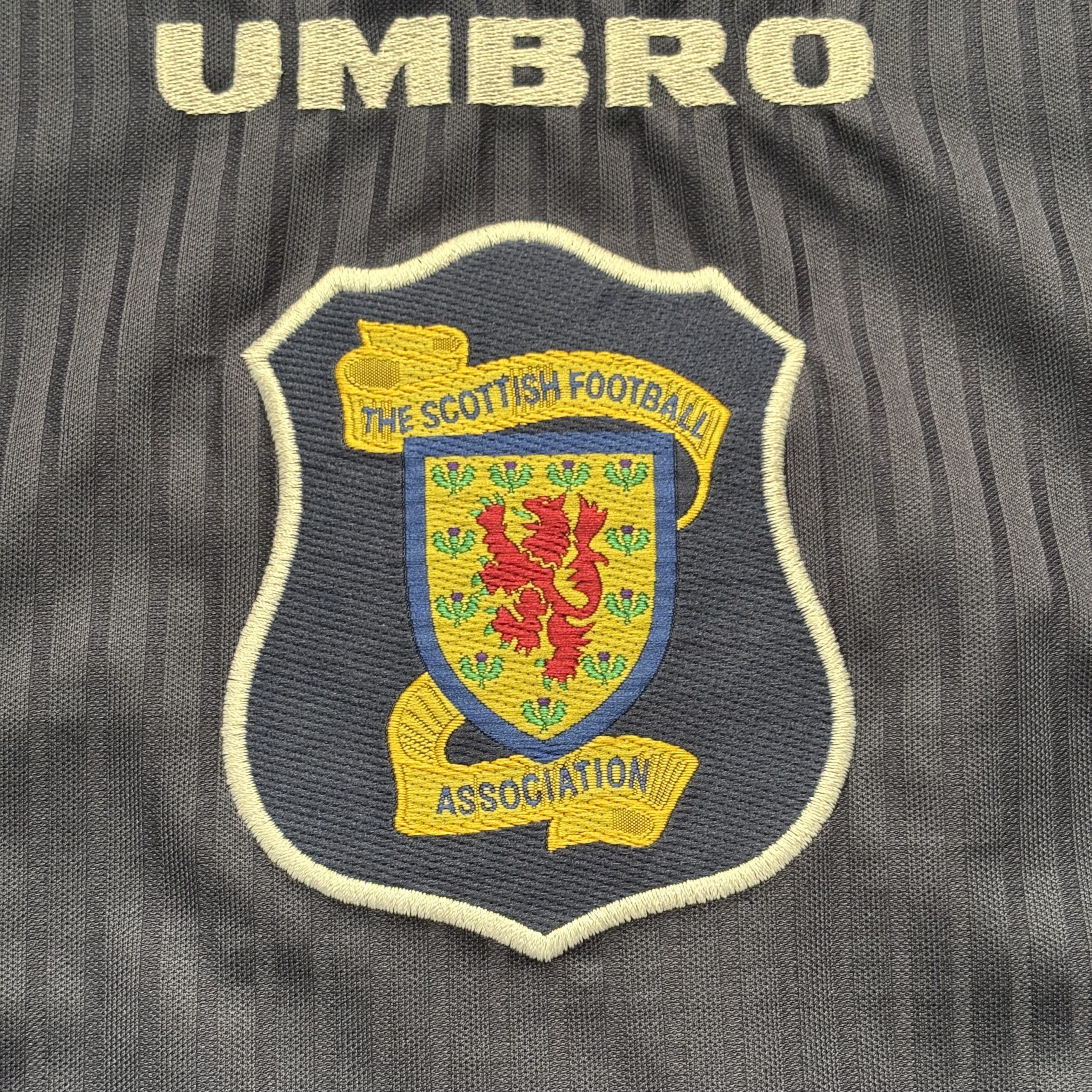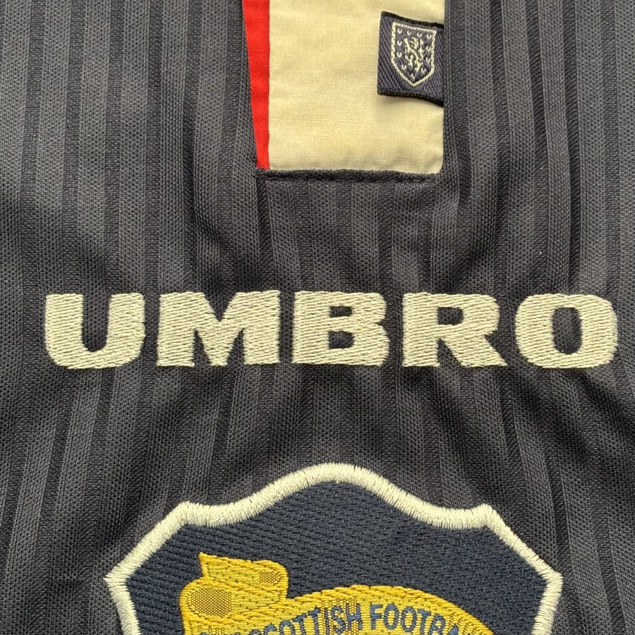 Camiseta local de la selección de Escocia lanzada en 1997, fabricada por Umbro en azul marino con cuello blanco y detalles rojos, siguiendo la línea clásica de la marca en los años noventa. El diseño incorporó paneles verticales muy sutiles y el escudo bordado de la Scottish FA. Con este modelo, Escocia disputó la fase de clasificación para el Mundial de Francia 1998, competición en la que logró el billete directo tras finalizar segunda en el Grupo 4, por detrás de Austria y por delante de Suecia y Letonia. Aportación de Futmaniacos.