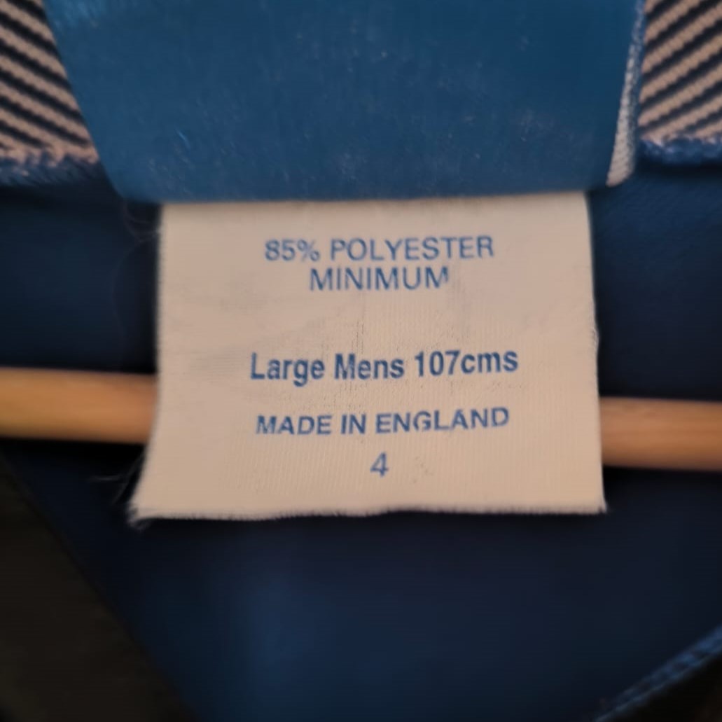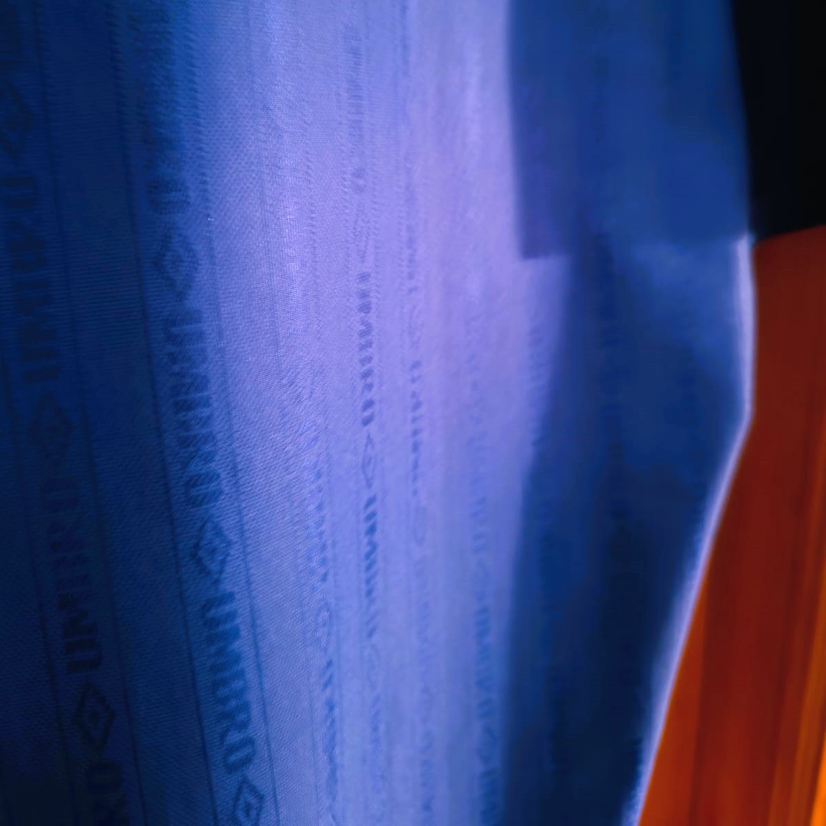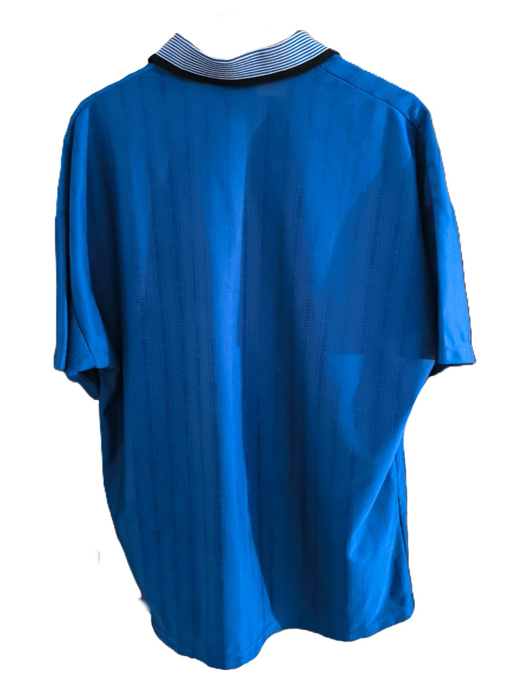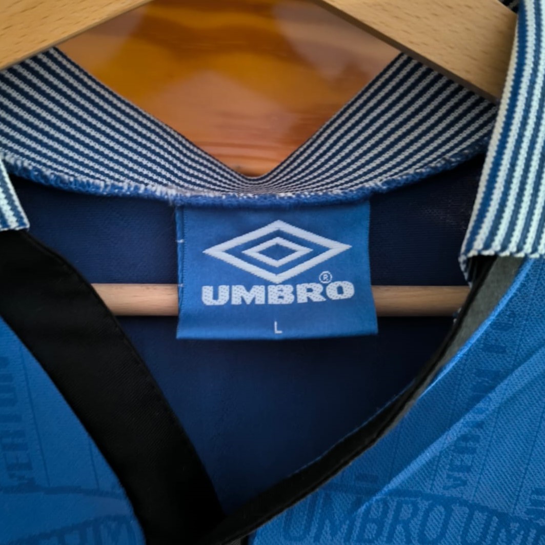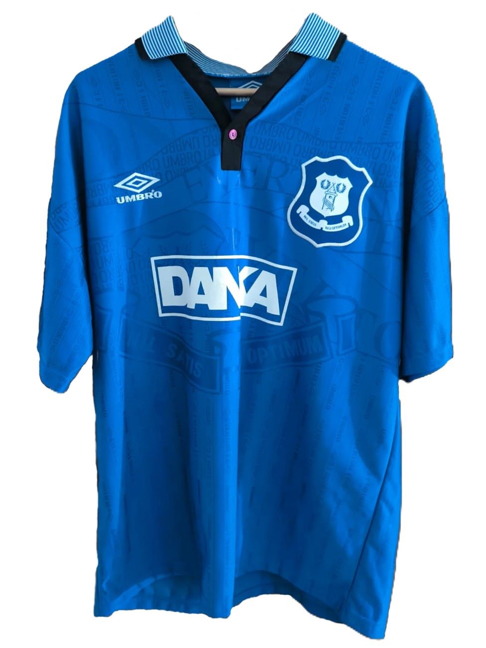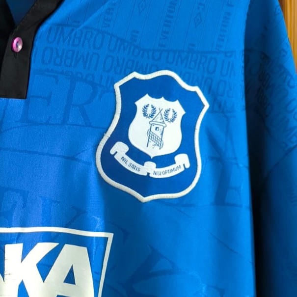 Esta camiseta azul royal, confeccionada por Umbro, fue utilizada por el Everton durante dos temporadas consecutivas. Presenta un cuello negro con cierre de botones y el logo del patrocinador DANA en el centro del pecho. Además, el escudo del club está bordado en la parte superior izquierda, y el diseño incluye un sutil patrón con detalles del escudo en el fondo de la tela.