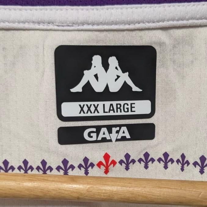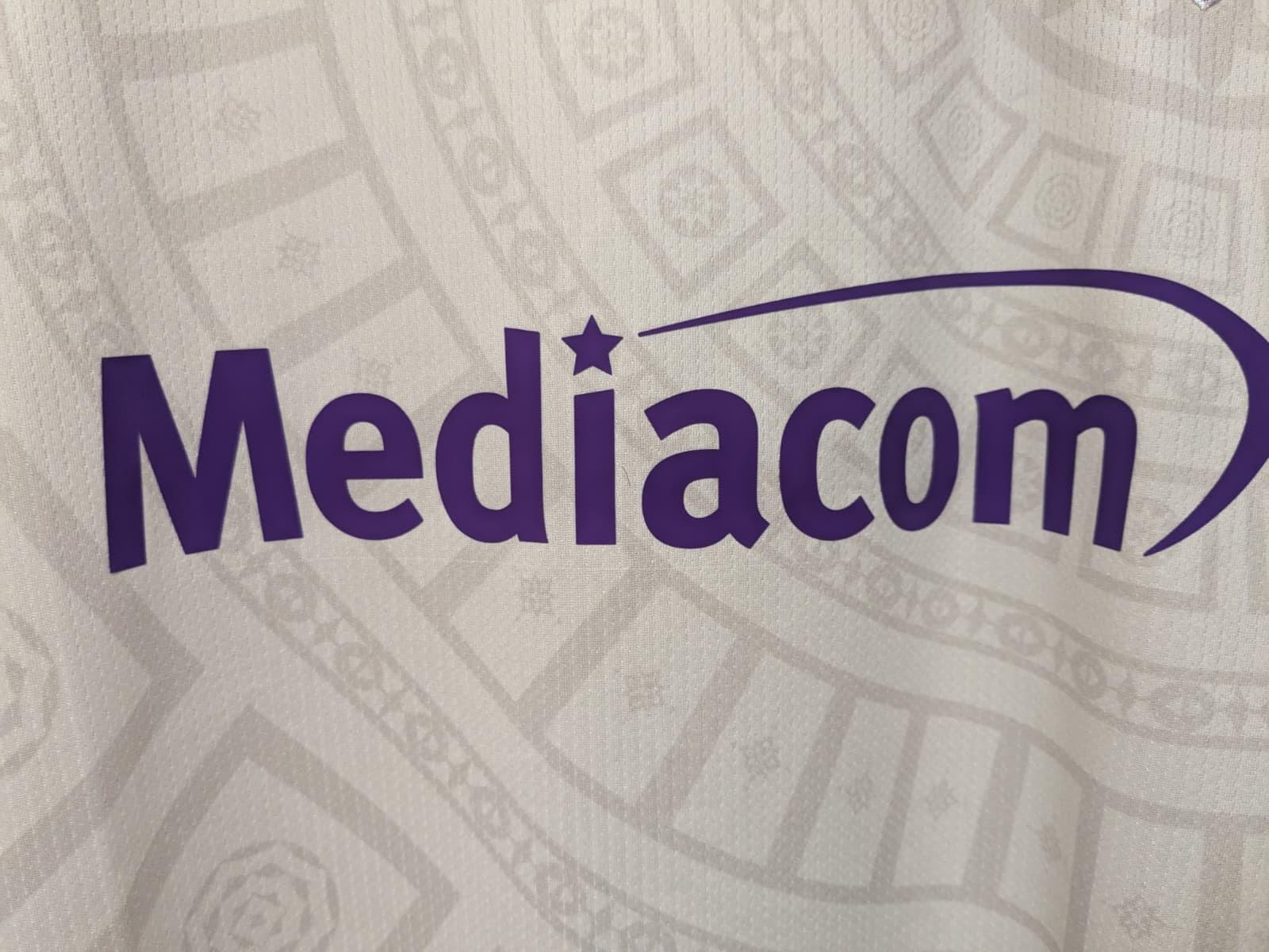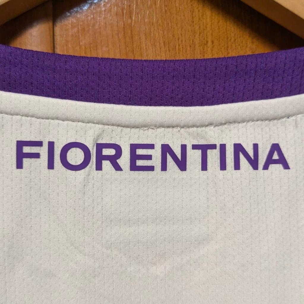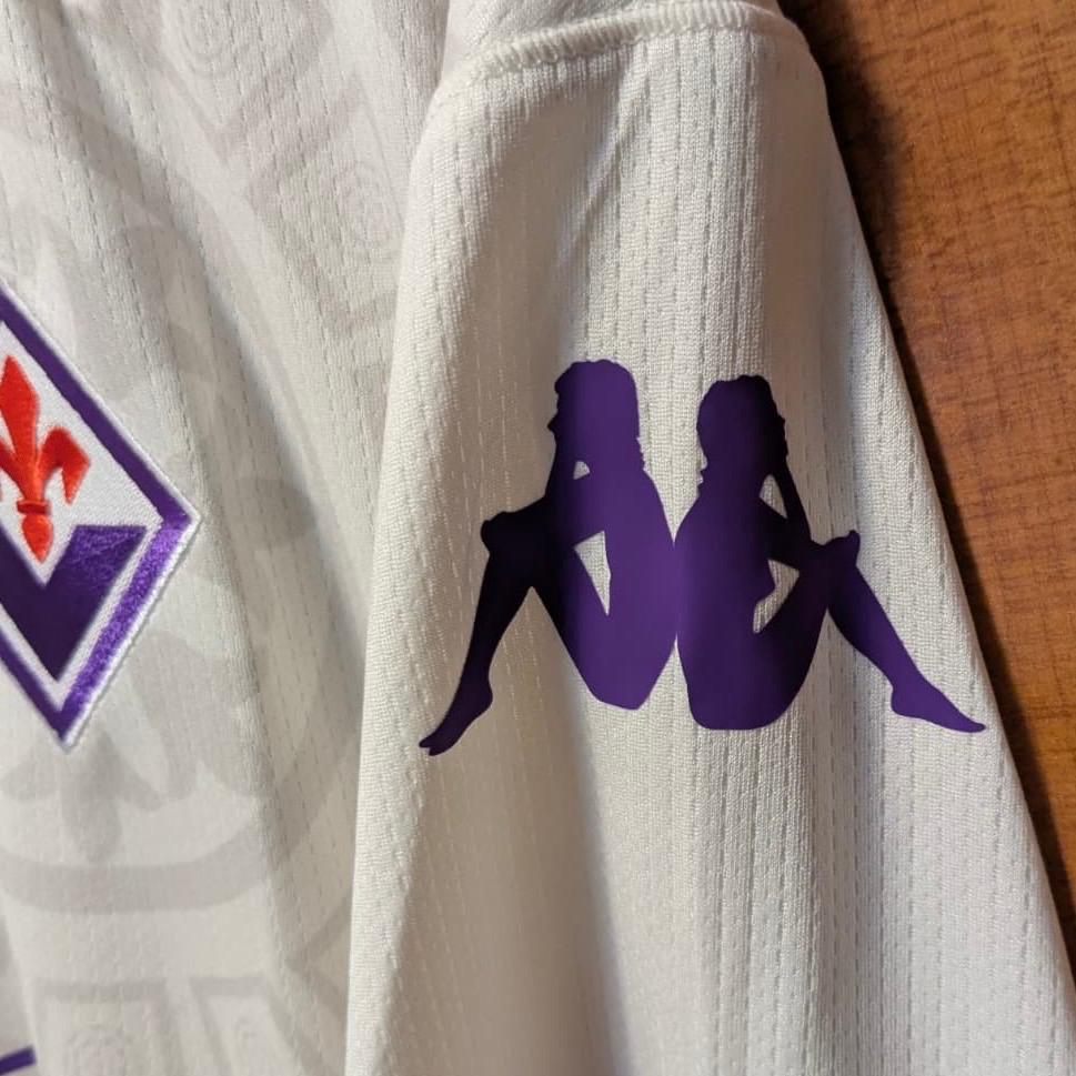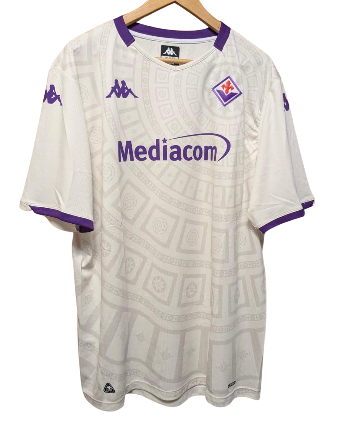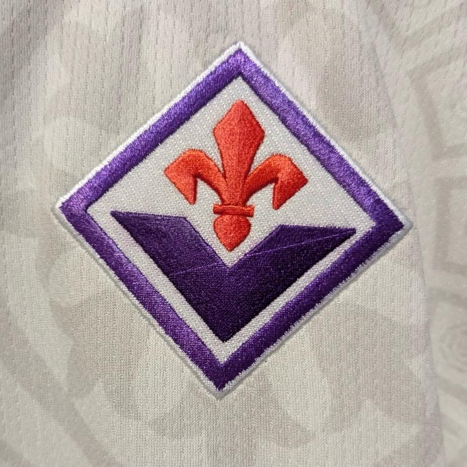 El diseño presenta un cuello redondo y puños en color morado, a juego con los logotipos de Kappa y el escudo del club. En la parte delantera, el patrocinador principal, «Mediacom», está impreso en negro. El patrón gráfico que cubre toda la camiseta no es aleatorio: se basa en un diseño de inspiración renacentista, con formas circulares y ornamentos que rinden homenaje a la rica historia artística y cultural de la ciudad de Florencia.