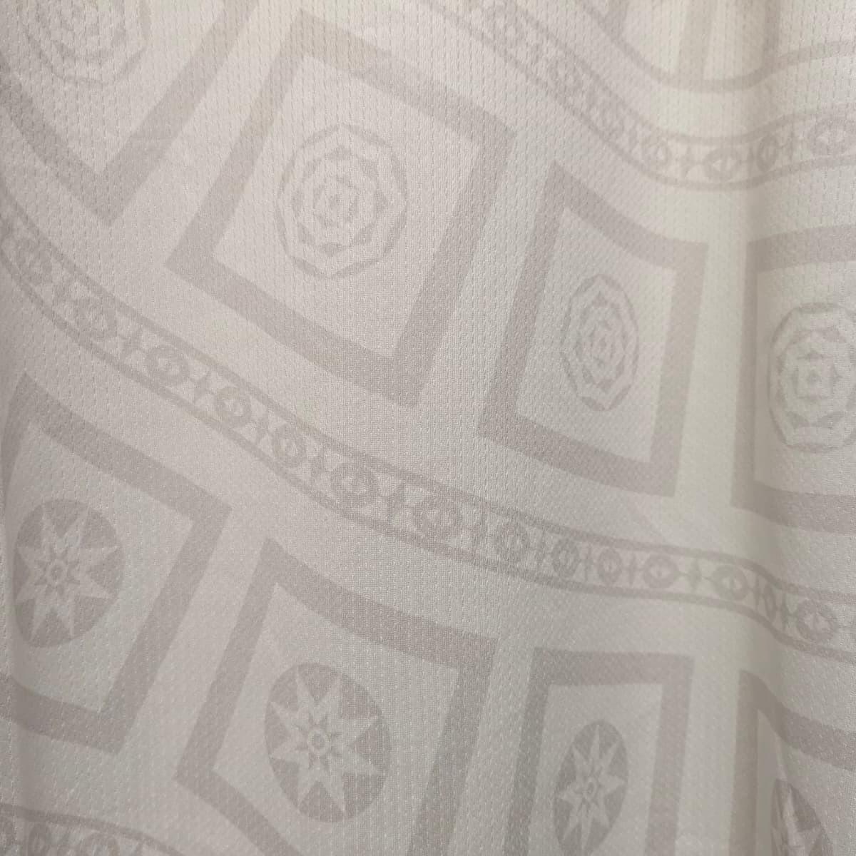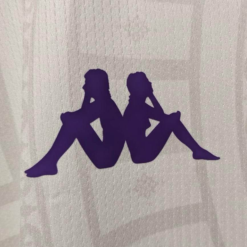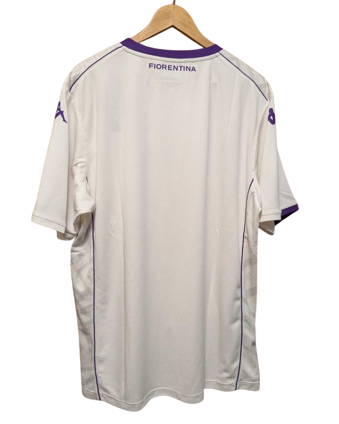 Esta es la segunda equipación que el ACF Fiorentina utilizará durante la temporada 2025-2026. Fabricada por Kappa, la camiseta se caracteriza por su diseño predominantemente blanco, que sirve como un lienzo para un patrón gráfico sutil en un tono más claro, con los logos principales en color morado, destacando sobre la prenda.