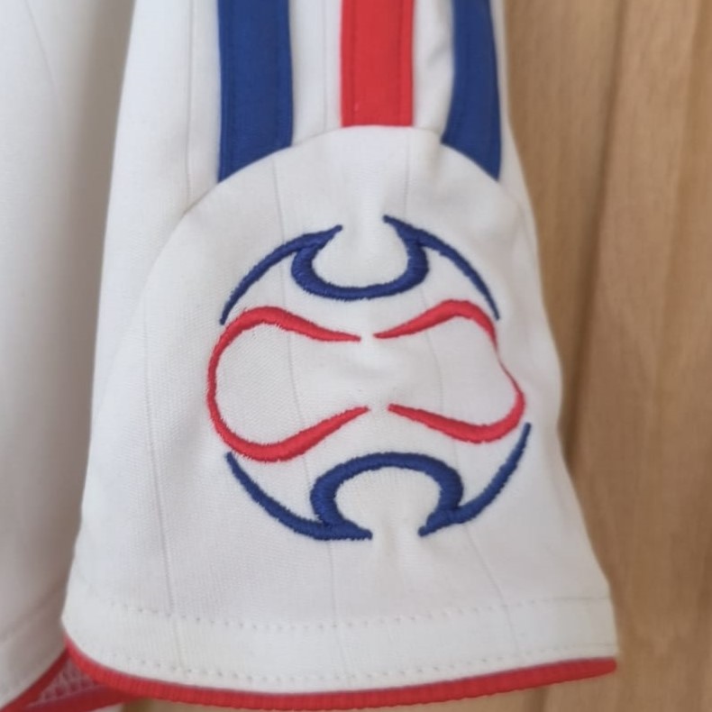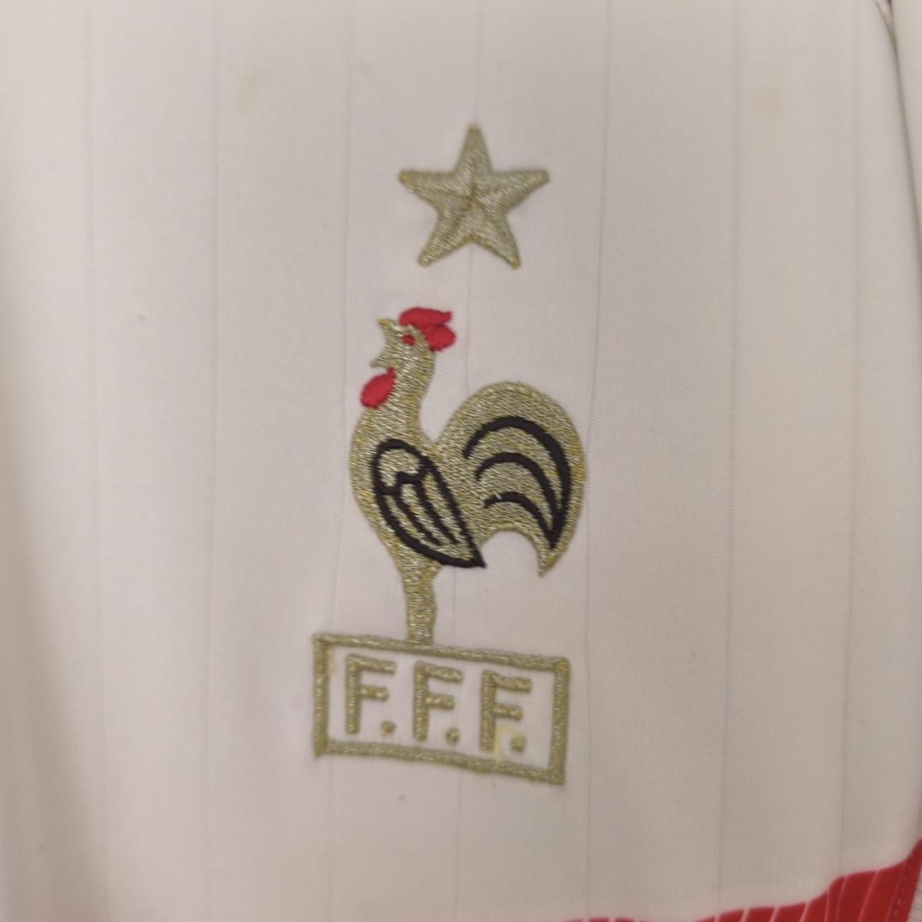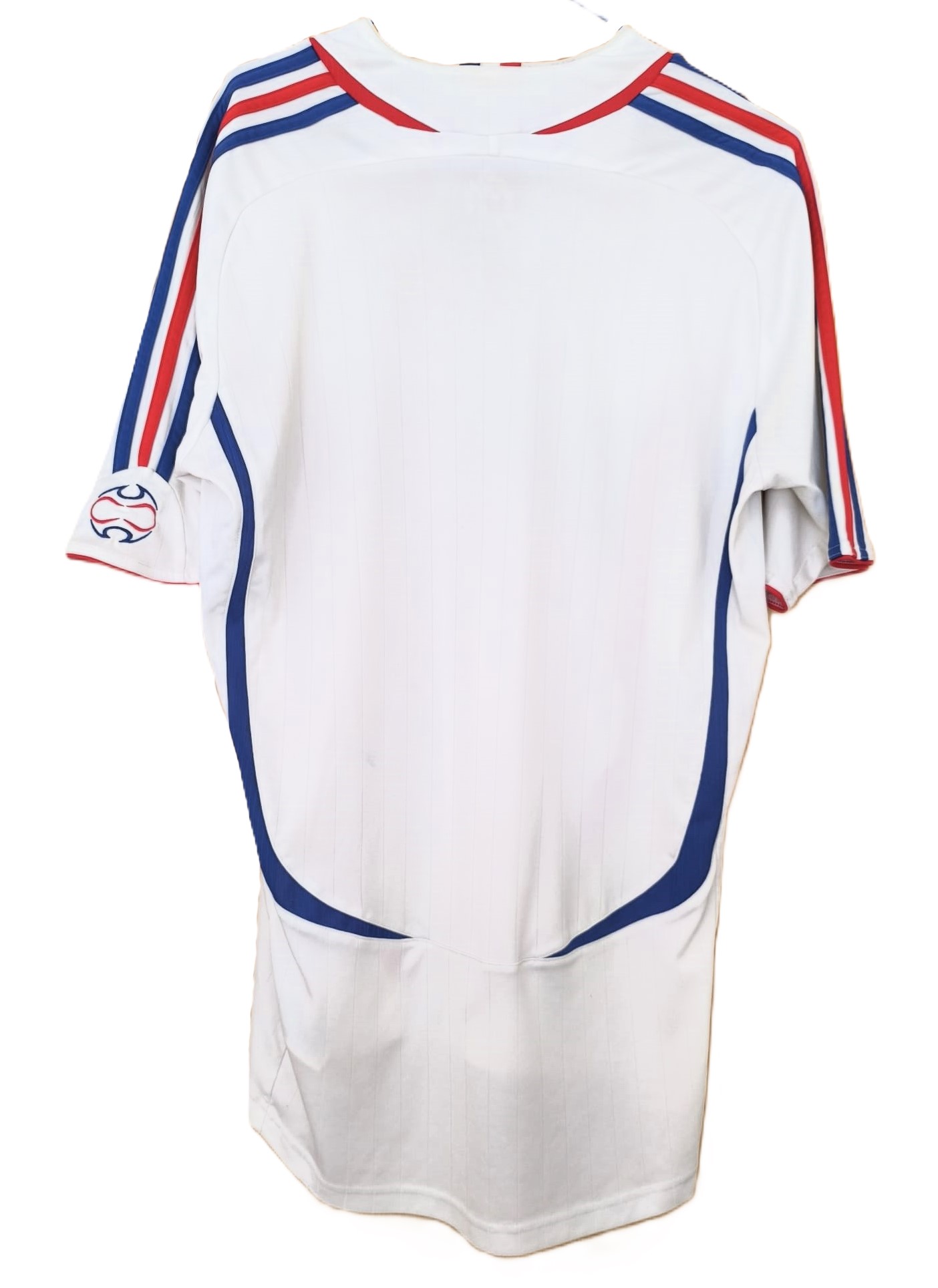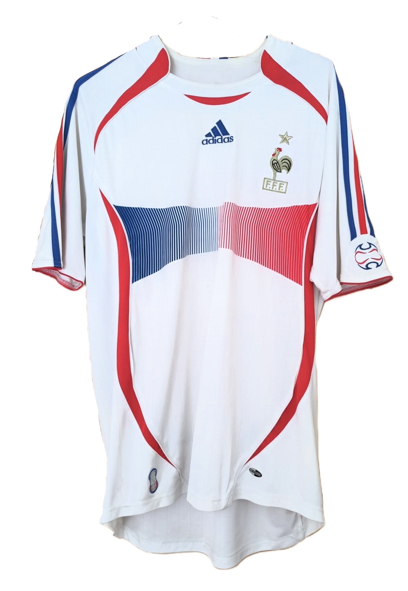 Camiseta visitante de la selección de Francia utilizada entre 2006 y 2008, diseñada por Adidas. Predominantemente blanca, con detalles en azul y rojo en el pecho, evocando la bandera francesa. Se usó en el Copa Mundial de 2006, donde el equipo alcanzó la final, cayendo ante Italia en penales (5-3) tras un empate 1-1 en el tiempo reglamentario.