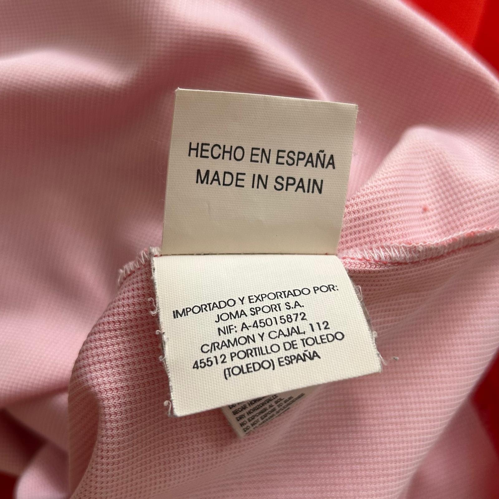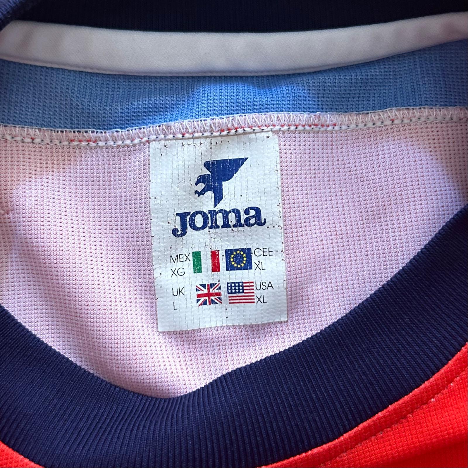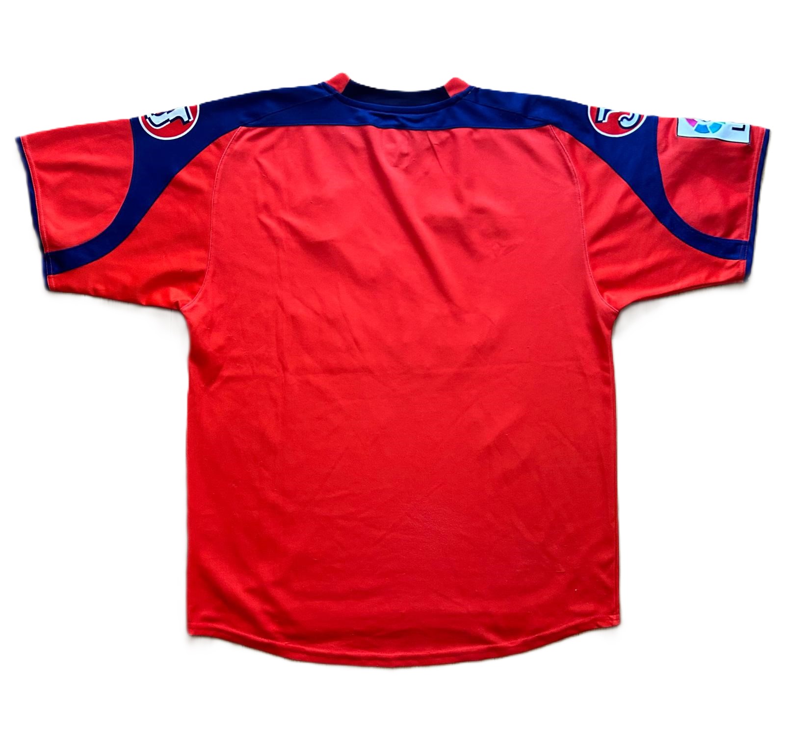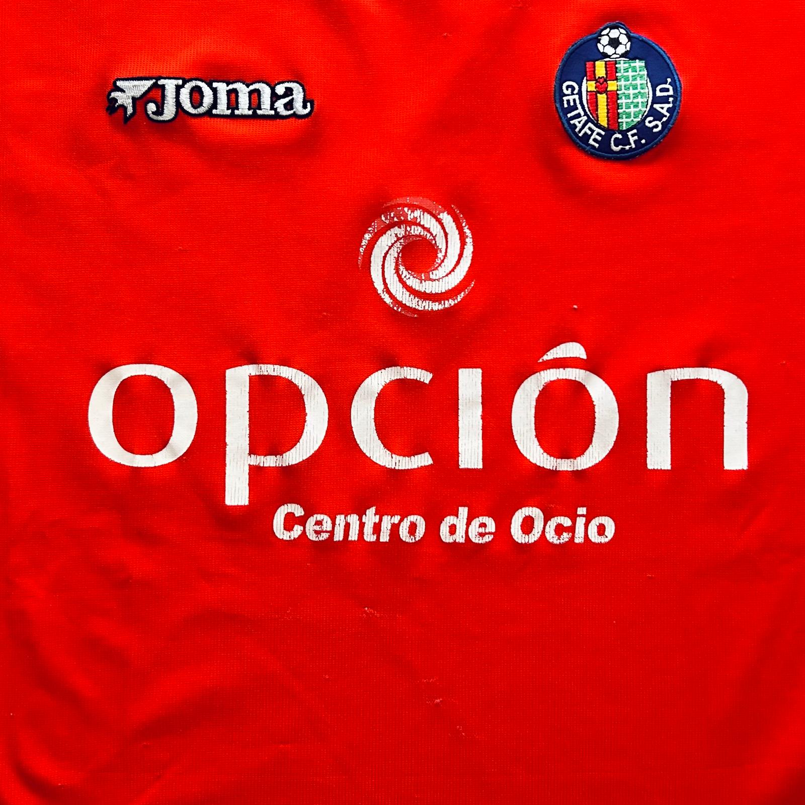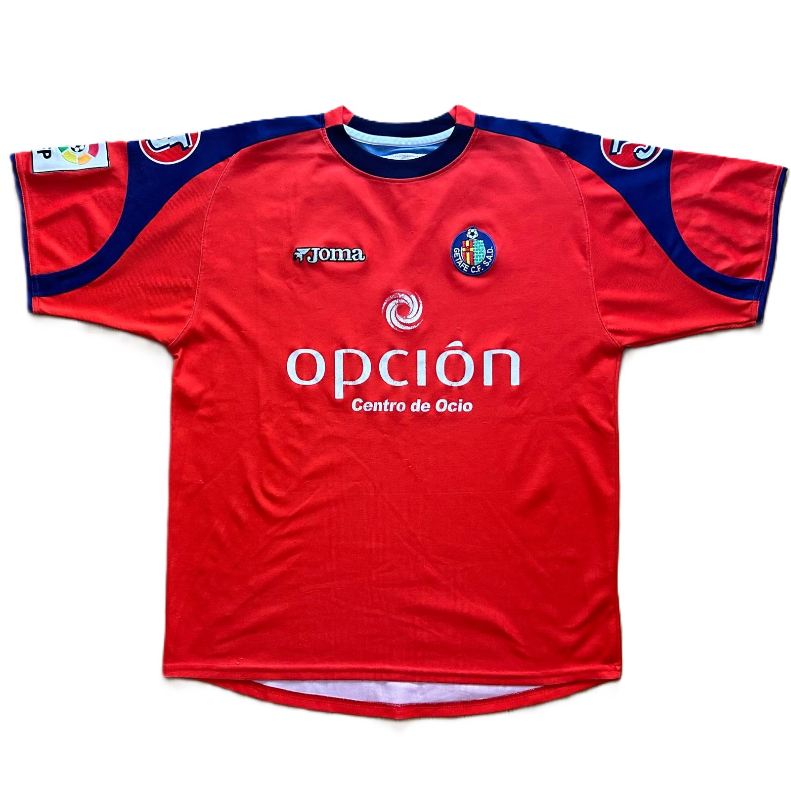 Camiseta local del Getafe en su histórica primera temporada en LaLiga (2004-2005). Fabricada por Joma y con el patrocinio de Opción Centro de Ocio, este diseño en rojo y azul marino simboliza el estreno del club en la máxima categoría del fútbol español.
