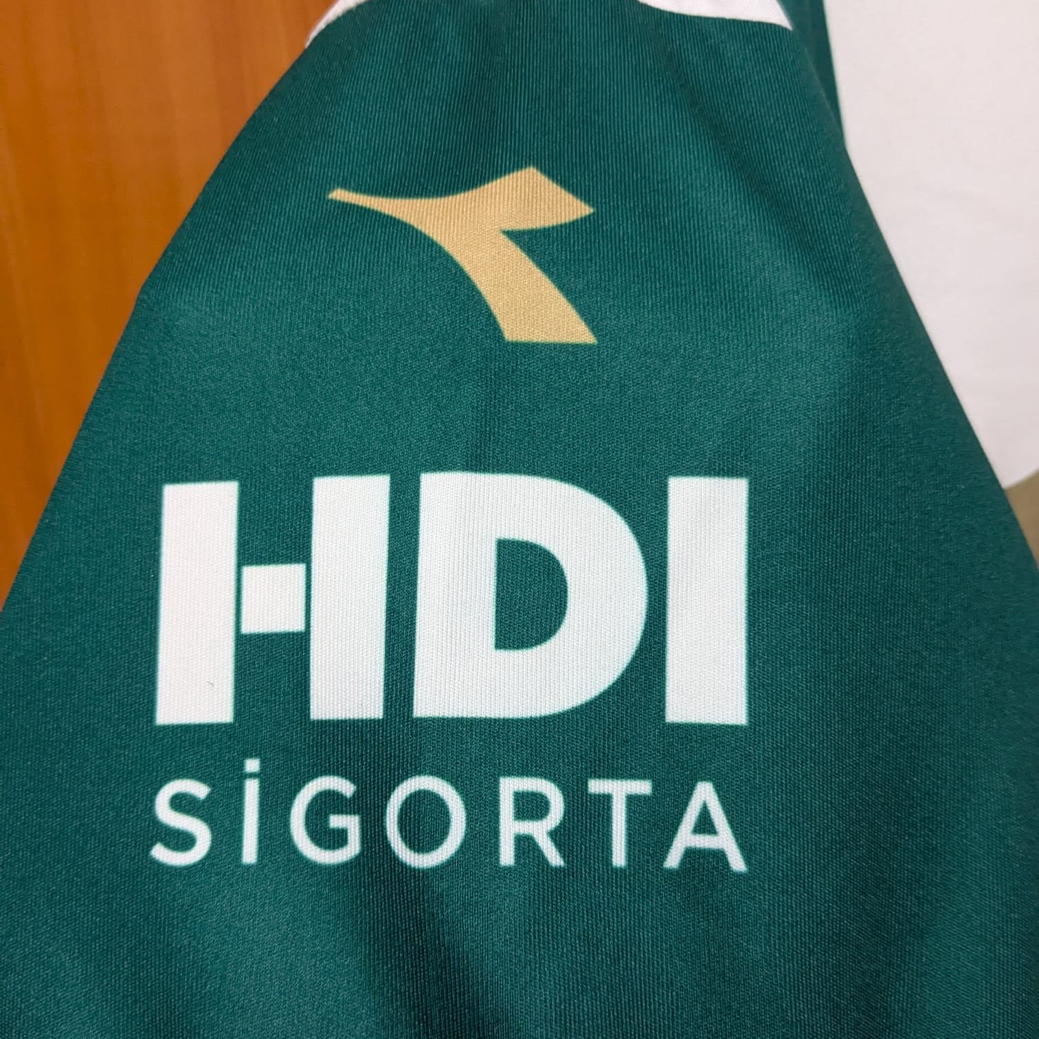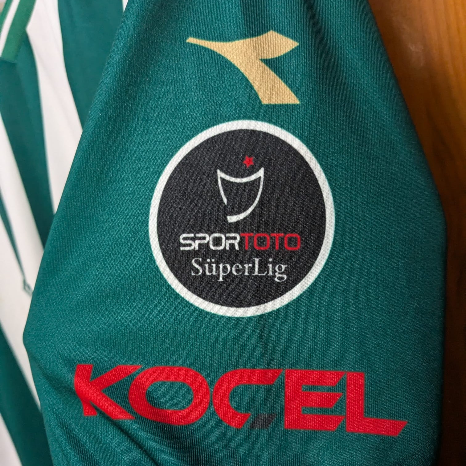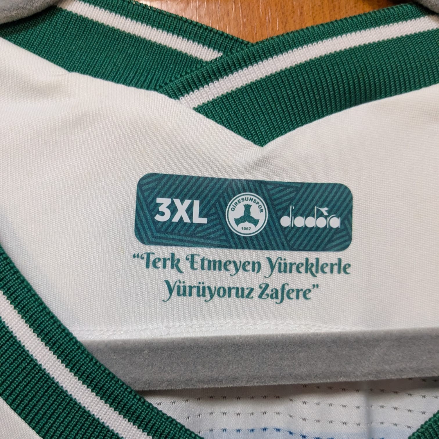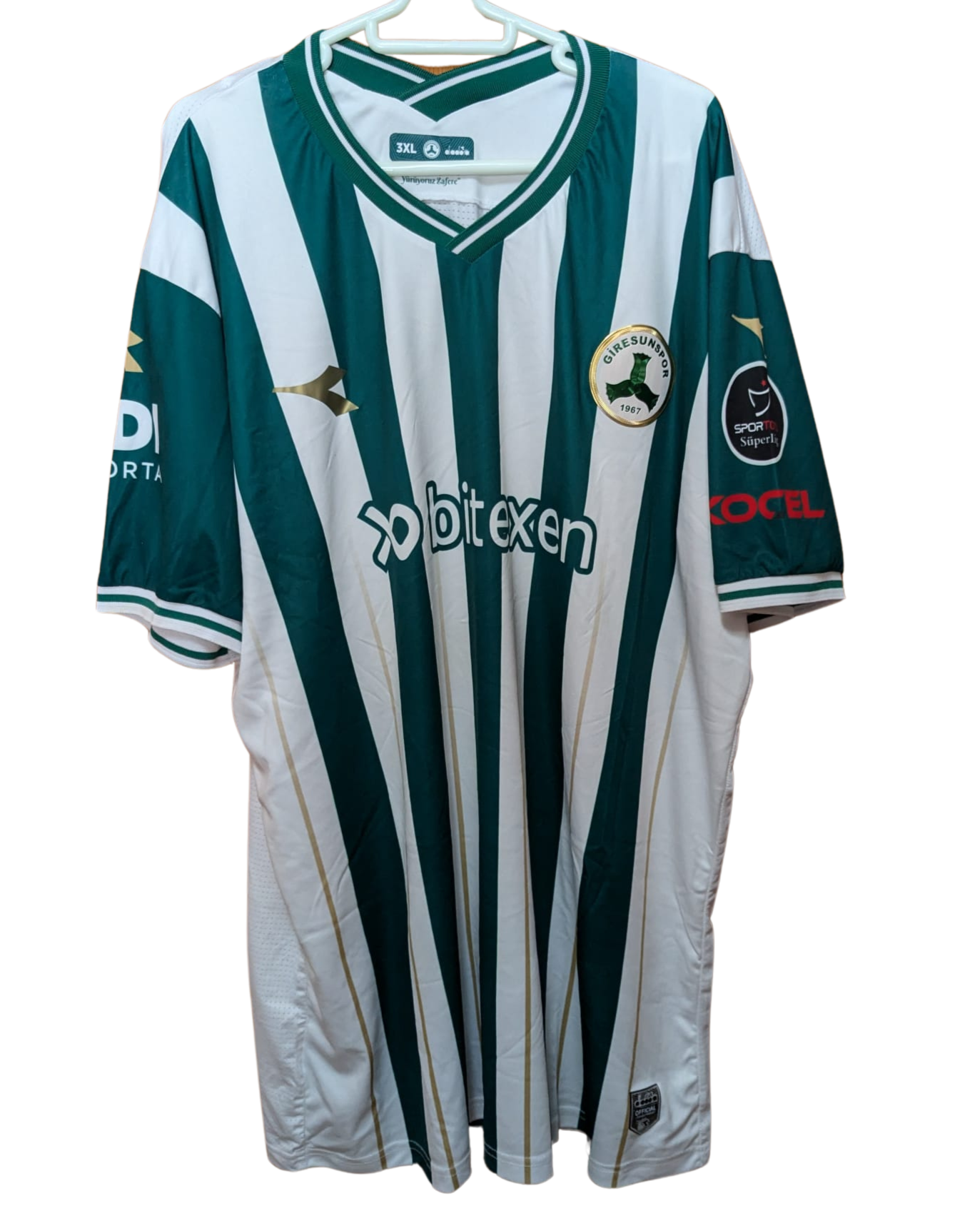Camiseta local del Giresunspor para la temporada 2022–2023, fabricada por Diadora. Presenta un diseño de franjas verticales verde oscuro y blancas con finos detalles dorados. El equipo compitió en la Superliga turca, donde finalizó en 16.ª posición y descendió a segunda división.