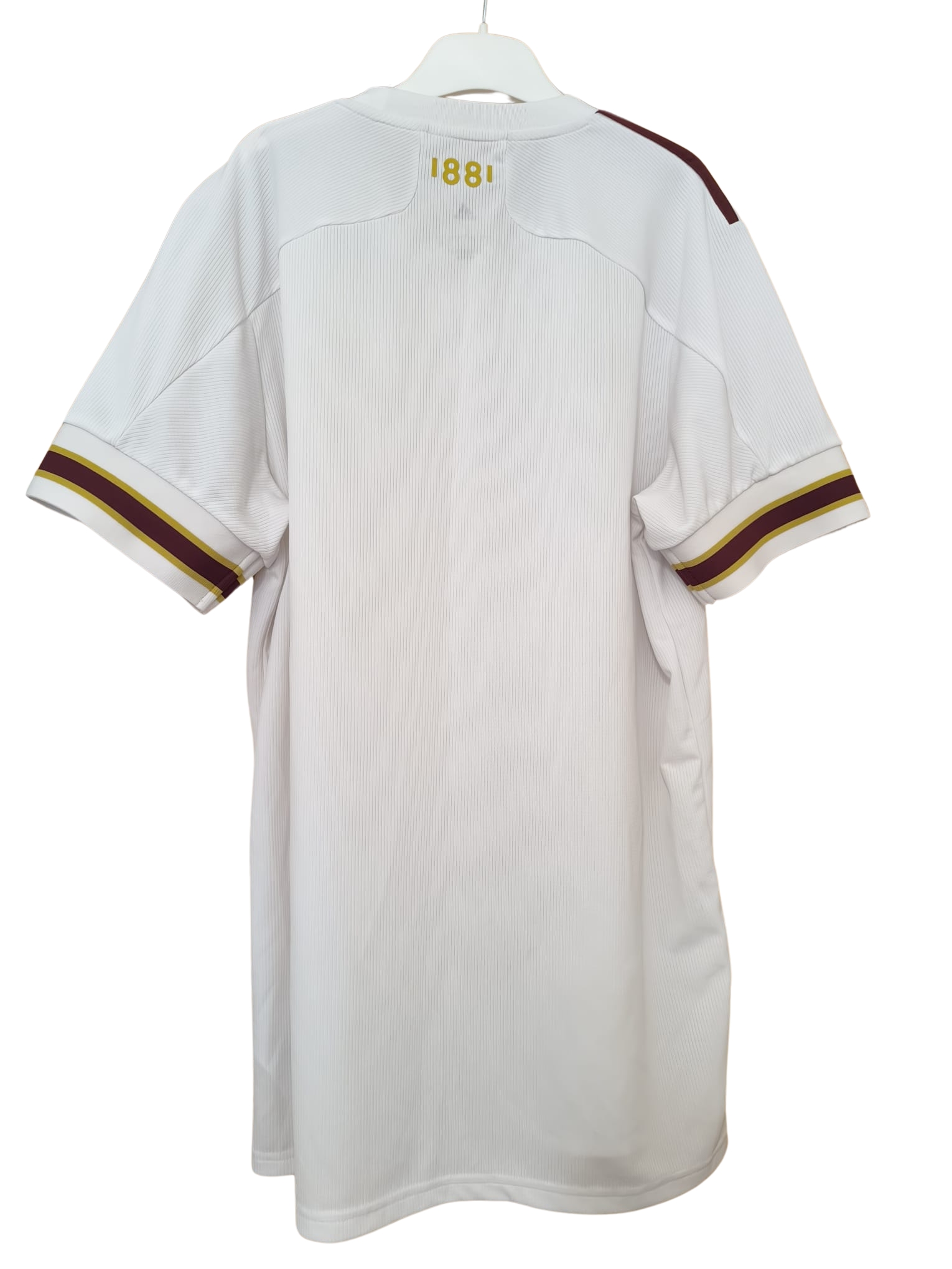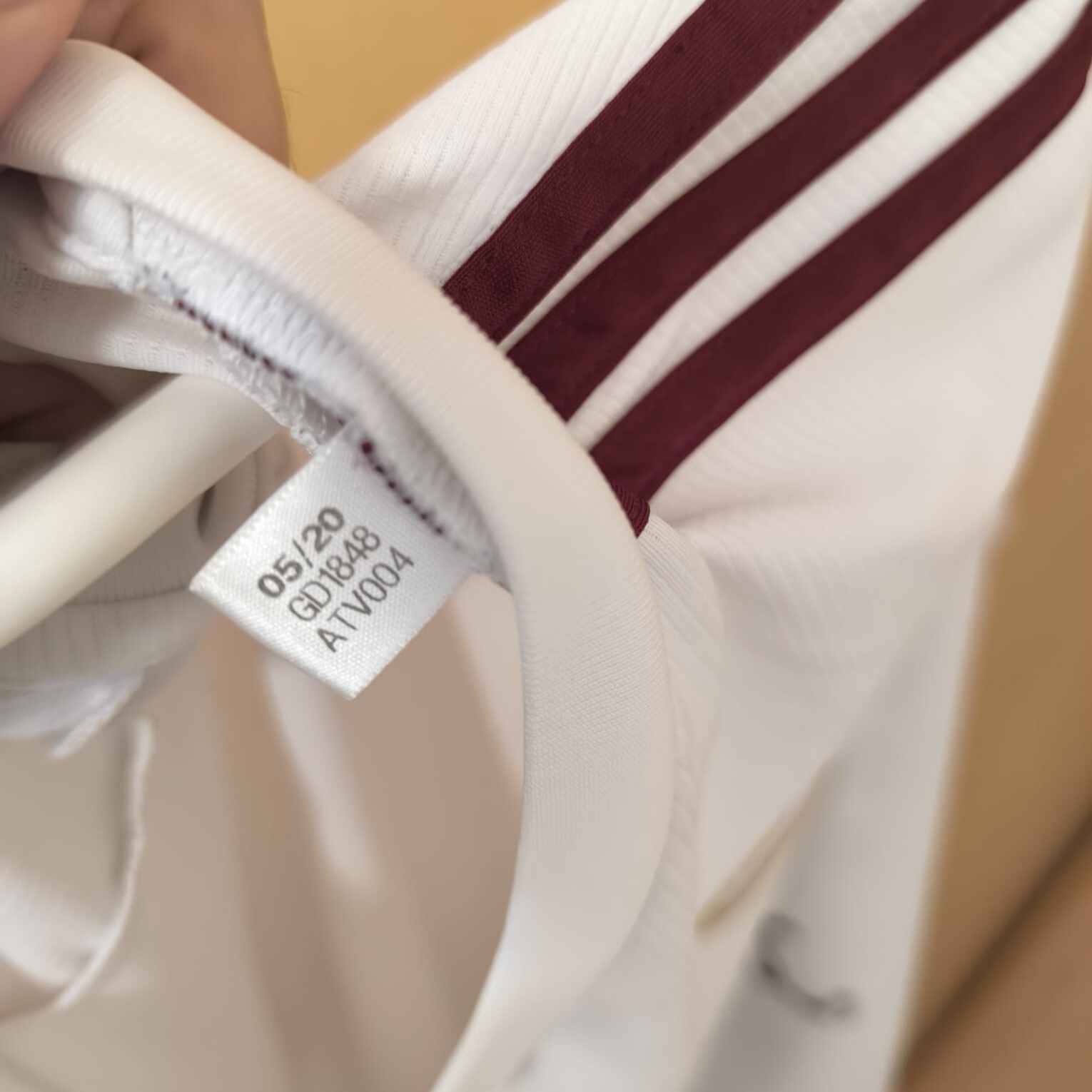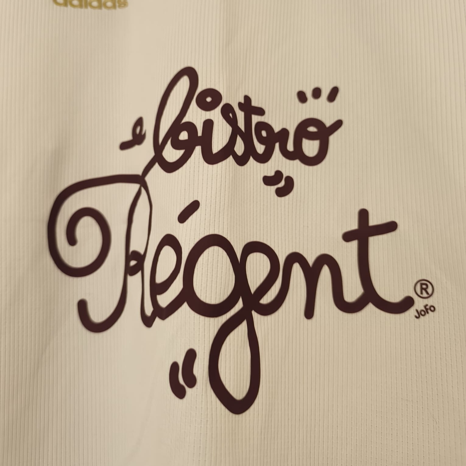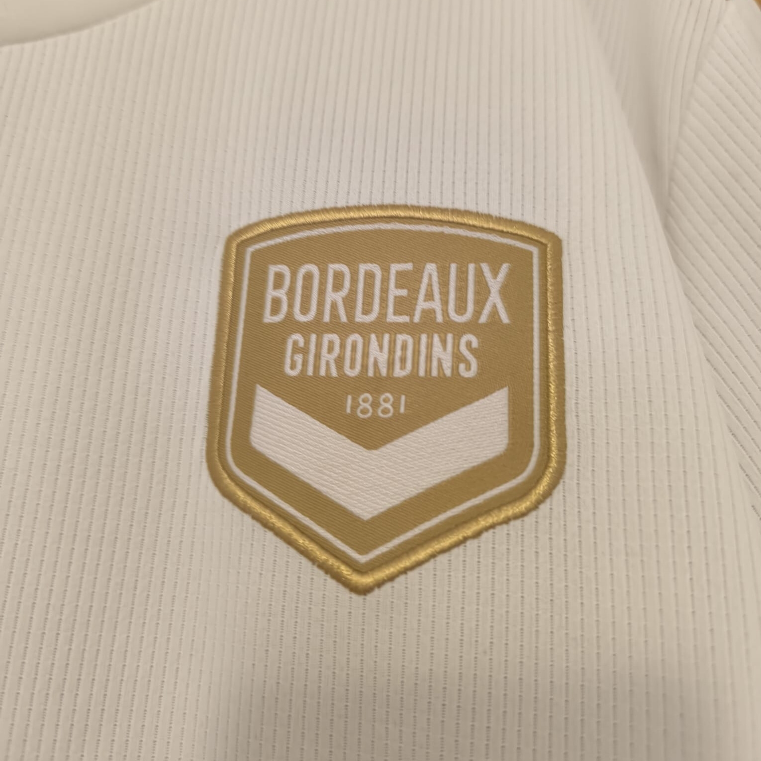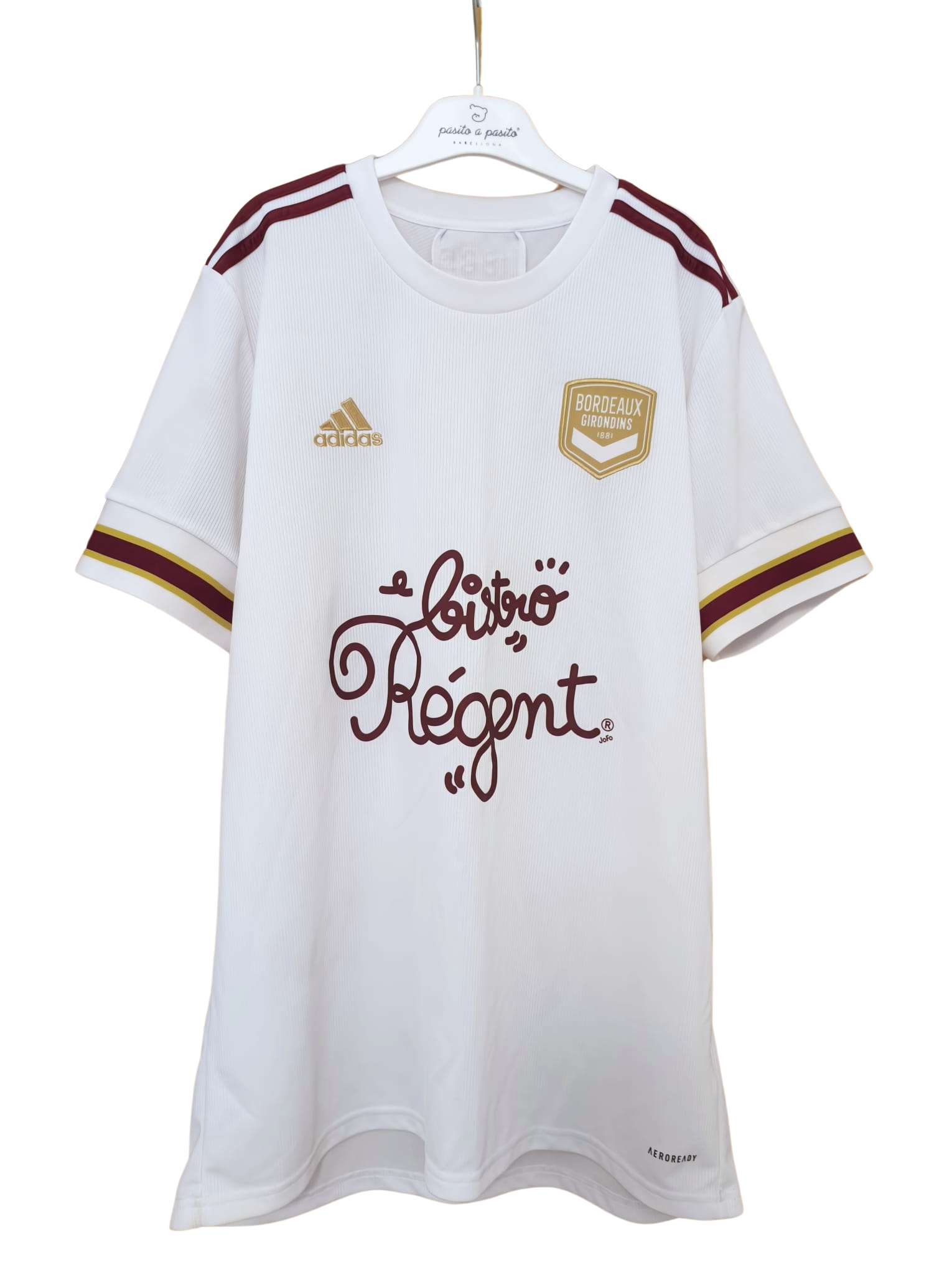 Camiseta visitante del Girondins de Burdeos para la temporada 2020-2021, diseñada por Adidas. Con un diseño elegante en blanco con detalles en dorado y burdeos, presenta el patrocinio de Le Bistro Régent en el pecho. Durante esta temporada, el club terminó en la 12ª posición de la Ligue 1 y fue eliminado en 32avos de final de la Copa de Francia por el Toulouse FC (2-0).