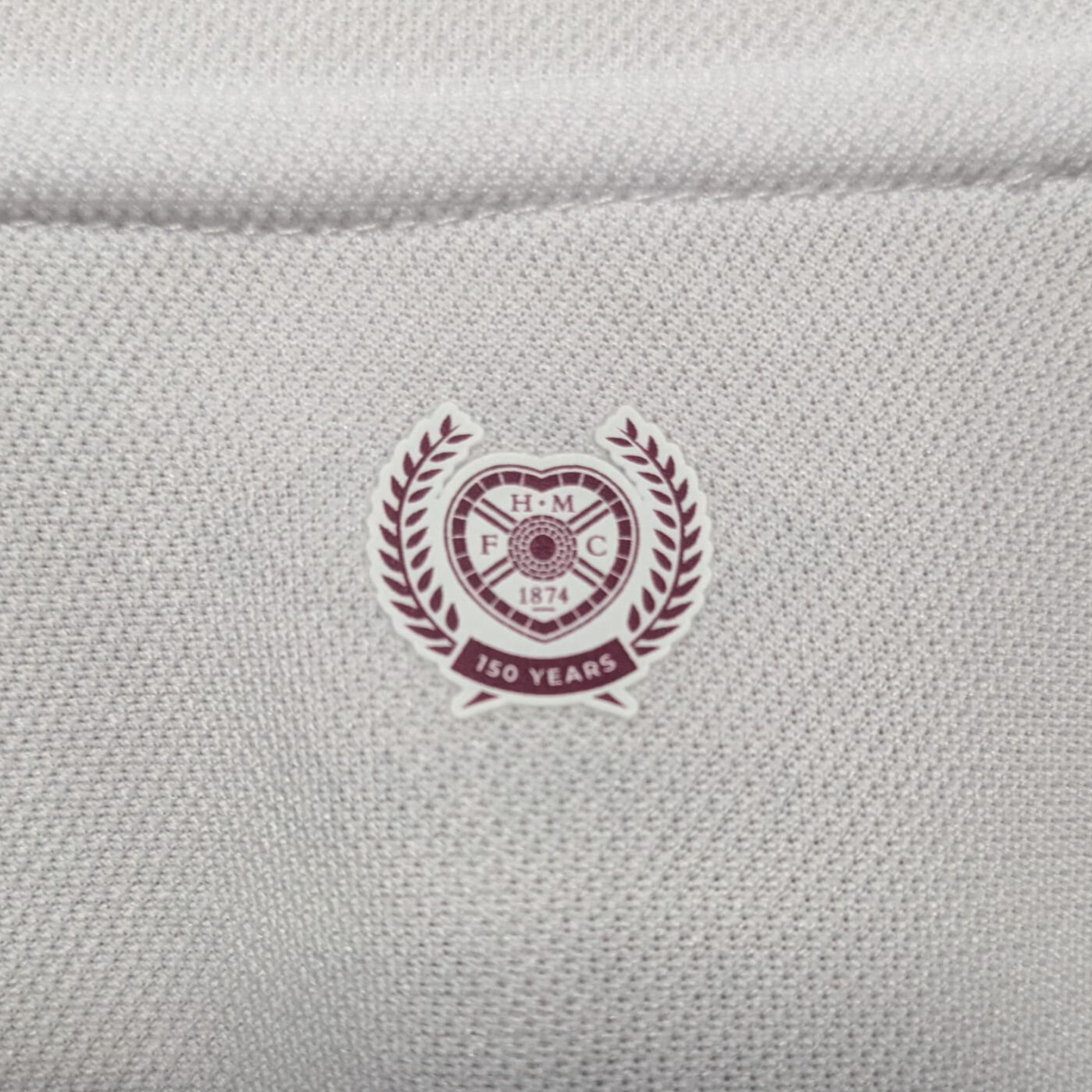 Camiseta tercera del Heart of Midlothian 2023-2024, de color blanco con detalles en burdeos y escudo en forma de corazón bordado en el pecho. Fabricada por Umbro, esta equipación conmemora el 150 aniversario del club. En lo deportivo fue una buena temporada al acabar tercero en la Premier League y llegar a semifinales tanto en la Copa de Escocia como en la Copa de la Liga.