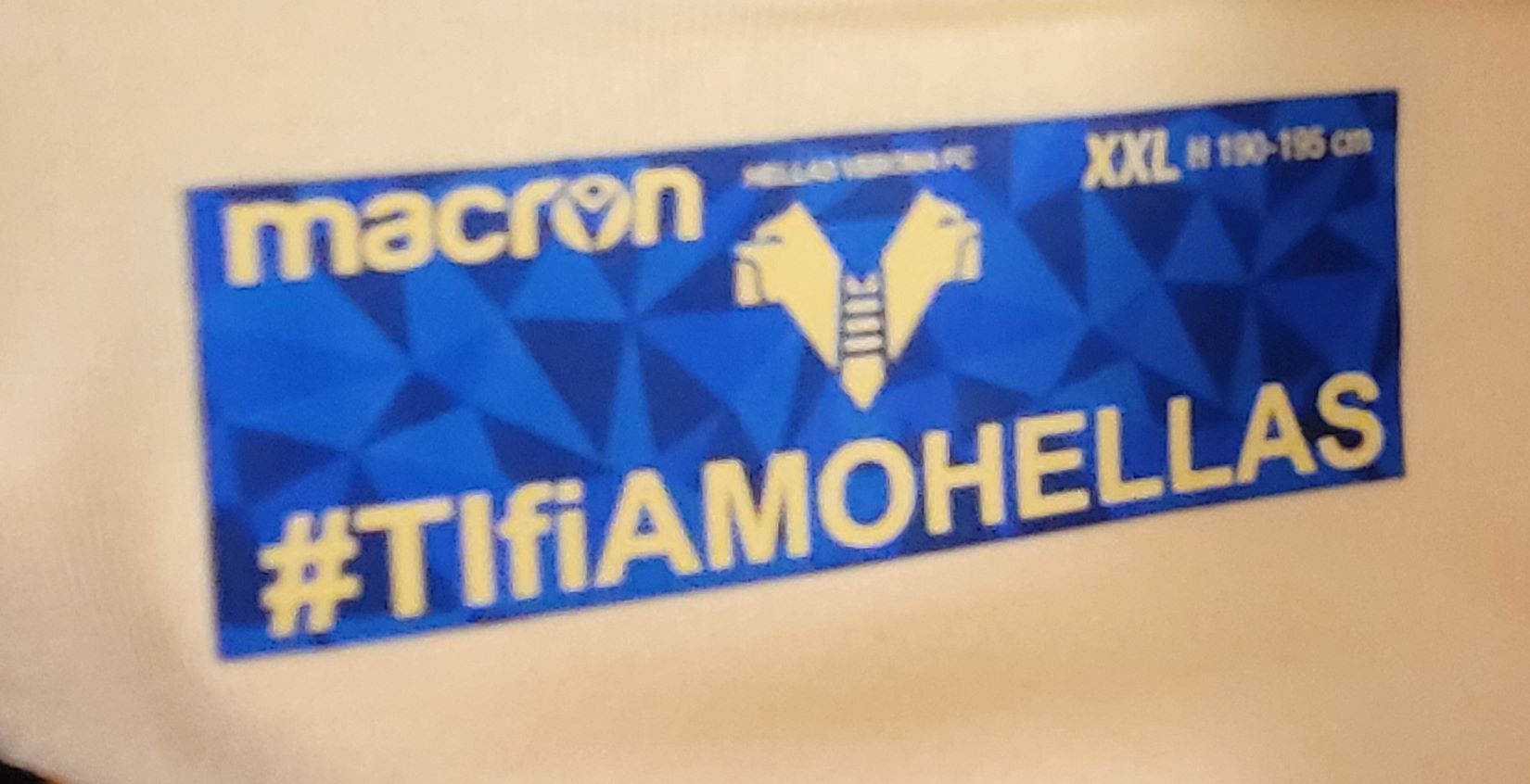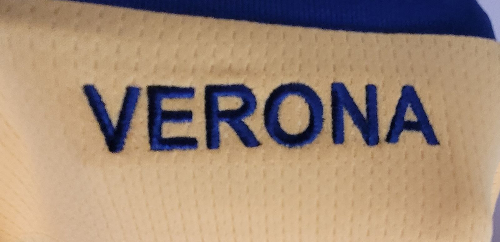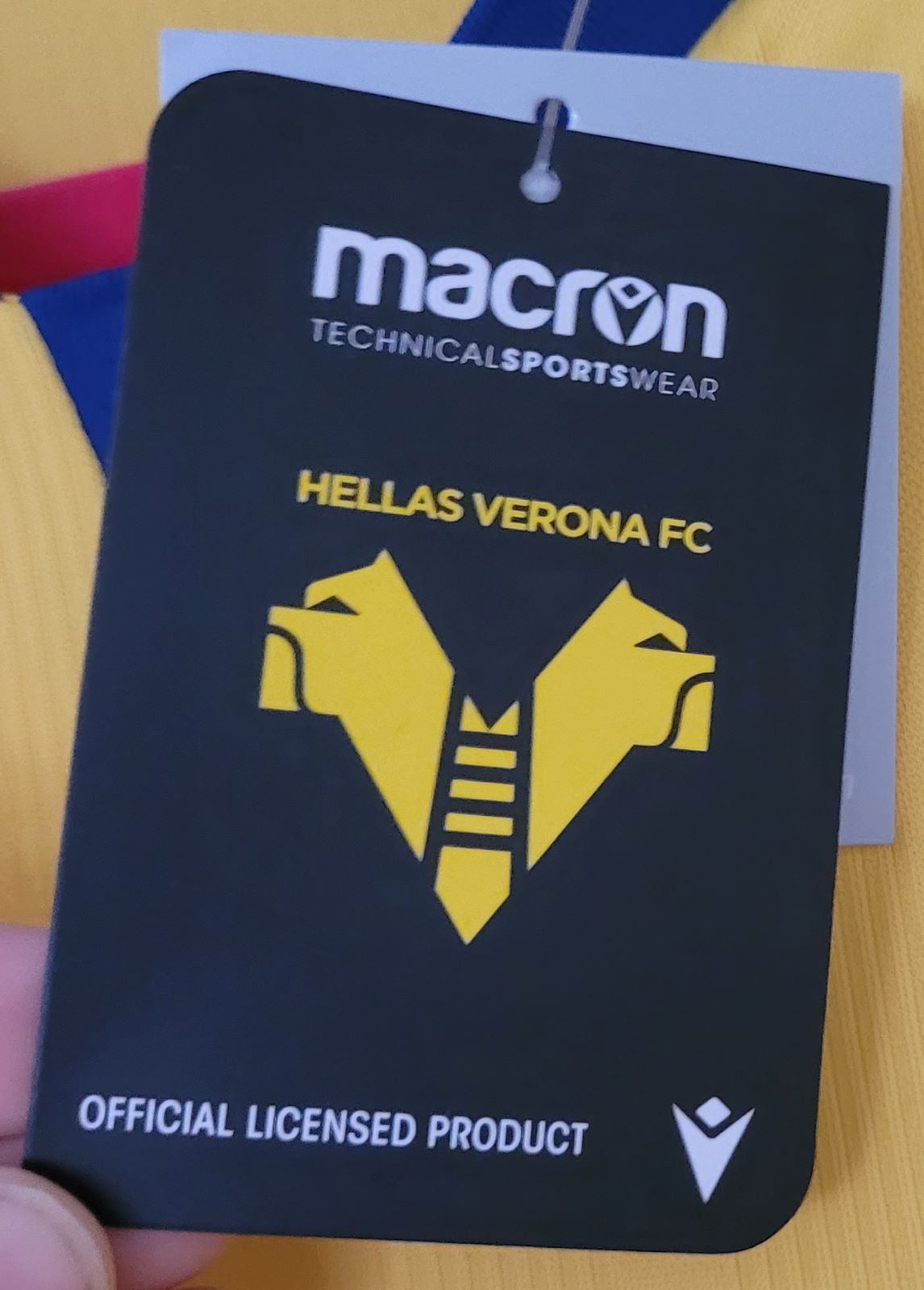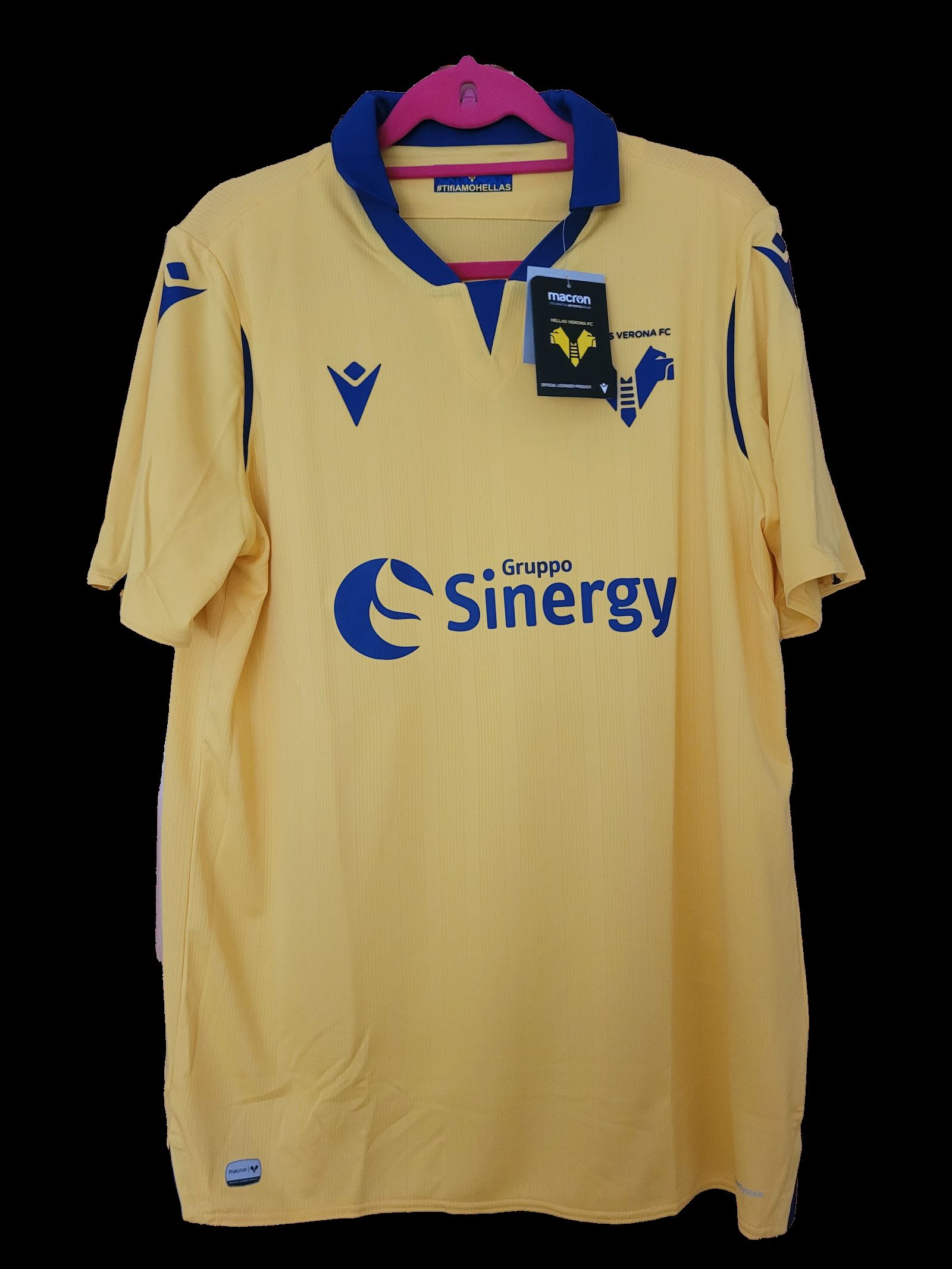 Camiseta visitante del Hellas Verona utilizada en la temporada 2020-2021, fabricada por Macron. Diseño en amarillo pálido con detalles en azul. Usada en la Serie A, donde el equipo finalizó en la 10.ª posición, consolidándose en la primera división del fútbol italiano.