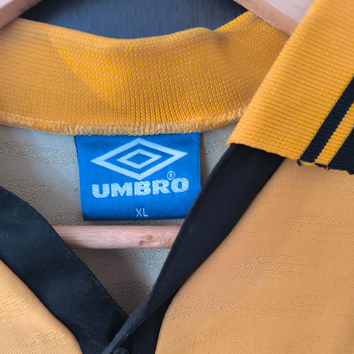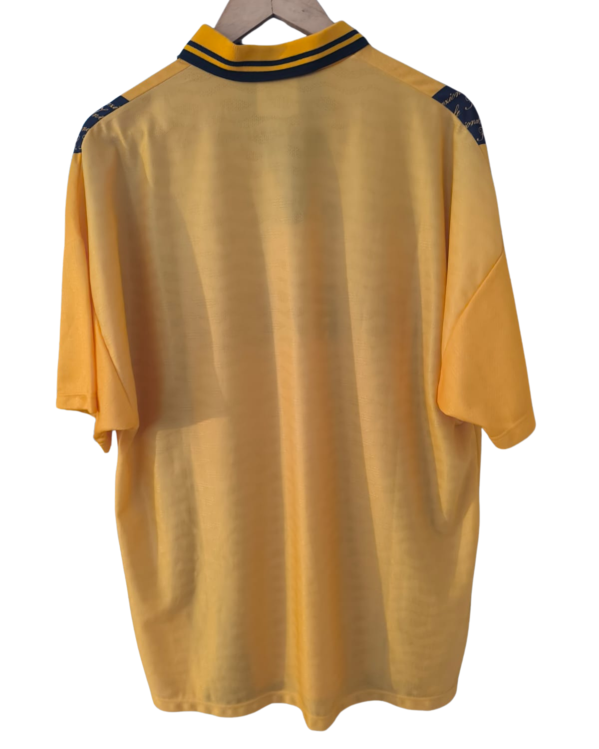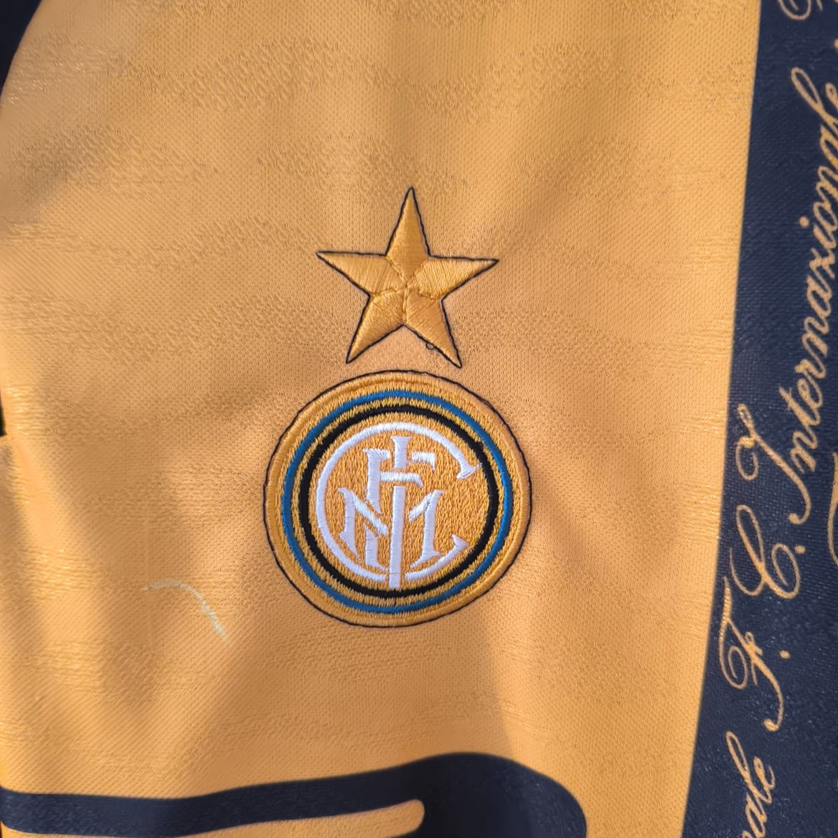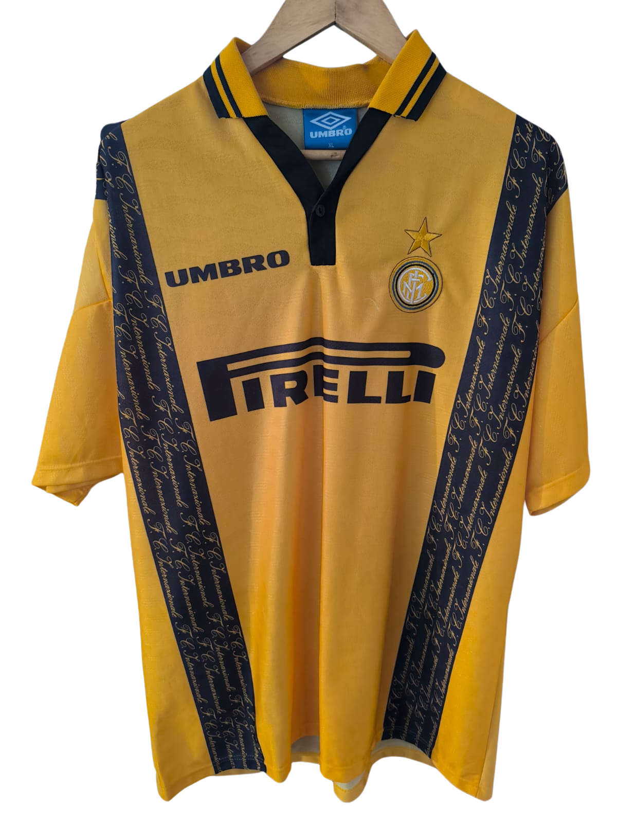 Camiseta tercera del Inter de Milán para la temporada 1996–1997, fabricada por Umbro. El diseño se presenta en amarillo con dos franjas verticales negras decoradas con inscripciones caligráficas en dorado. En la Serie A, el equipo terminó en 3.ª posición con 59 puntos. En la Coppa Italia cayó eliminado en cuartos de final ante el Cagliari. En la Copa de la UEFA alcanzó la final, donde fue derrotado por el Schalke 04 en la tanda de penaltis.