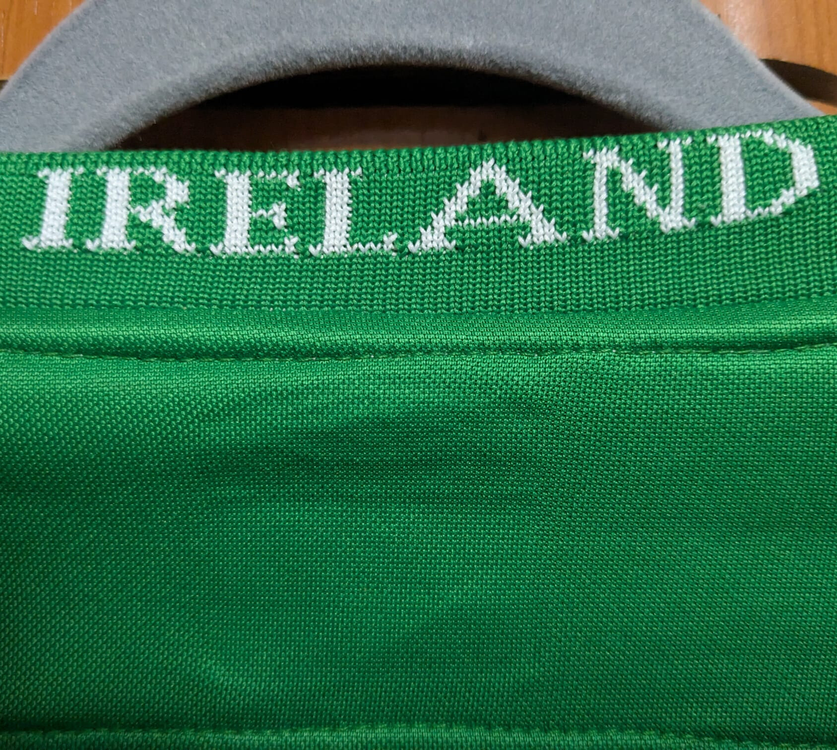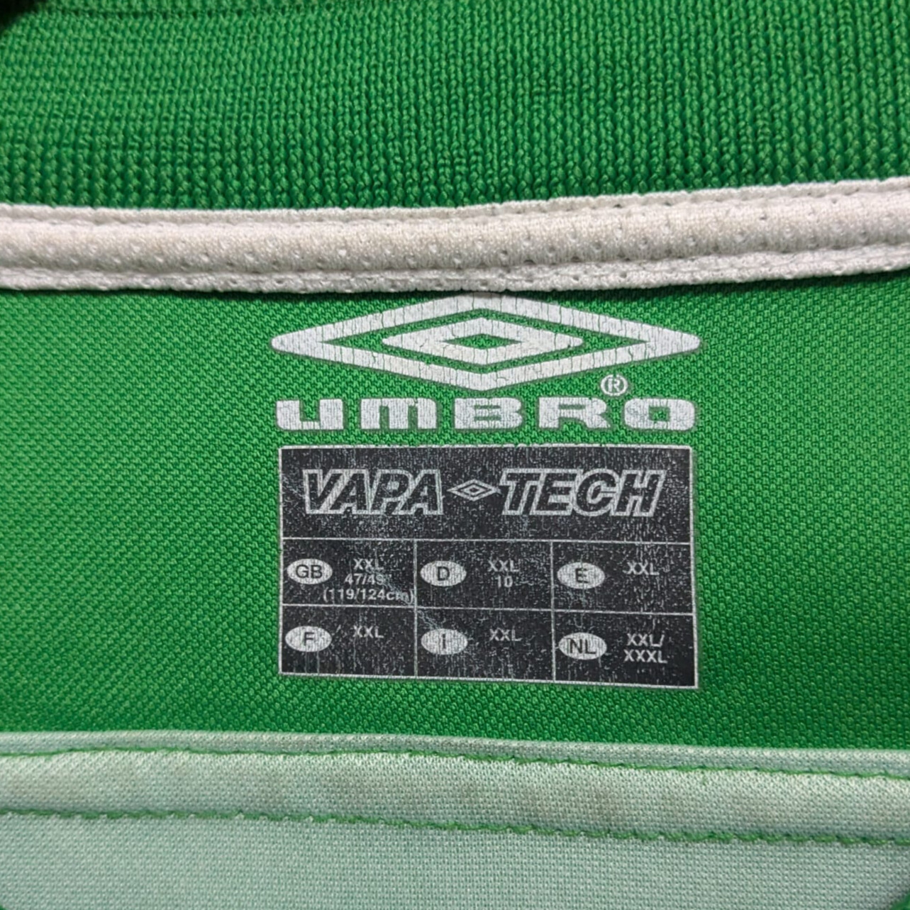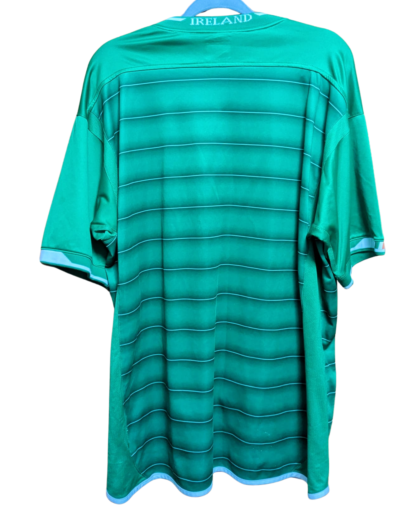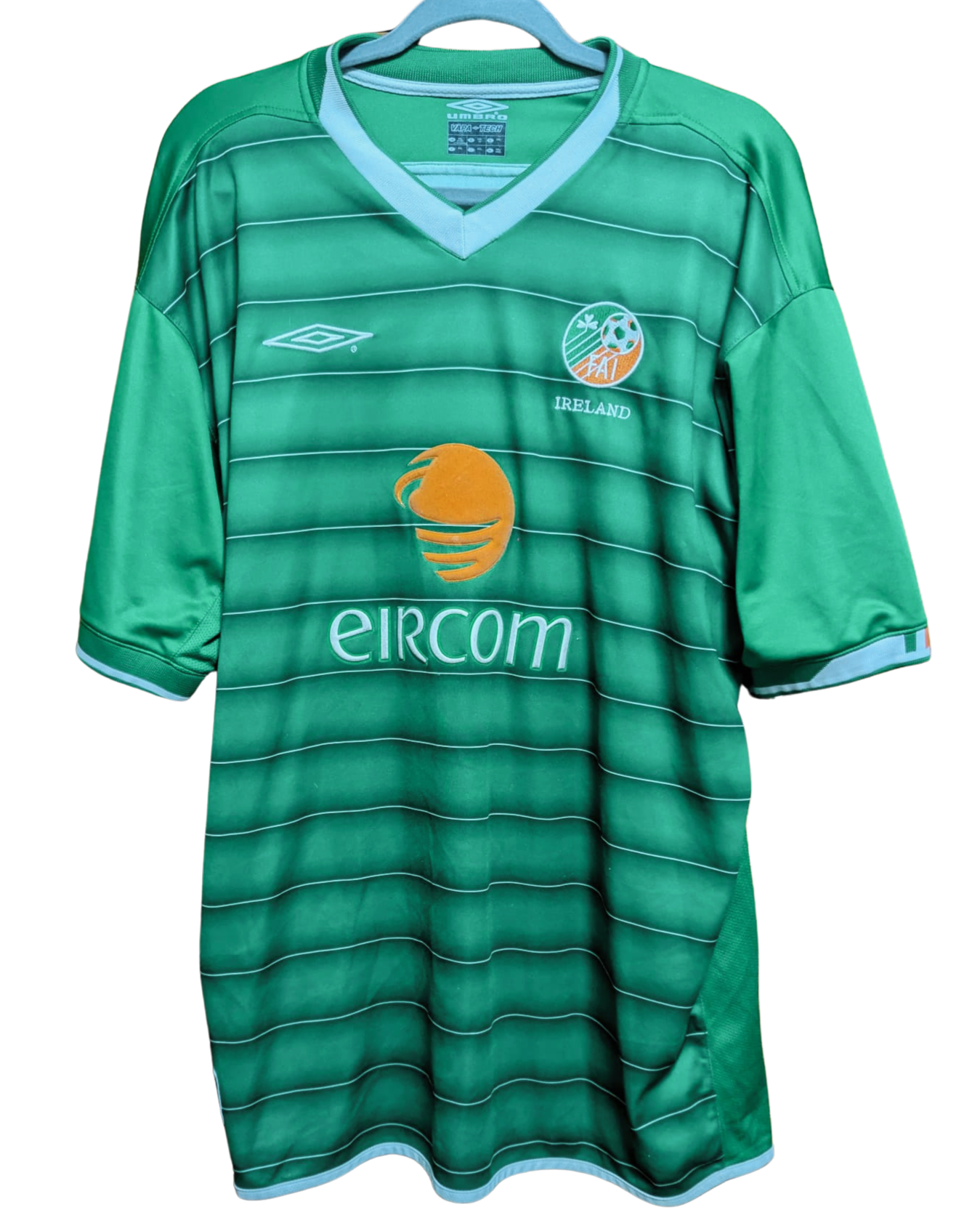 Camiseta local de Irlanda utilizada en el año 2003, fabricada por Umbro. Presenta un diseño verde con líneas horizontales más oscuras y cuello en blanco, junto al patrocinador Eircom en el pecho. La selección irlandesa no logró clasificarse para la Eurocopa 2004, tras quedar en la 3ª posición del Grupo 10 en la fase de clasificación.