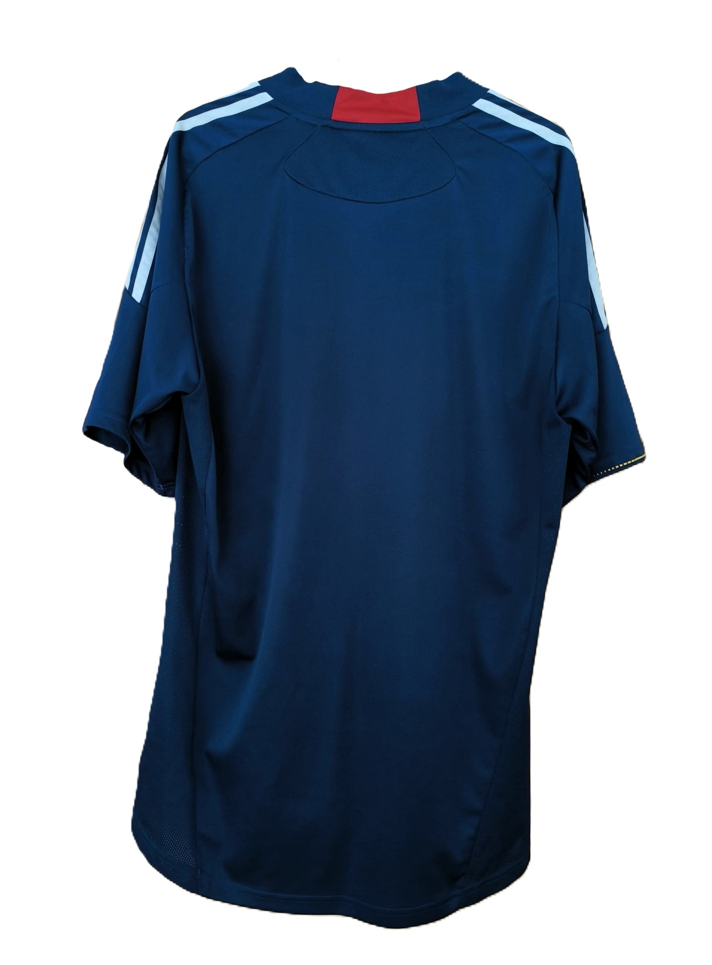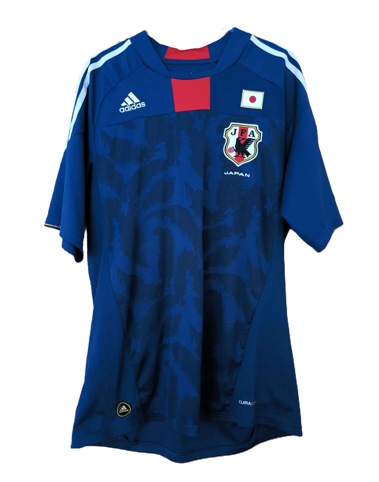 Camiseta local de Japón utilizada entre 2010 y 2011, diseñada por Adidas. Predomina el color azul con detalles en rojo y blanco, y su diseño presenta un patrón sutil en el pecho que simula ondas, evocando las olas del mar japonés. Esta camiseta fue utilizada en el Copa Mundial de 2010, donde Japón llegó a los octavos de final, siendo eliminada por Paraguay en una tanda de penales.