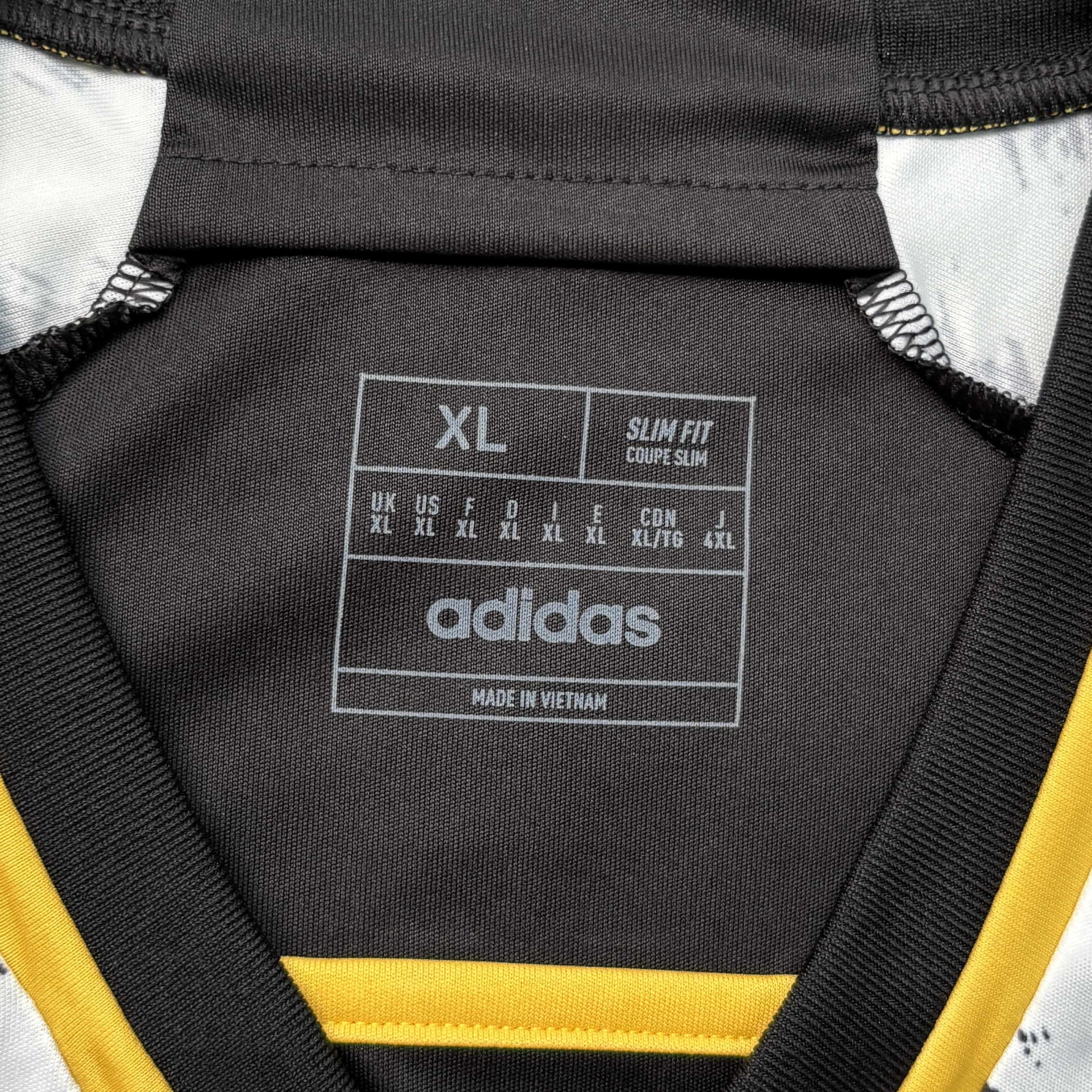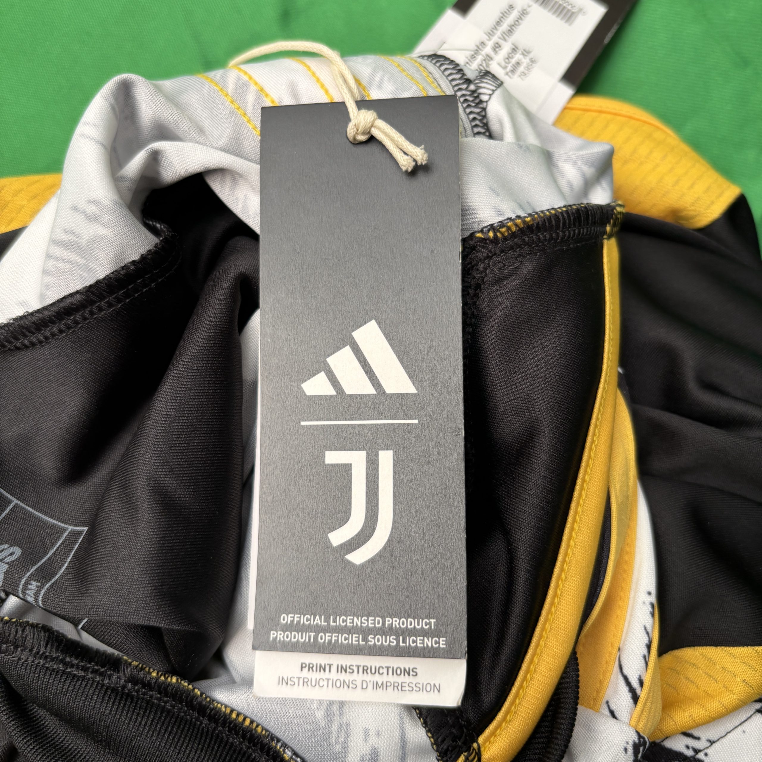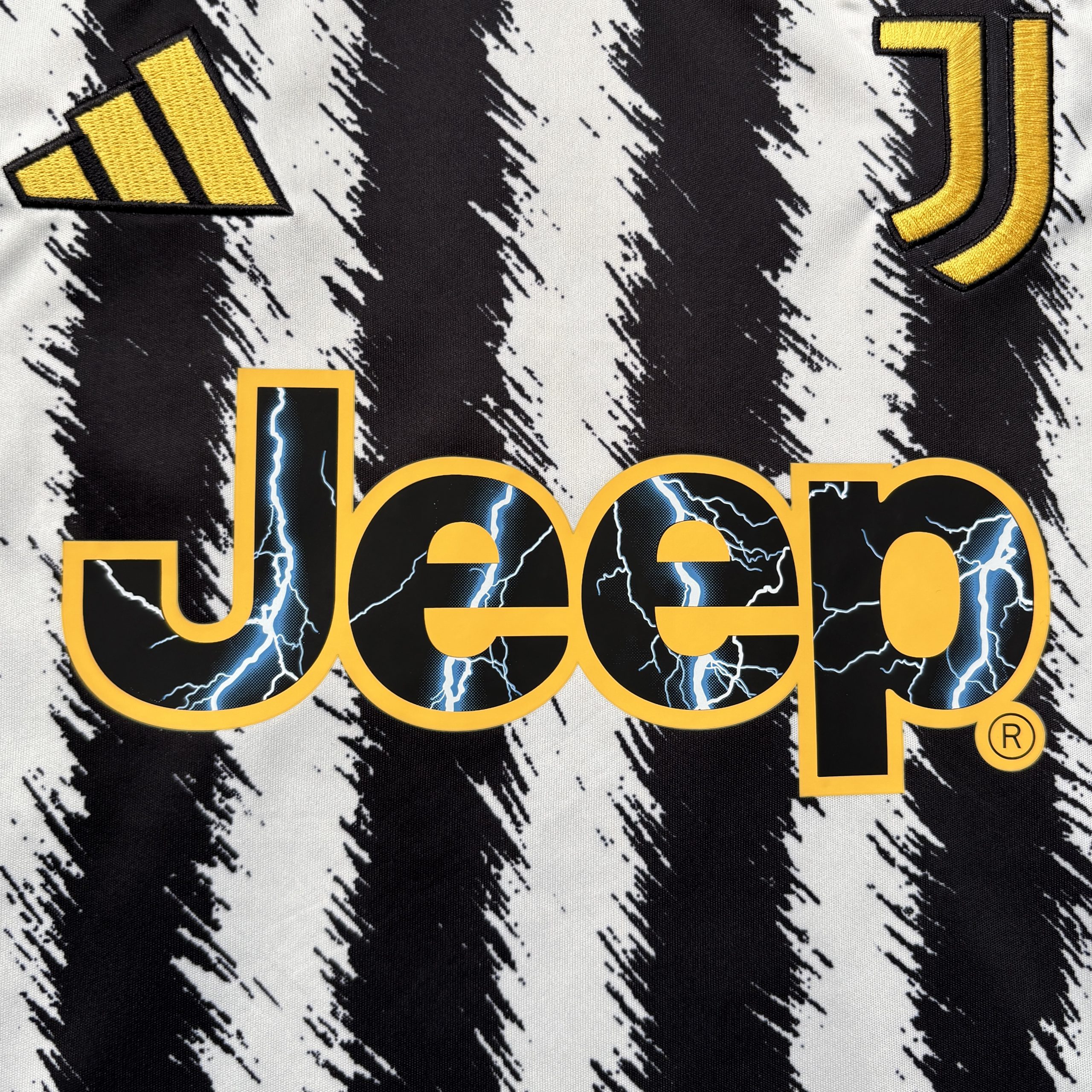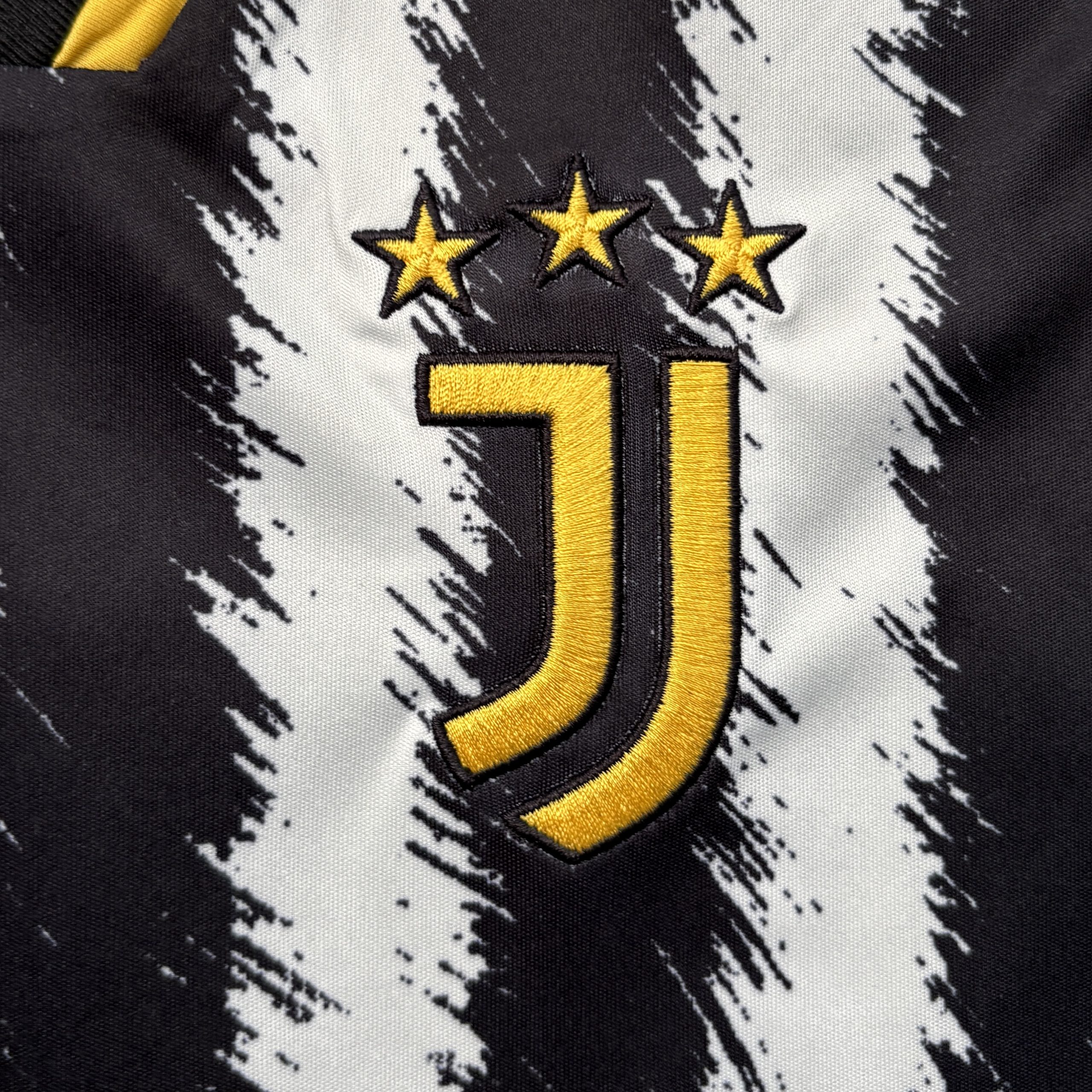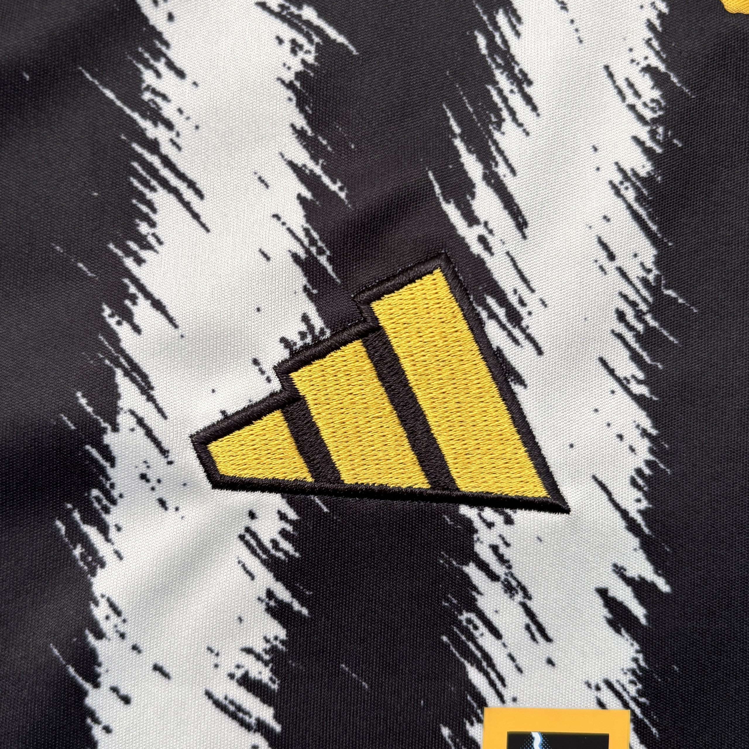 La equipación principal de la Juventus para la temporada 2023-2024, fabricada por Adidas, regresa a las franjas tradicionales con un diseño que evoca a una cebra, con líneas borrosas y difuminadas. El equipo finalizó en 3ª posición en la Serie A, lo que le valió la clasificación para la UEFA Champions League, además de ganar la Copa de Italia.