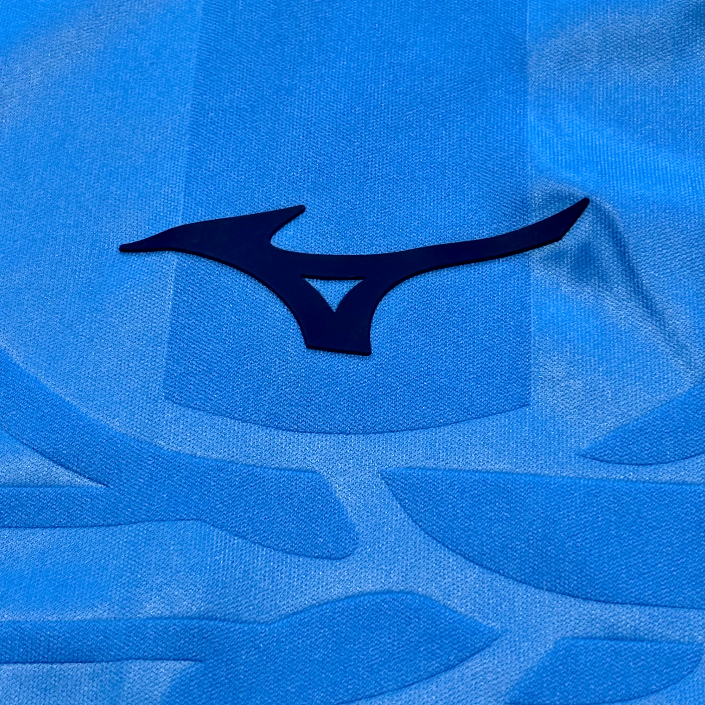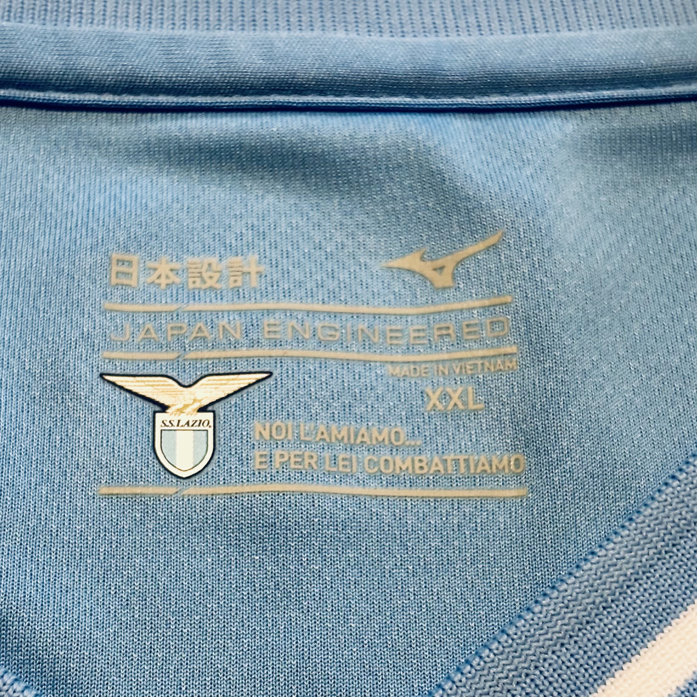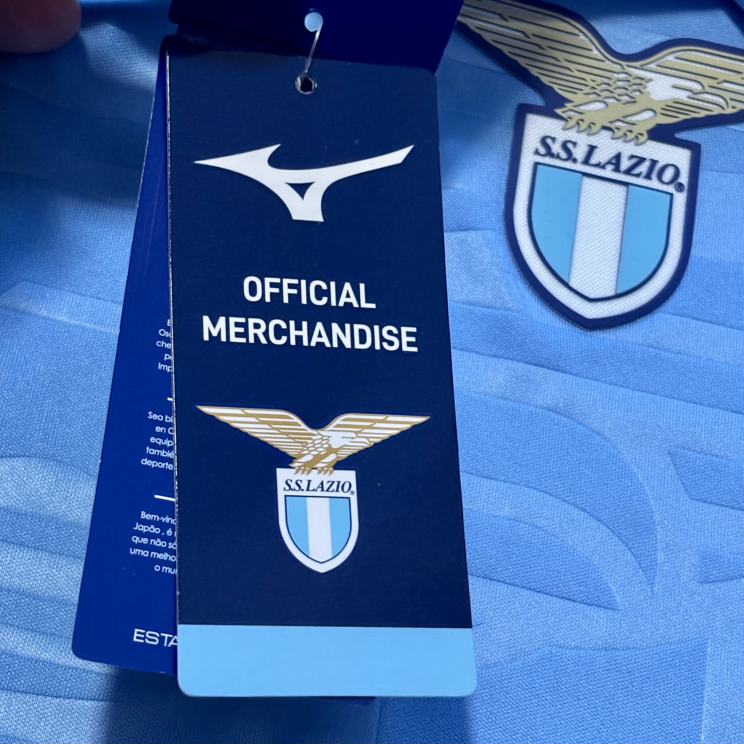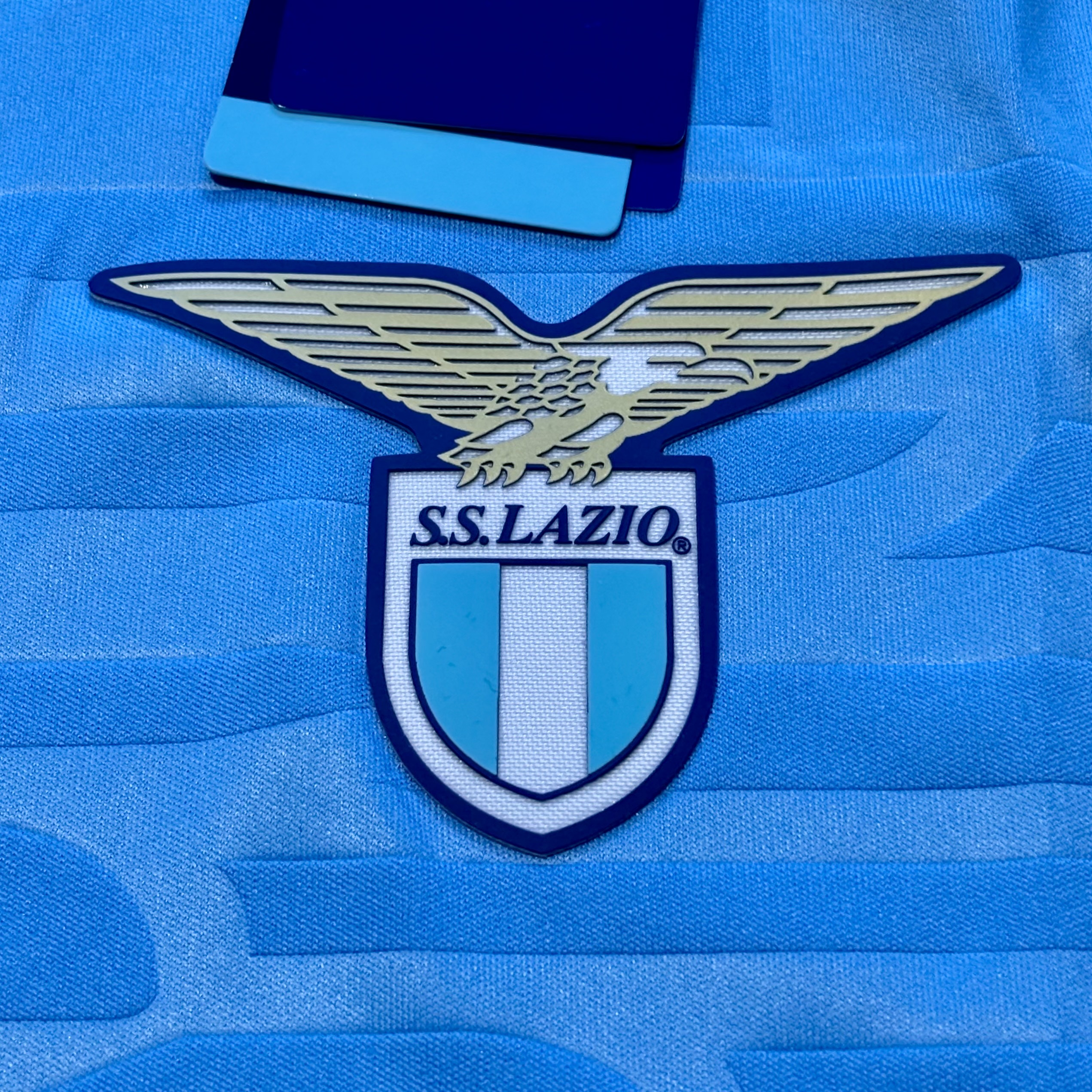Camiseta local de la SS Lazio para la temporada 2023-2024, fabricada por Mizuno, en su característico celeste, con un elegante gráfico en relieve que integra el águila del club y barras verticales tonales en el frontal. Con este modelo, la Lazio compitió en Serie A, donde finalizó 7.ª, y en Champions League, alcanzando los octavos de final, siendo eliminada por el Bayern de Múnich.