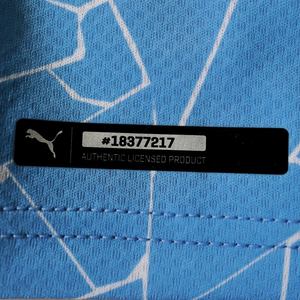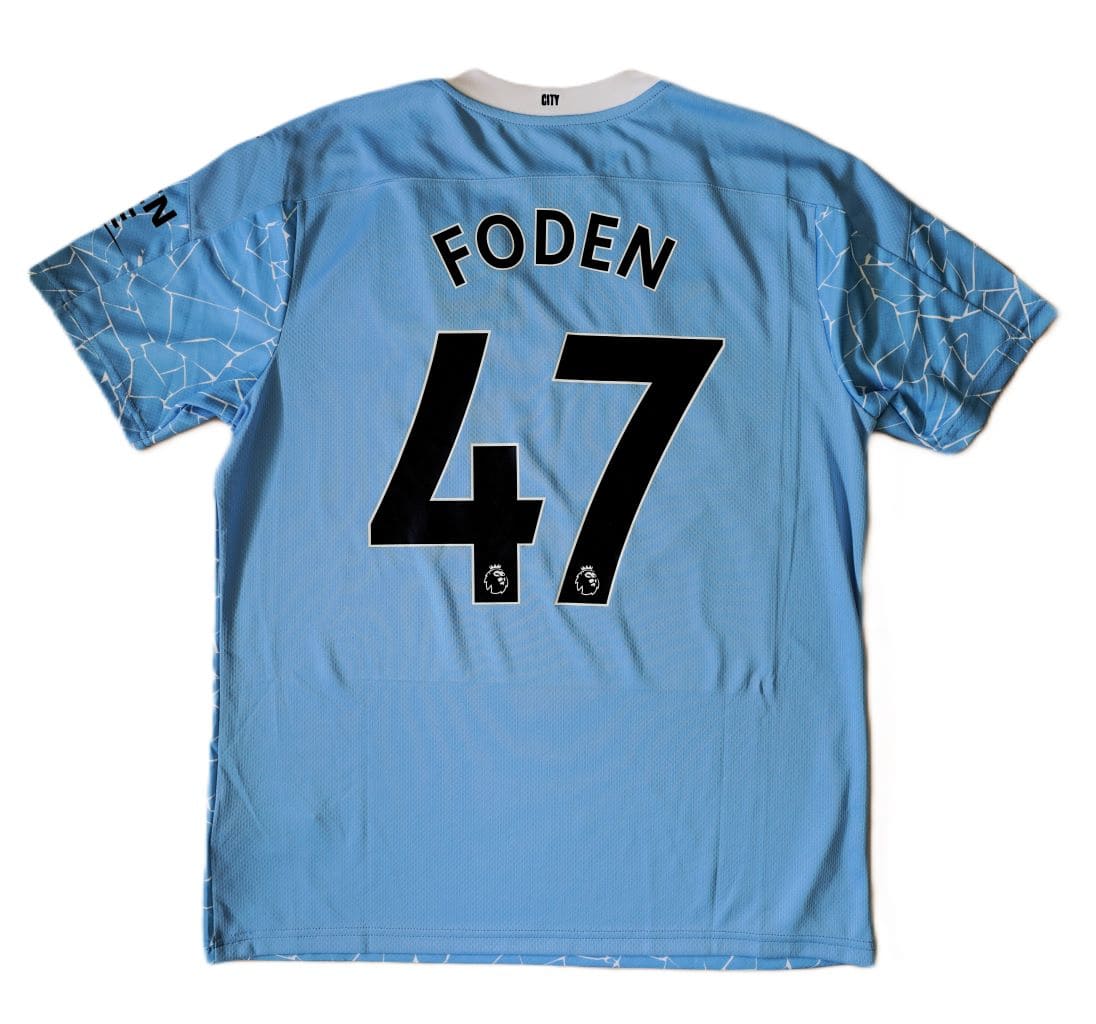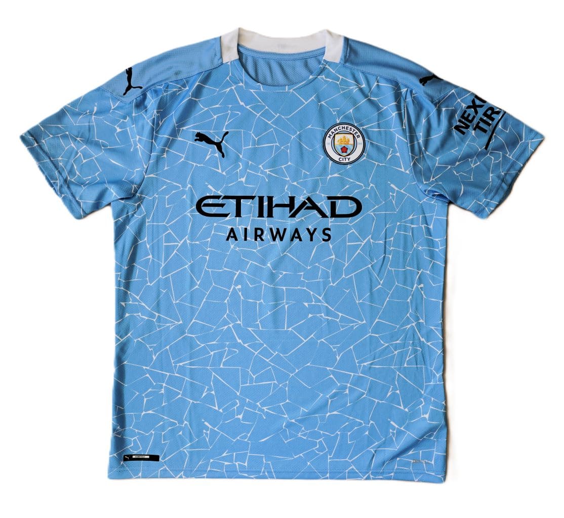 Camiseta local del Manchester City para la temporada 2020-2021, fabricada por Puma. Diseño en celeste con un patrón blanco inspirado en los mosaicos de Manchester, con cuello blanco y patrocinador Etihad Airways en el centro. Puma introdujo un diseño único inspirado en los mosaicos del Northern Quarter de Manchester, una de las zonas culturales más icónicas de la ciudad. Sobre el fondo celeste tradicional, se incluyen líneas blancas irregulares que simulan las estructuras de los mosaicos urbanos.