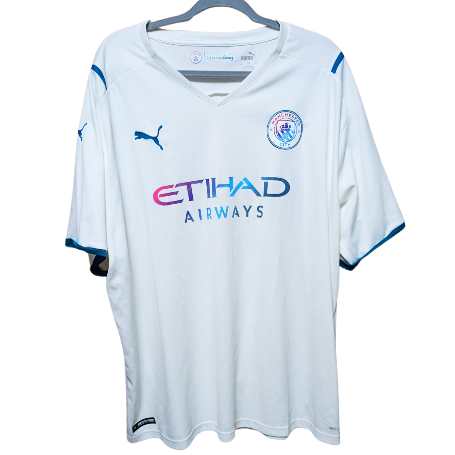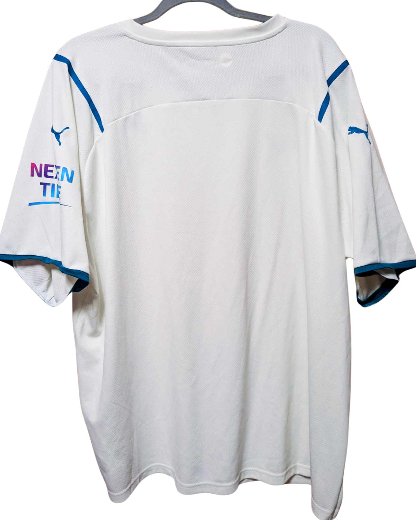 El Manchester City utilizó esta camiseta como segunda equipación durante la temporada 2021-2022, diseñada por Puma con un mensaje social potente: el homenaje al programa «Cityzens Giving for Safe Water». El equipo completó una excelente campaña al conquistar la Premier League con 93 puntos y alcanzar las semifinales de la Champions League, donde fue eliminado en un cruce épico por el Real Madrid.