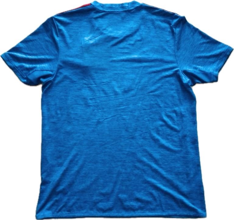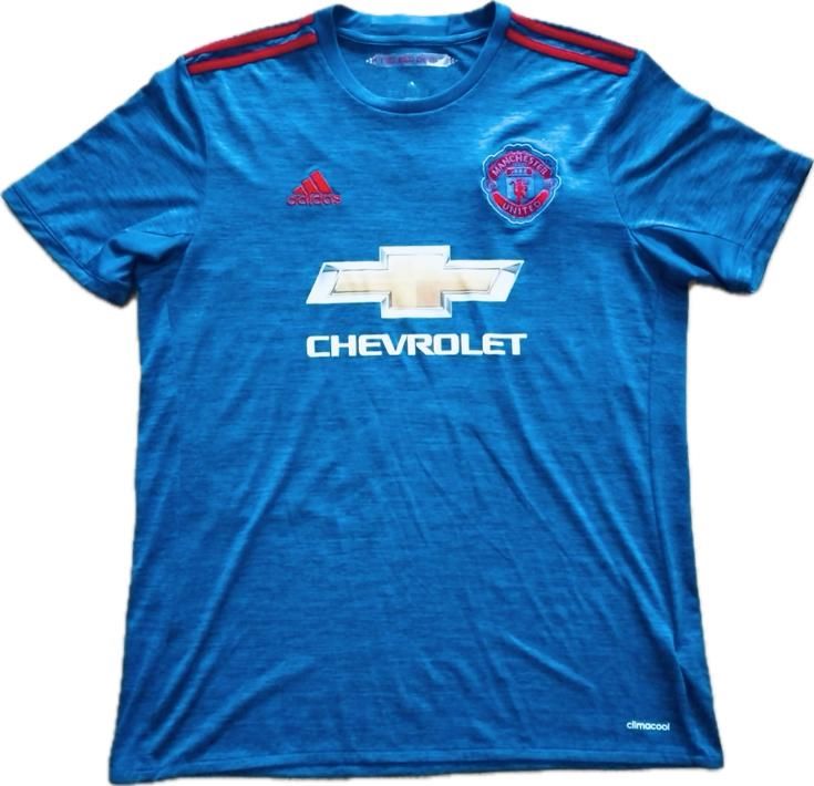 La camiseta visitante del Manchester United para la temporada 2016-2017, fabricada por Adidas, presenta un diseño en tonos azules inspirado en modelos históricos del club. Incluye el escudo del equipo en el pecho, acompañado del logo de Adidas y el patrocinador principal Chevrolet. Durante esta temporada, el Manchester United disputó la Premier League, la FA Cup, la Copa de la Liga, la Community Shield y la UEFA Europa League. Terminó en el sexto puesto de la liga, pero logró ganar la Europa League tras vencer al Ajax en la final, asegurando su clasificación a la Champions League. Además, conquistó la Copa de la Liga y la Community Shield.