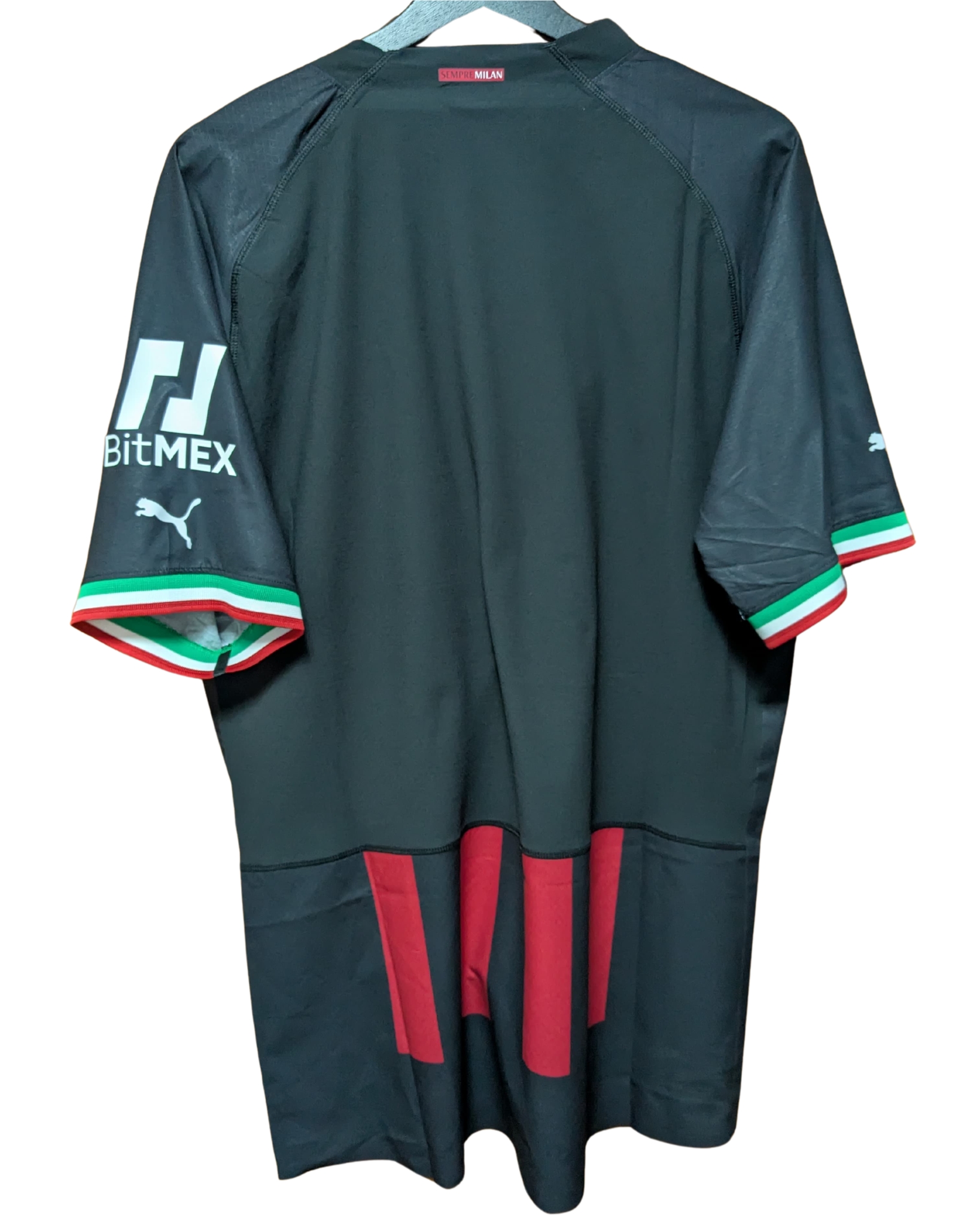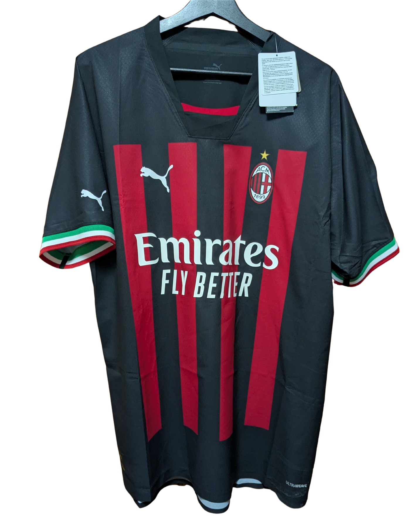 Esta es la primera equipación del AC Milan en la temporada 2022 – 2023. No pudo reeditar el triunfo en la Serie A y acabó la temporada en cuarta posición. Perdió la Supercoppa ante el Inter, cayó en octavos de final de la Coppa de Italia ante el Torino y llegó hasta semifinales de Champions League, donde de nuevo fue derrotado por el Inter.