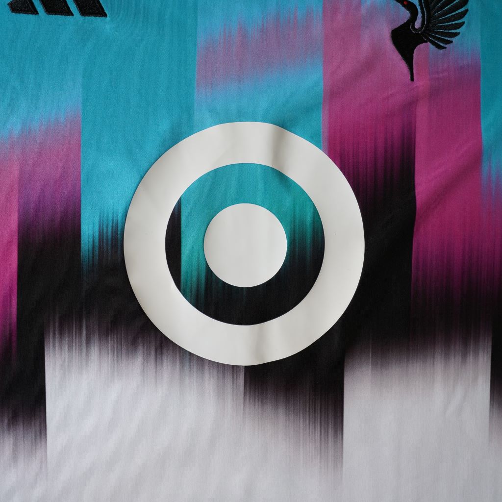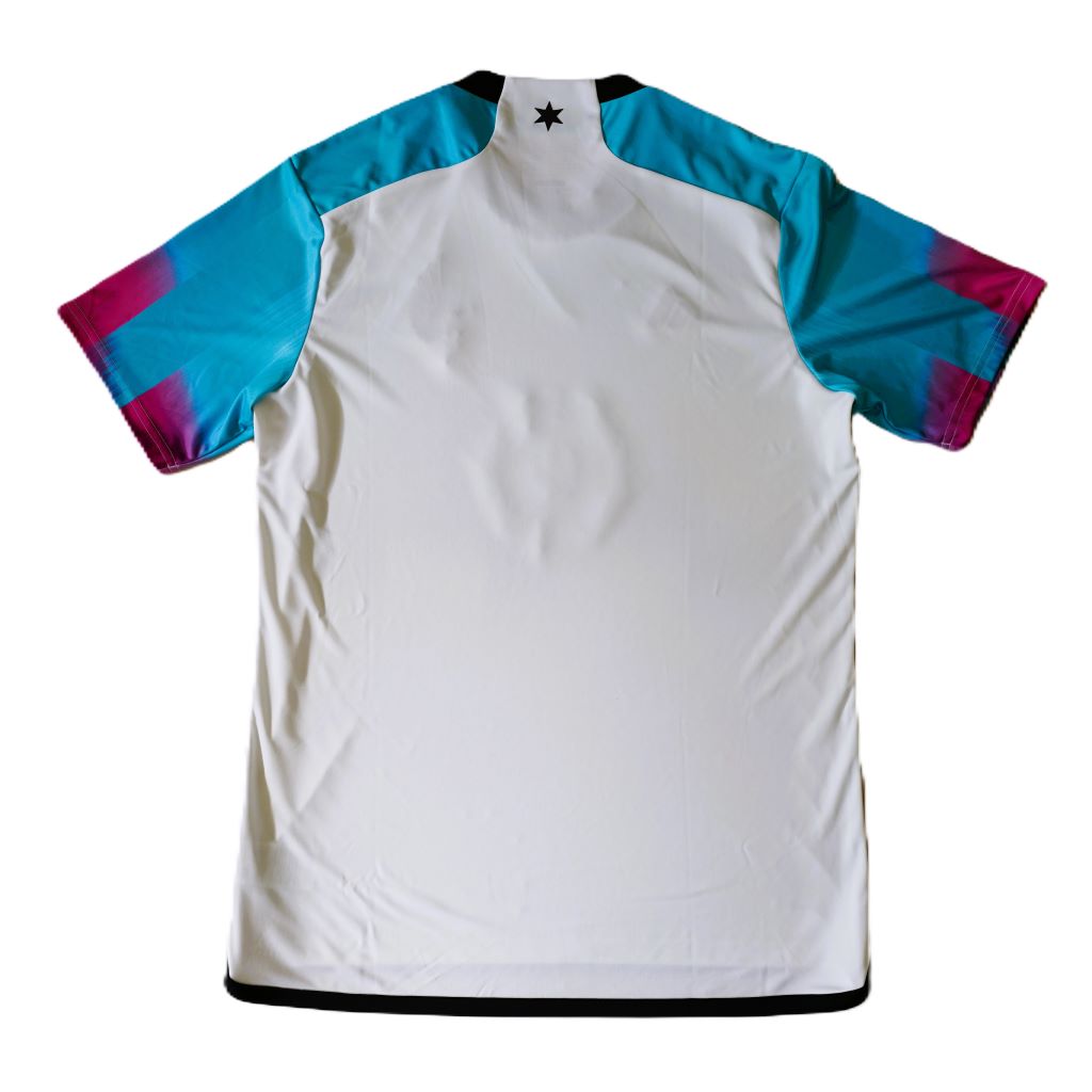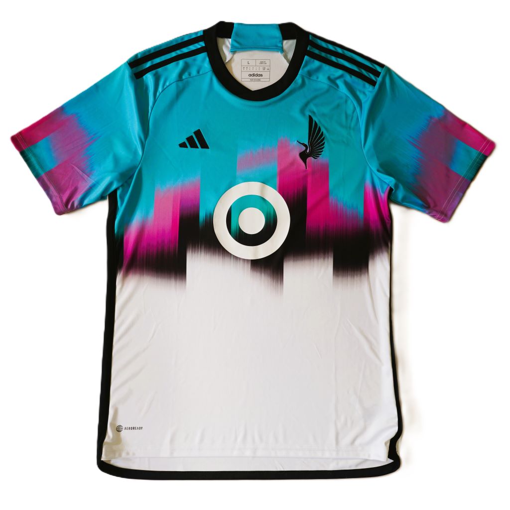La camiseta visitante de Minnesota United 2023-2024 presenta un diseño inspirado en las auroras boreales, con una combinación de azul, rosa y negro que se difumina sobre un fondo blanco. Fabricada por Adidas, incluye el escudo del club en negro en el pecho y el logo del patrocinador Target en el centro. Se utilizó en la Major League Soccer (MLS) y la US Open Cup durante ambas temporadas. Mala temporada en 2023, y en 2024 consiguió alcanzar las semifinales de conferencia.