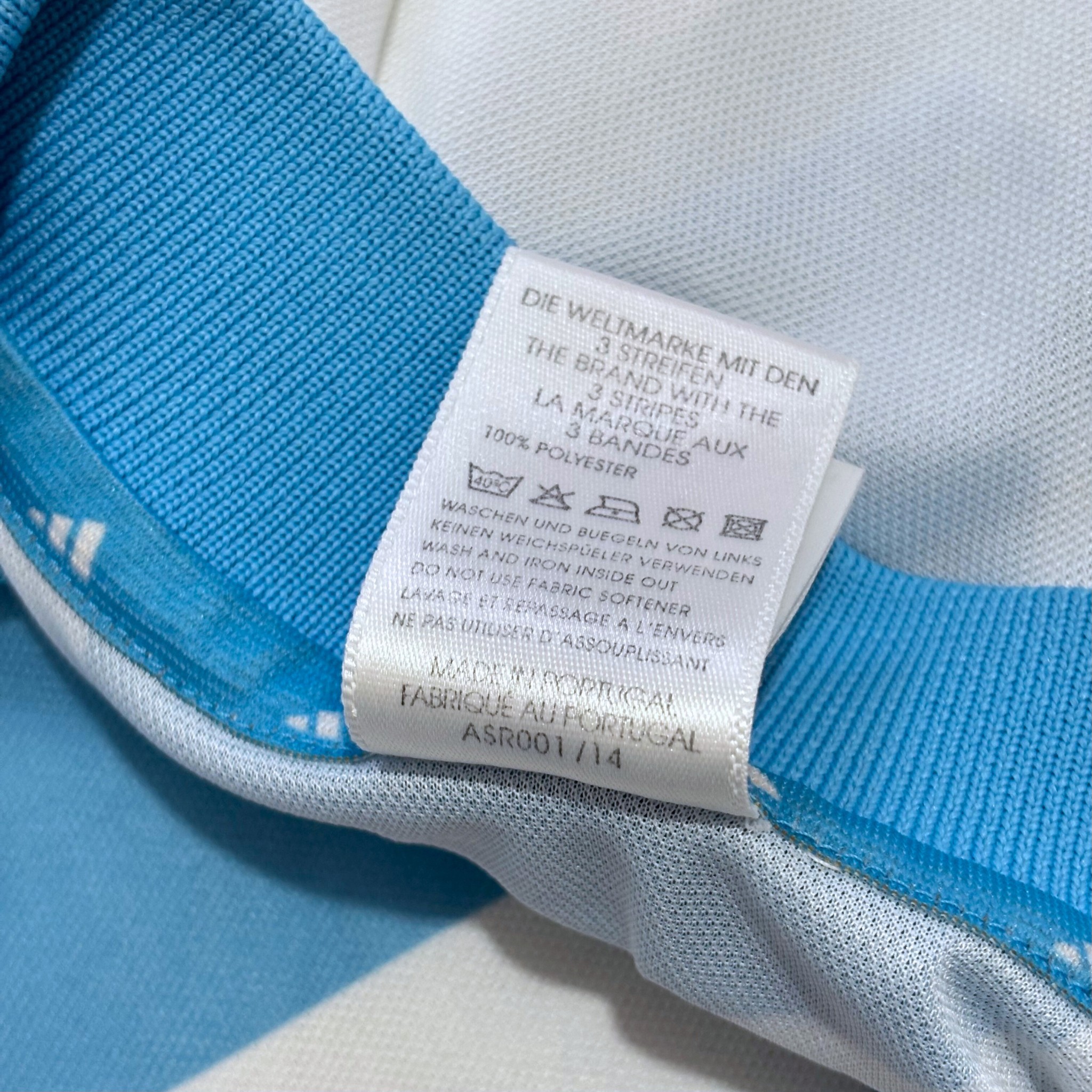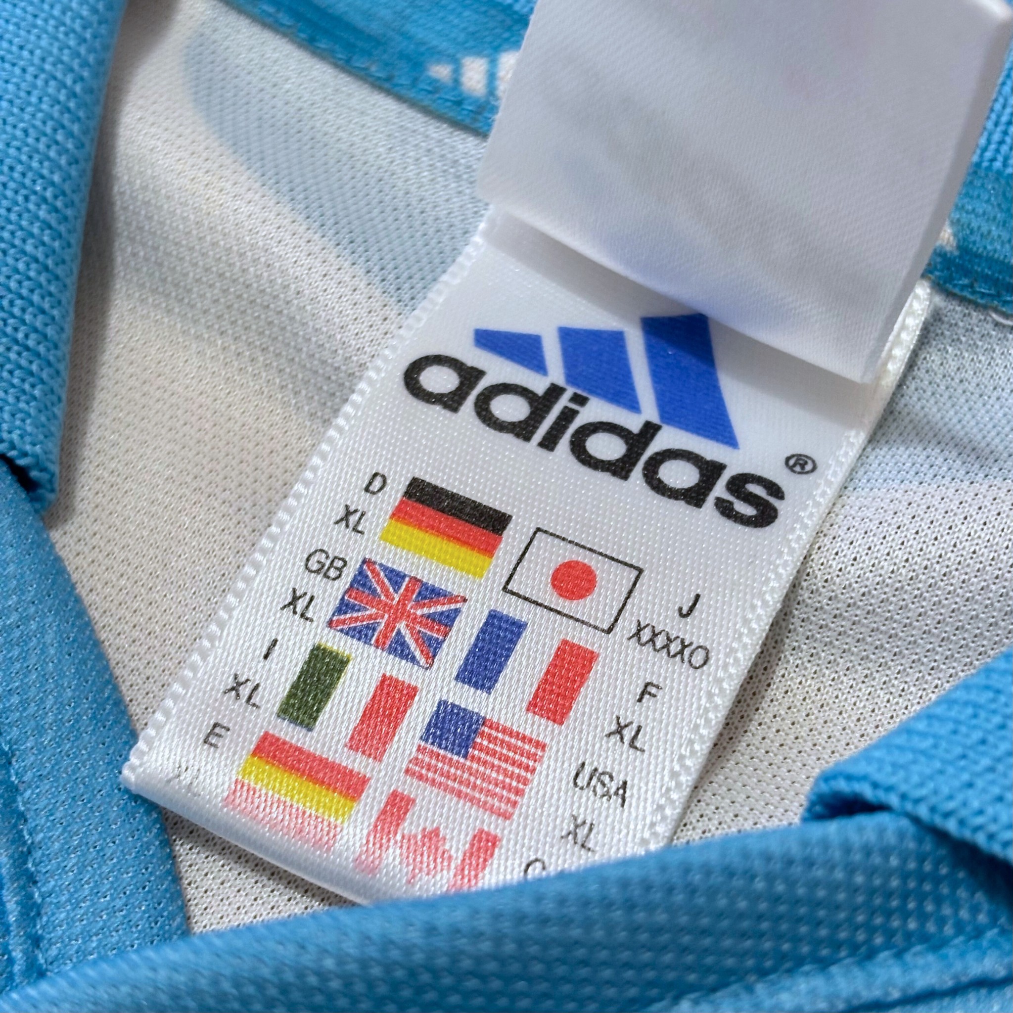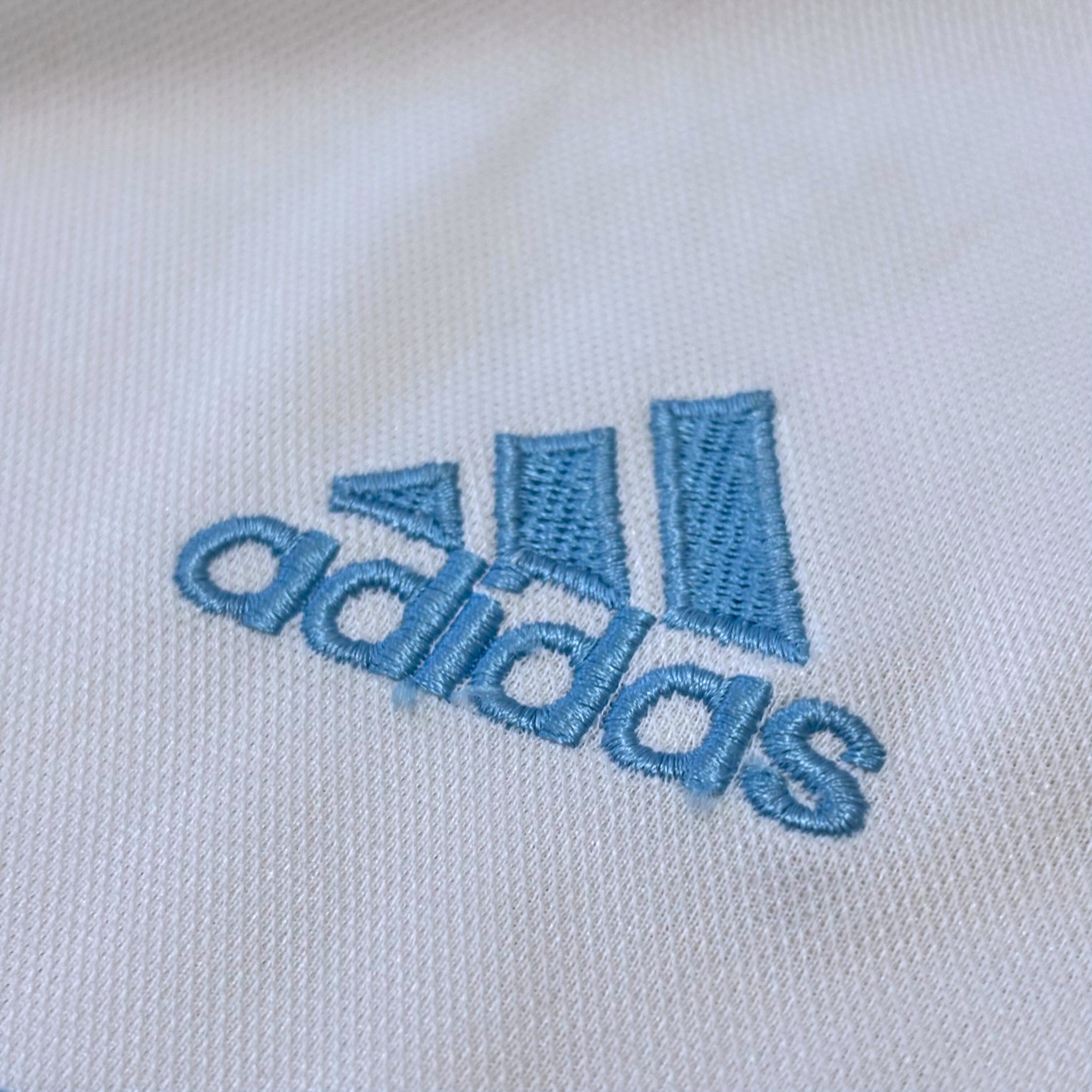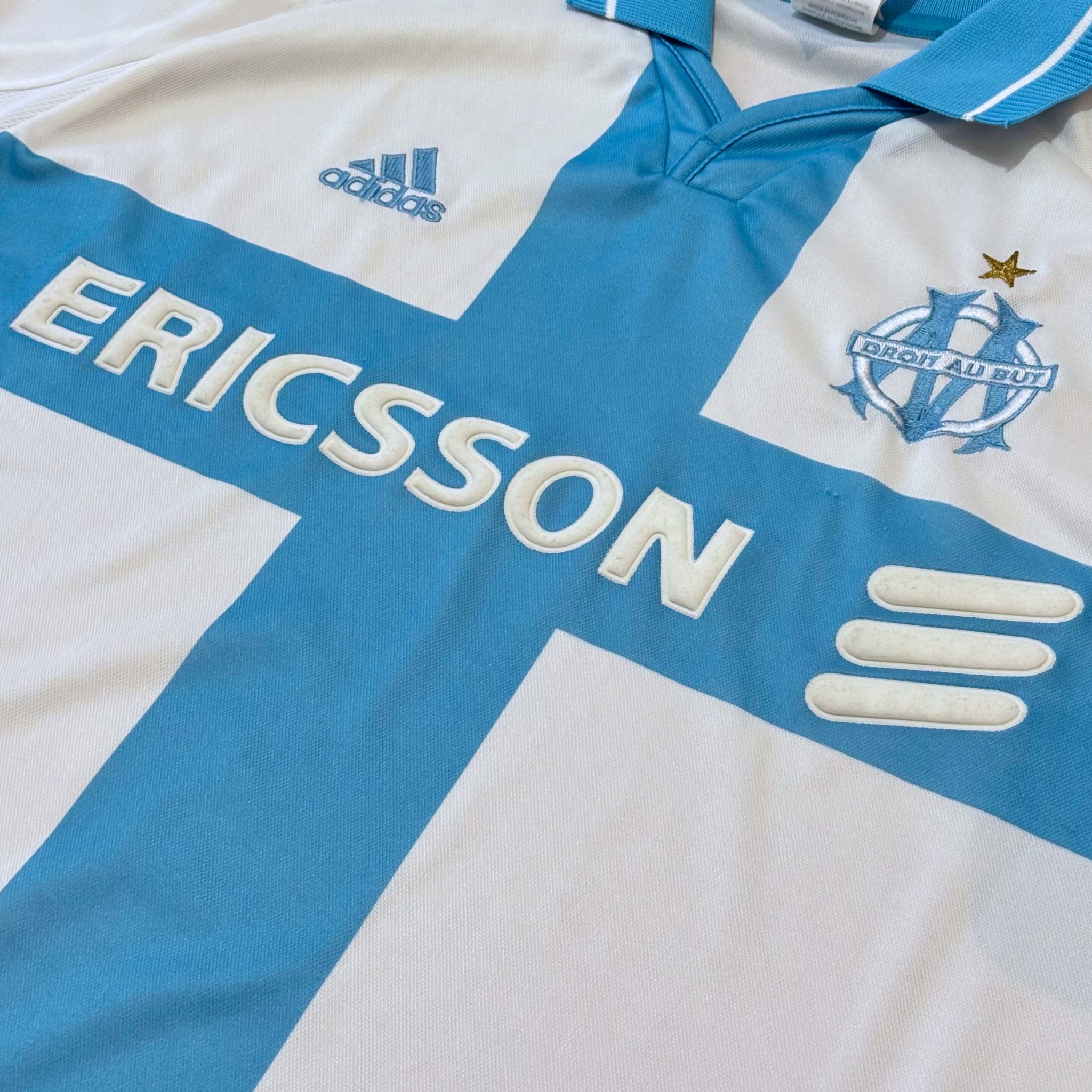Camiseta local de Olympique Marseille 2000/01, fabricada por adidas, en blanco con la icónica cruz celeste en el frontal y sponsor ERICSSON. Temporada en la que Olympique Marseille terminó 15.º en Division 1 y cayó en dieciseisavos tanto de Coupe de France como de Coupe de la Ligue. Fotos enviadas por Gol de Oro Vintage.
