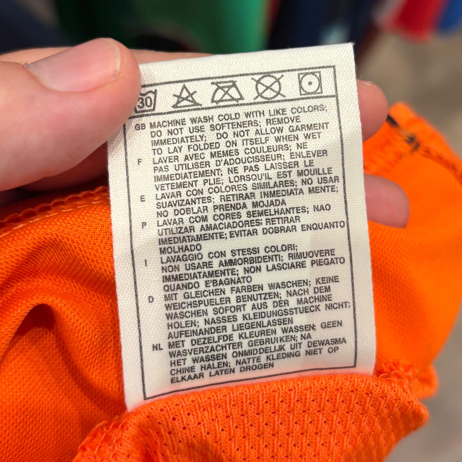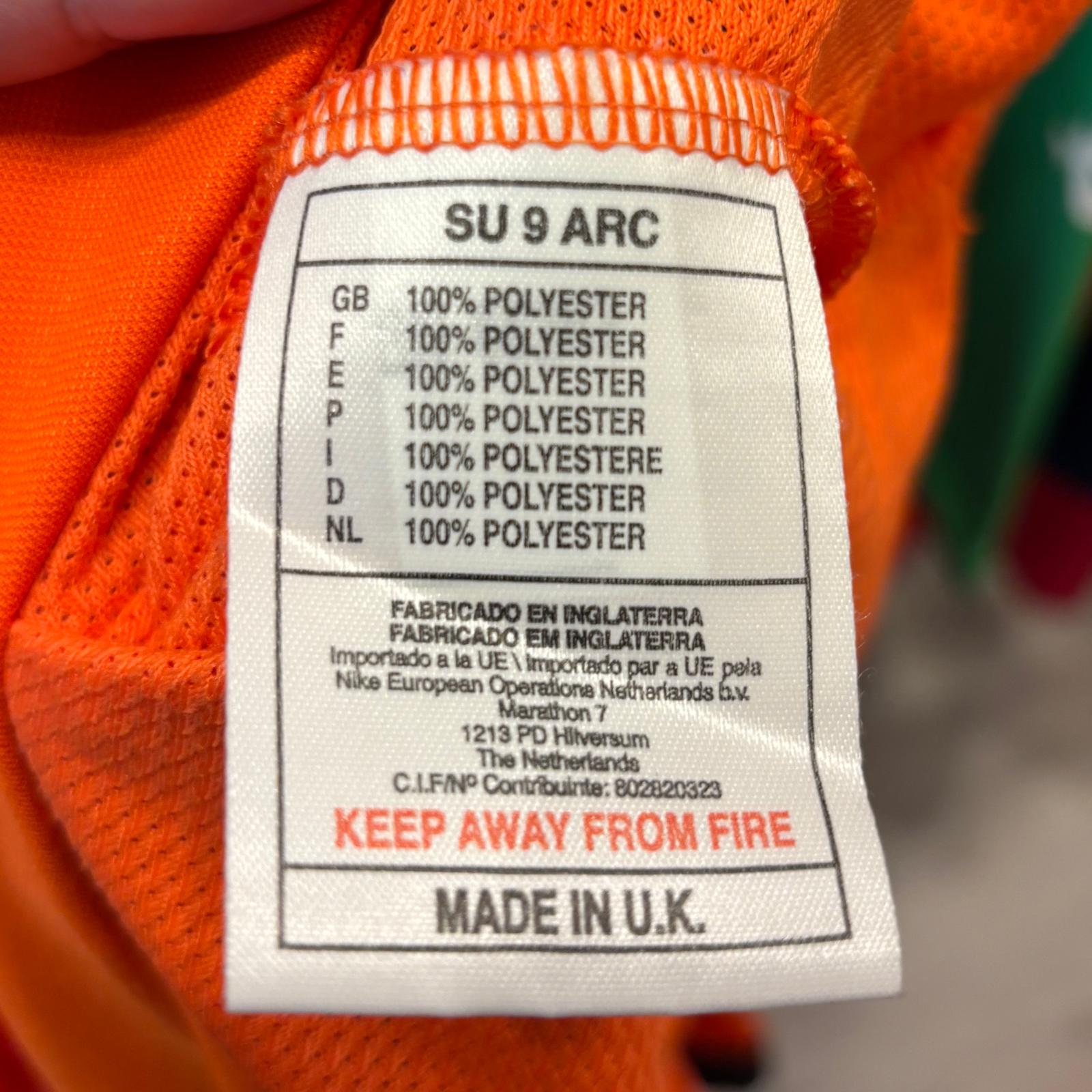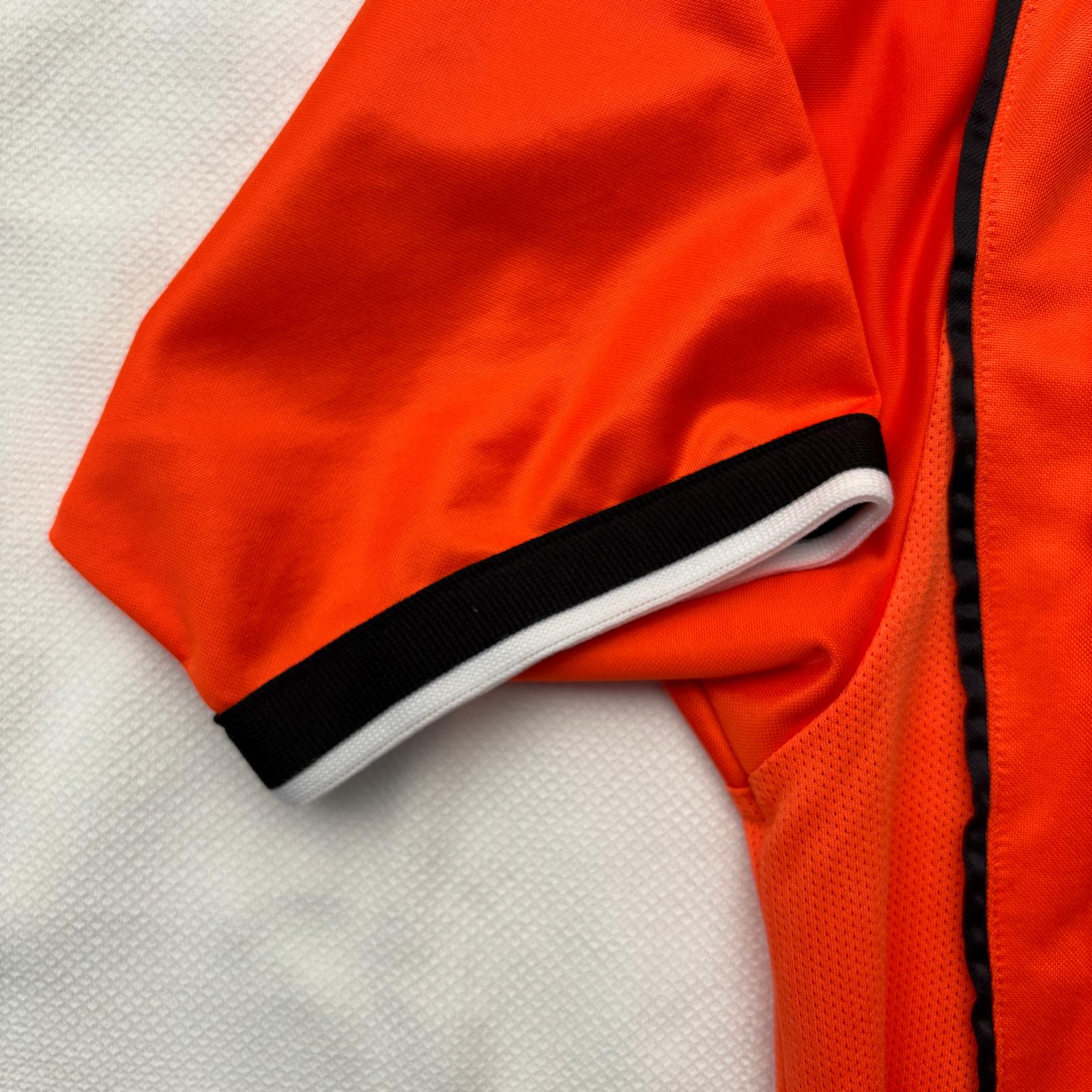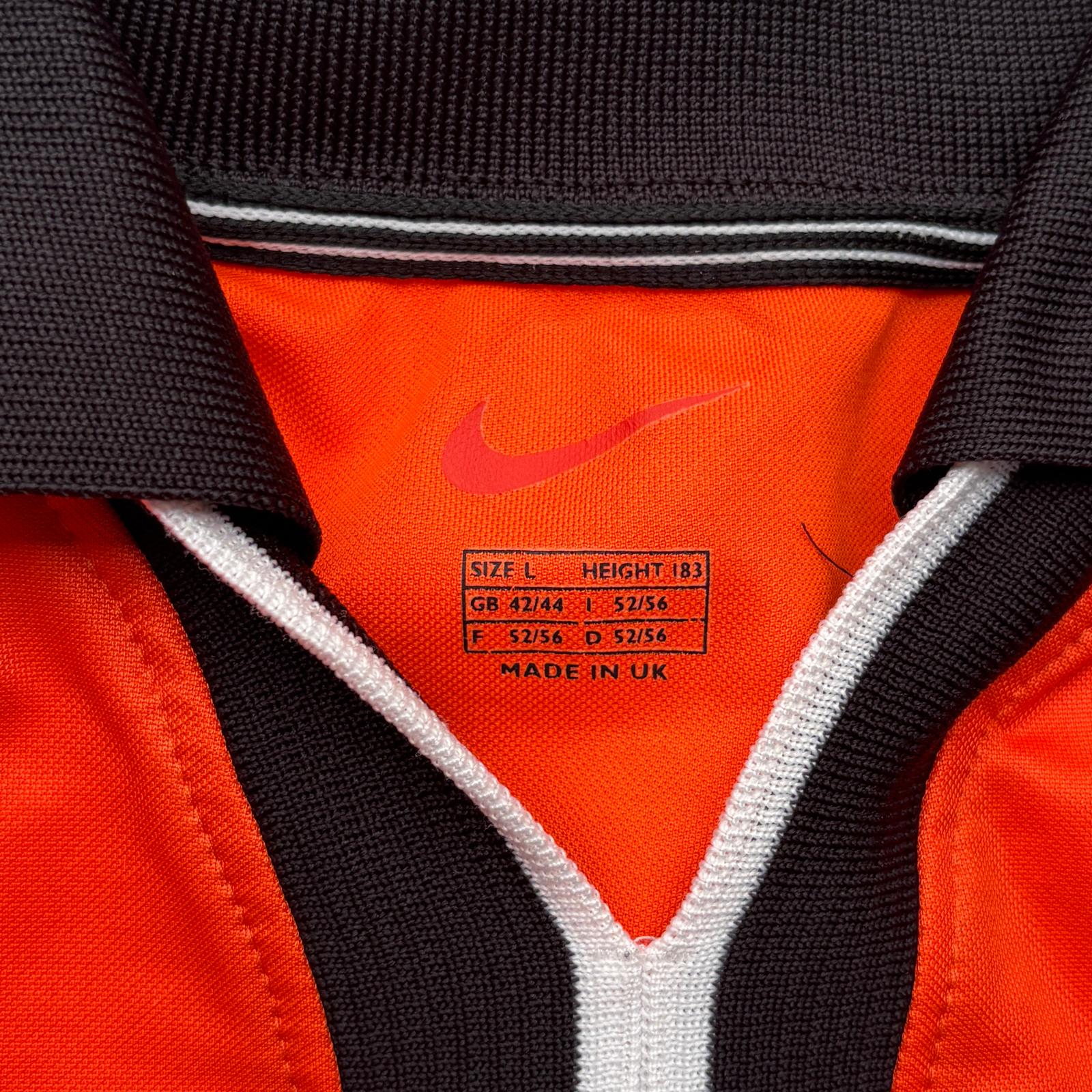 La camiseta local de Países Bajos de 1998 es naranja con detalles negros y cuello tipo polo negro, fabricada por Nike. Fue utilizada en el Mundial de Francia ’98, donde la selección alcanzó las semifinales y finalizó cuarta. ¿Recuerdas el golazo de Bergkamp a Argentina? Fue con esta.