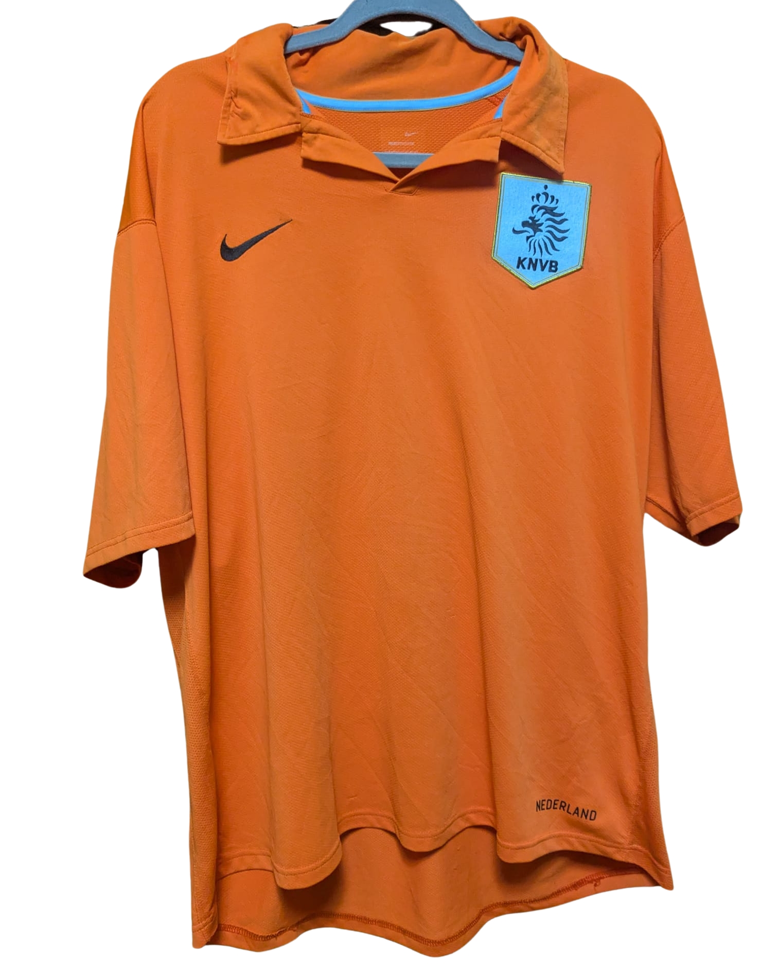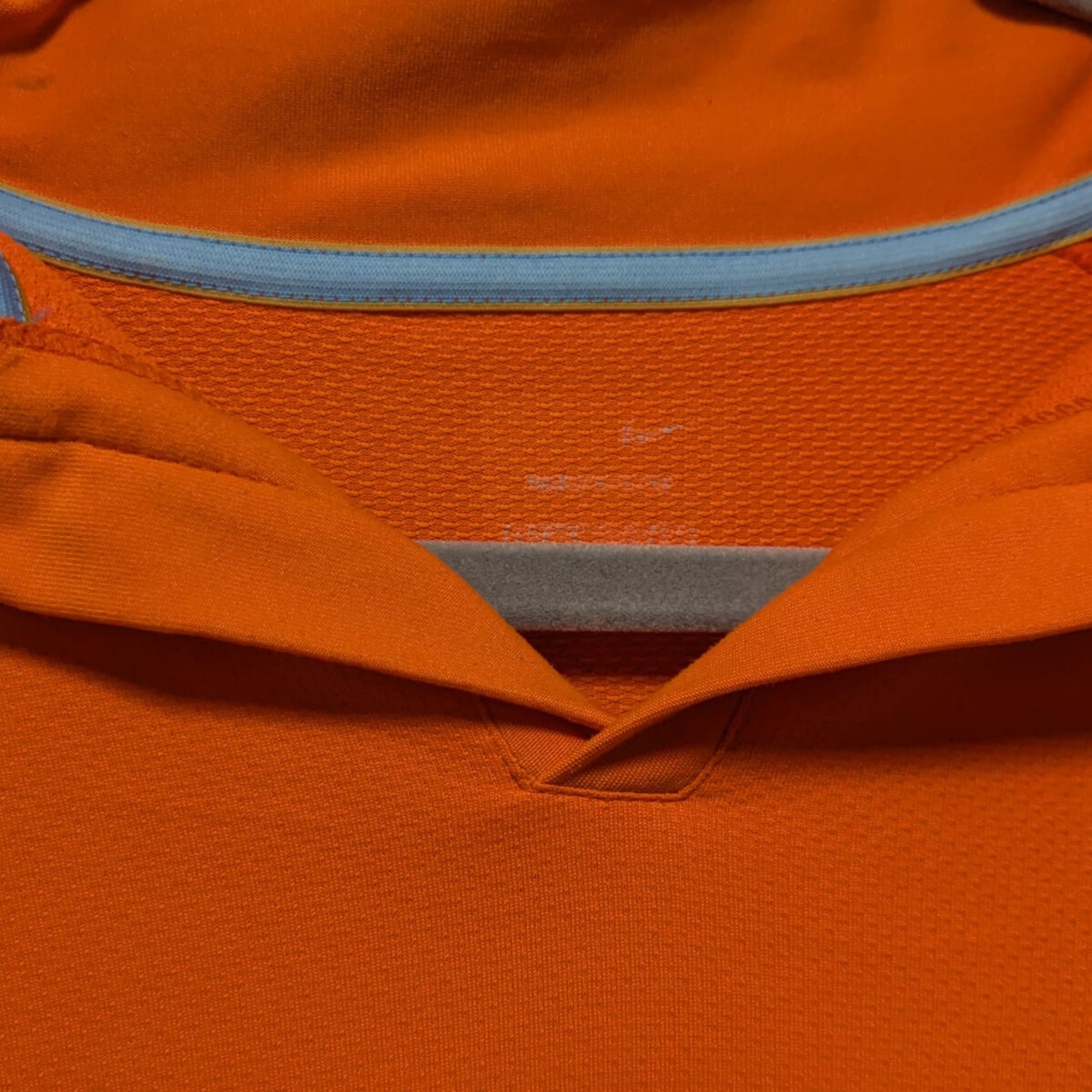 Camiseta local de Países Bajos utilizada en la temporada 2006, diseñada por Nike. Presenta un diseño minimalista en naranja con detalles en azul celeste en el escudo y el cuello. Fue usada durante el Mundial de Alemania 2006, donde la selección neerlandesa alcanzó los octavos de final, siendo eliminada por Portugal (1-0) en un partido conocido como la «Batalla de Núremberg» debido a la cantidad de tarjetas mostradas.
