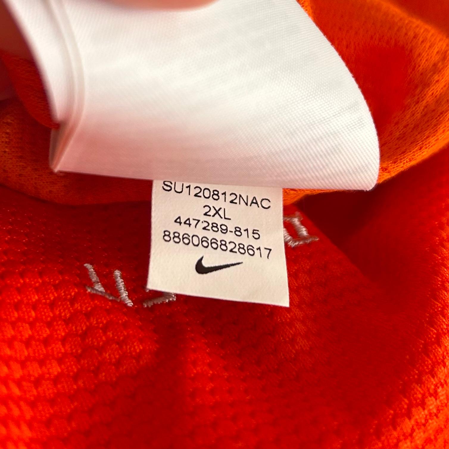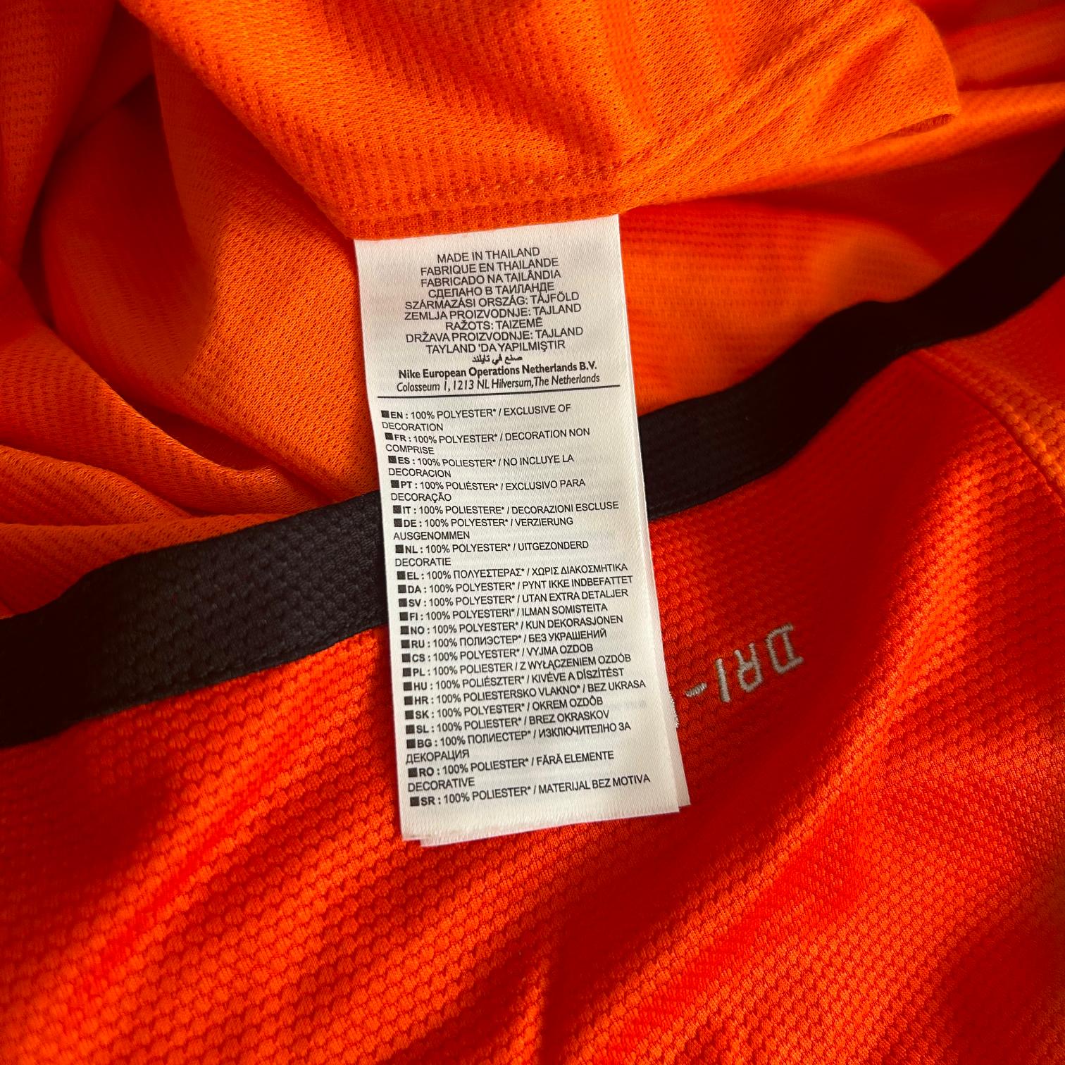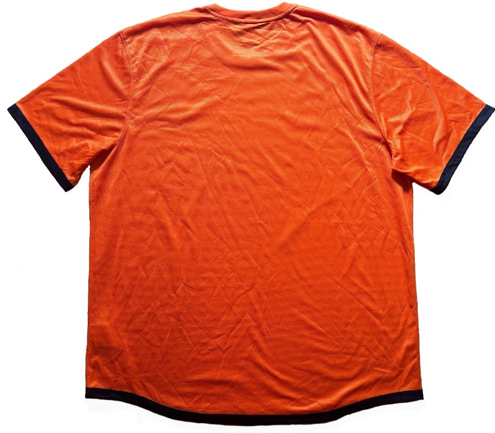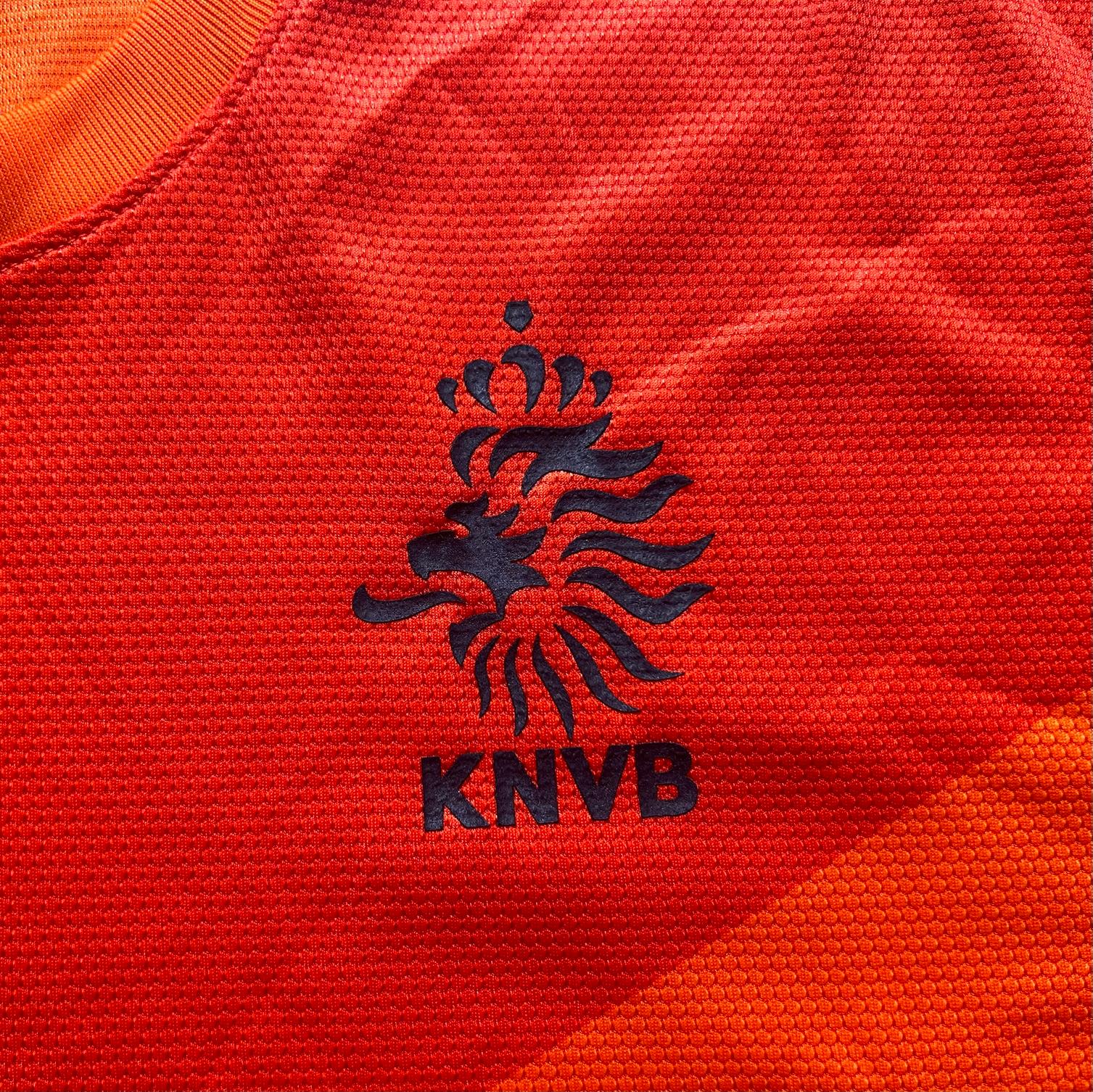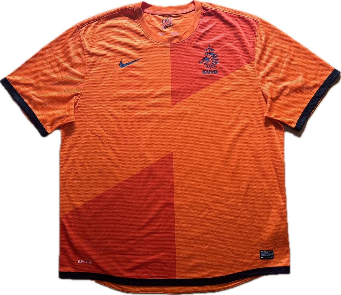 La camiseta local de los Países Bajos 2012-2013, diseñada por Nike, presenta un diseño geométrico en distintas tonalidades de naranja, el color tradicional del equipo. Utilizada durante la Eurocopa 2012, esta equipación fue testigo de una campaña decepcionante para la selección, que no logró superar la fase de grupos tras caer ante Dinamarca, Alemania y Portugal.