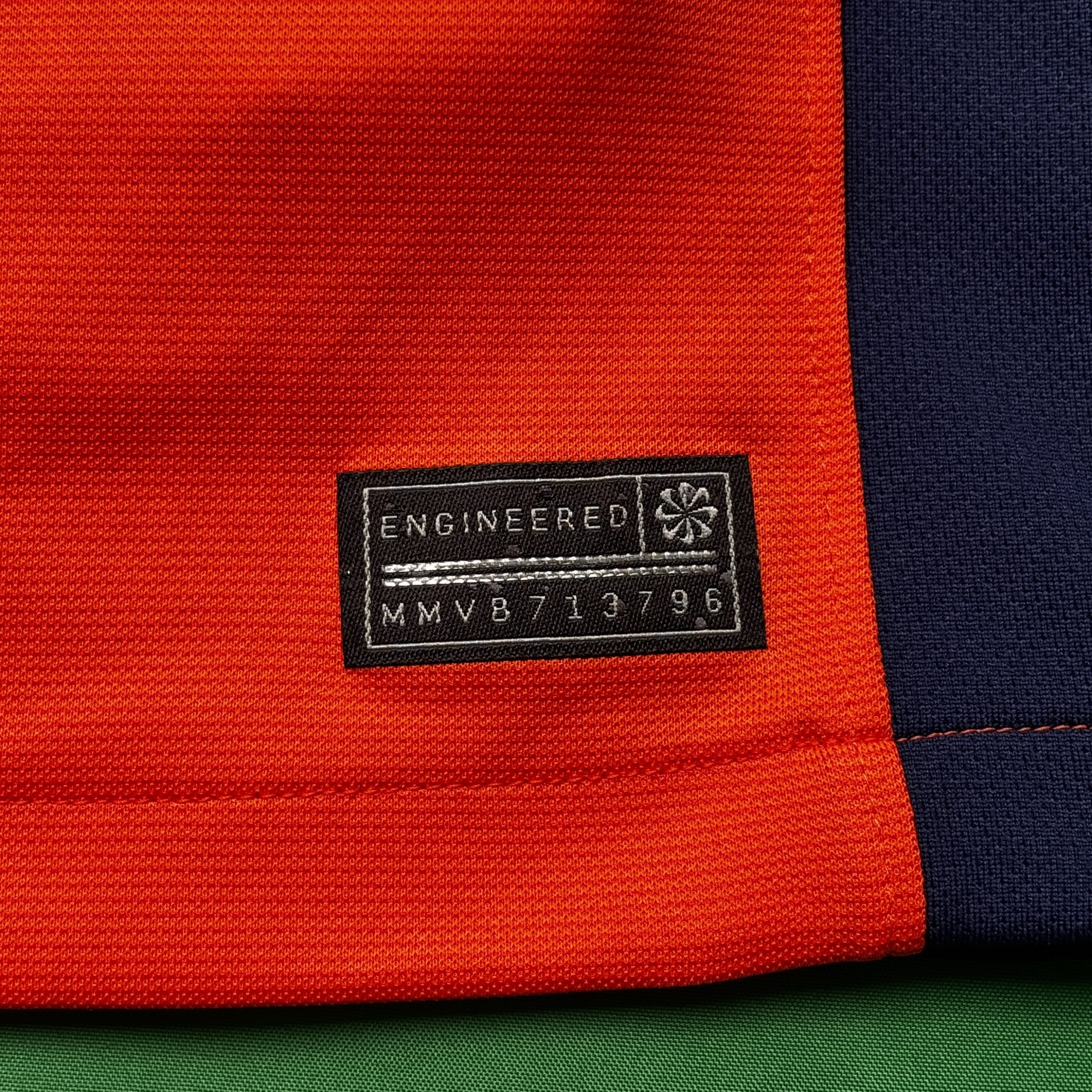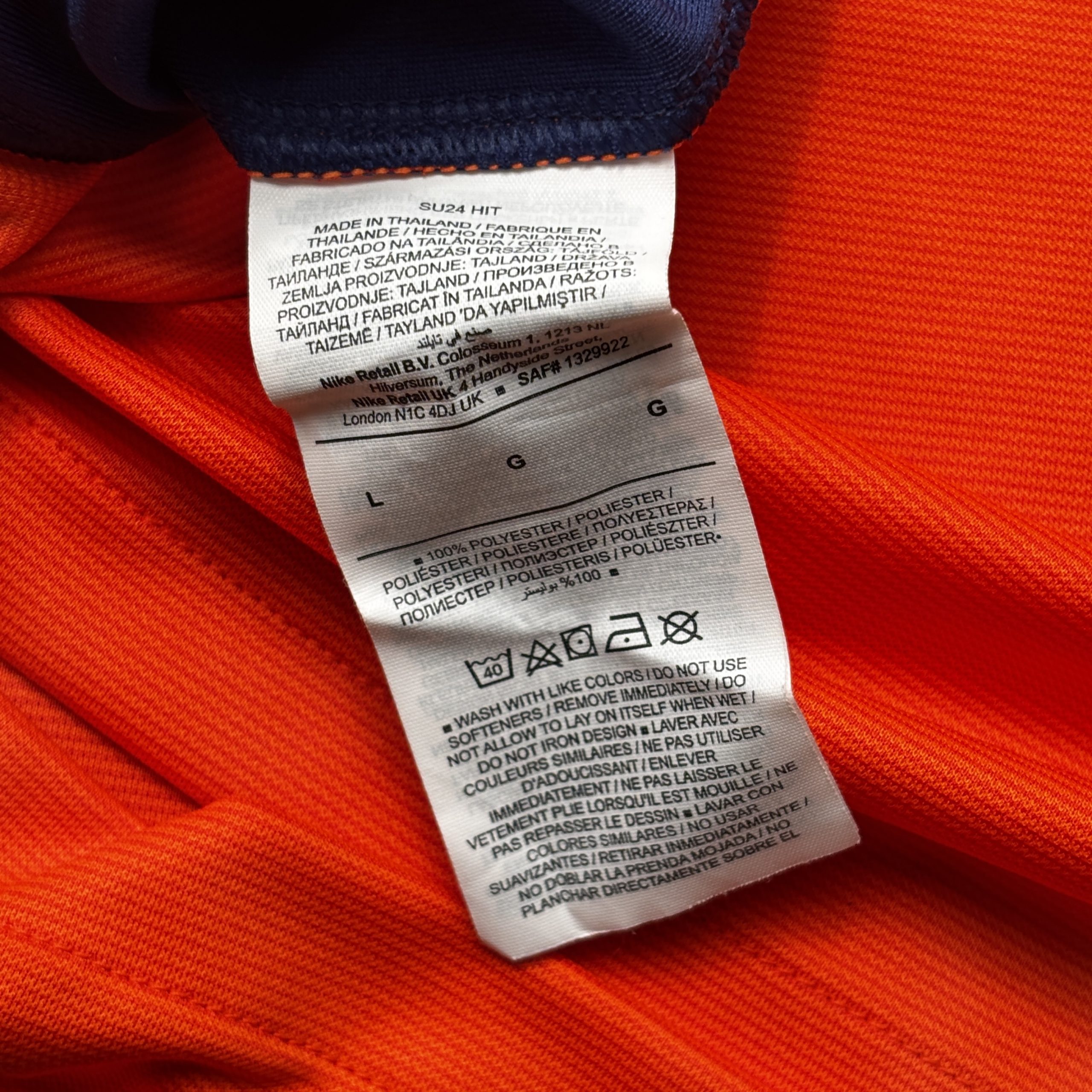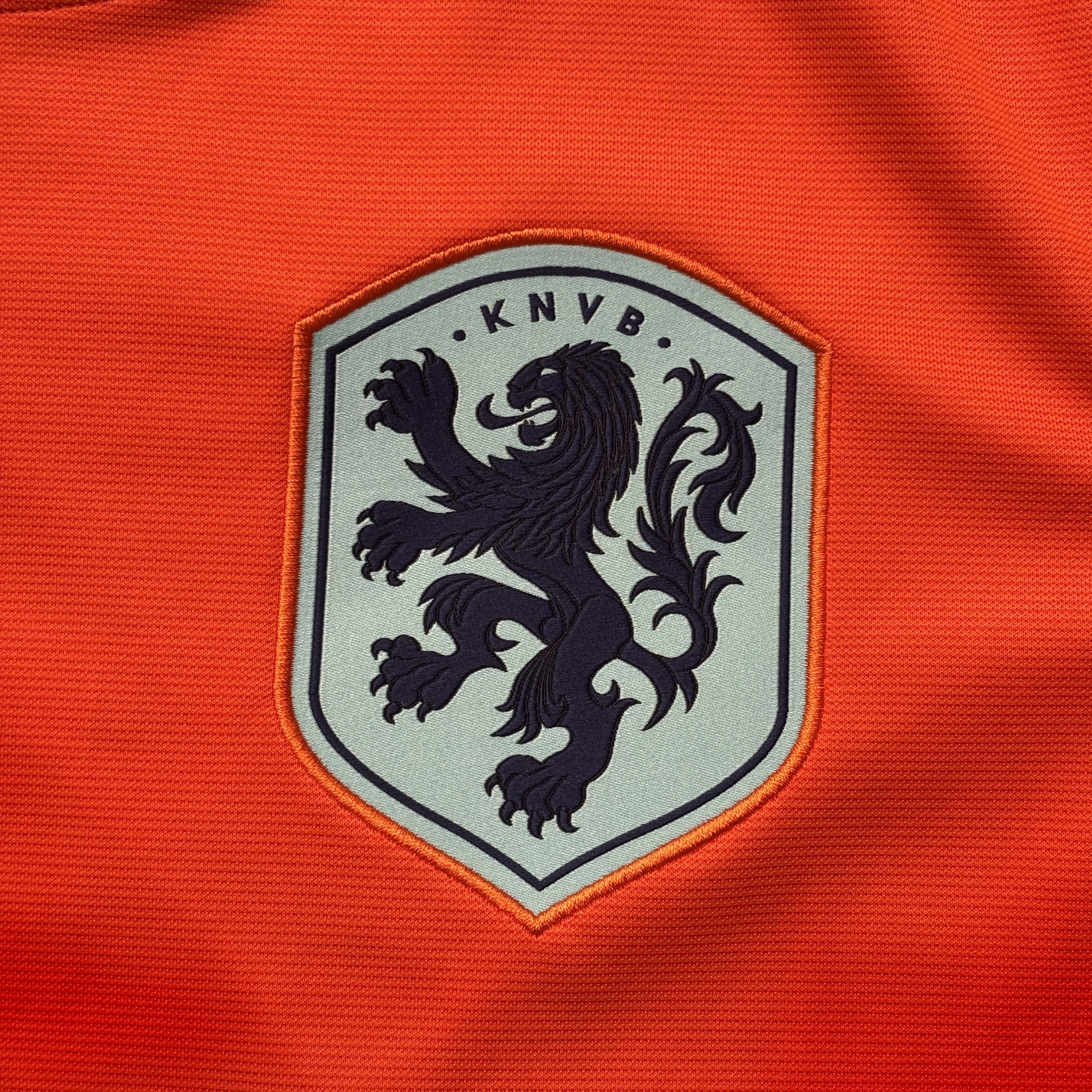 Los Países Bajos estrenaron en 2024 esta camiseta local de Nike, naranja con detalles en azul oscuro. En la Eurocopa 2024 avanzaron como terceros del Grupo D, superaron a Rumanía en octavos y a Turquía en cuartos, y fueron eliminados en semifinales por Inglaterra.