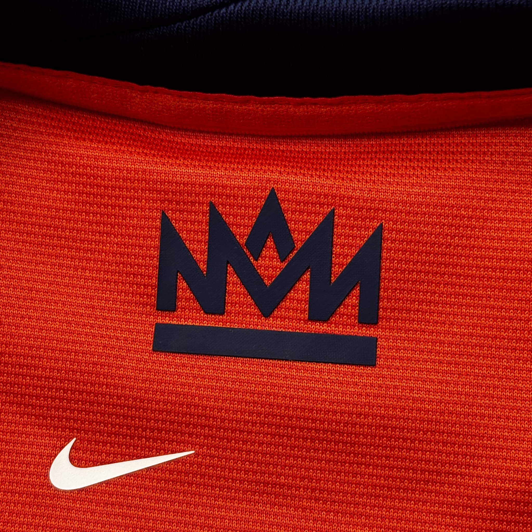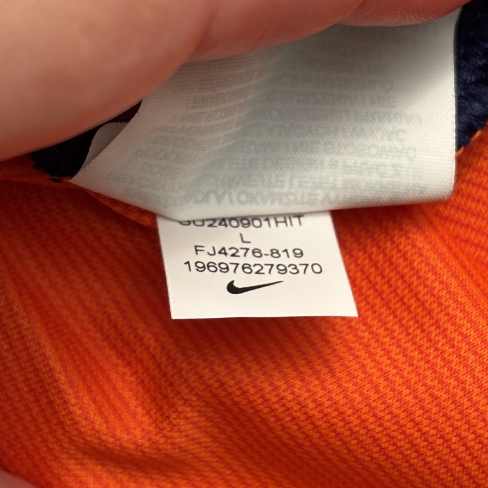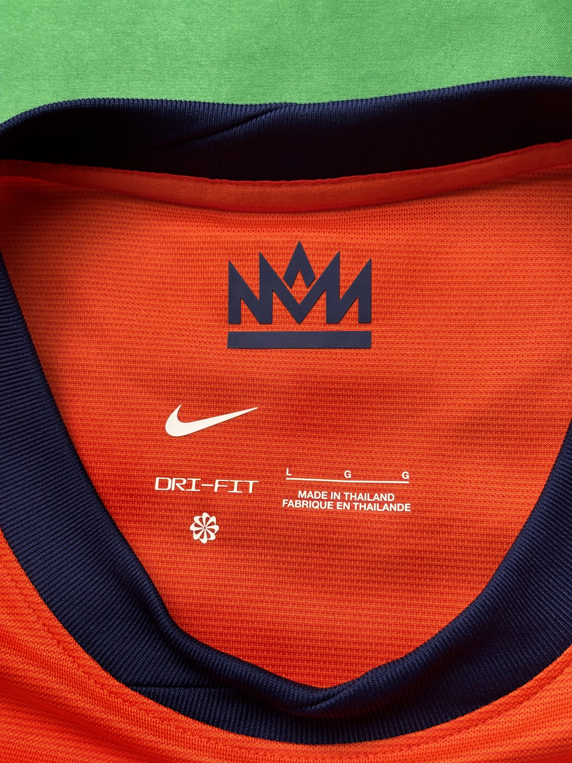 Los Países Bajos estrenaron en 2024 esta camiseta local de Nike, naranja con detalles en azul oscuro. En la Eurocopa 2024 avanzaron como terceros del Grupo D, superaron a Rumanía en octavos y a Turquía en cuartos, y fueron eliminados en semifinales por Inglaterra.