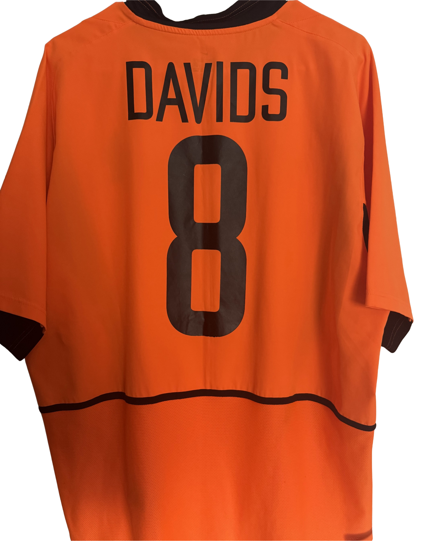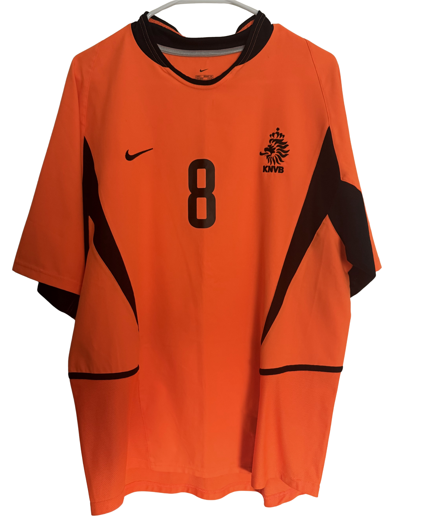 La primera equipación de Países Bajos de 2002, de la marca Nike, es de color naranja con paneles negros en los costados y el cuello redondo. Países Bajos no se clasificó para la Copa Mundial de la FIFA 2002, y la utilizó en la fase de clasificación a la Euro 2004, que fue exitosa al ganar el playoff a Escocia.